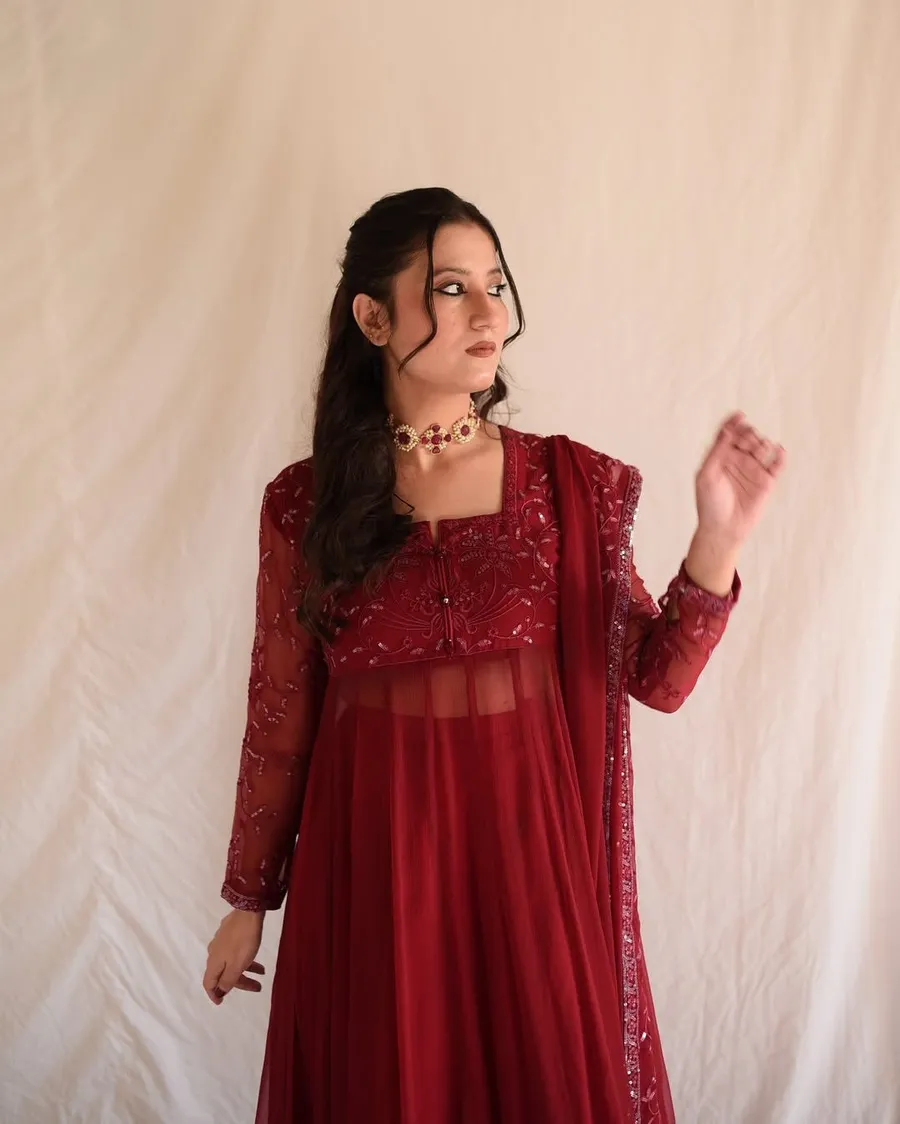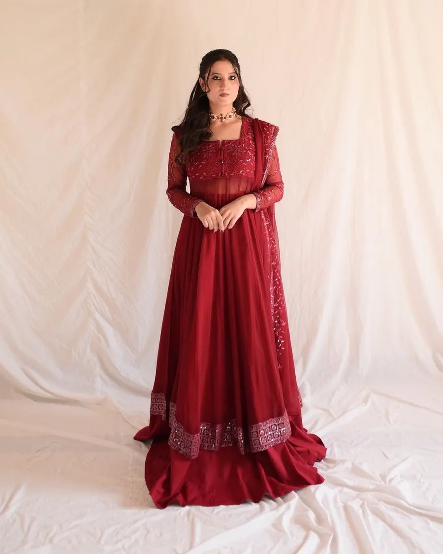 MODERN FAUX BLOOMING SEQUENCE + ZARI EMBROIDERY WORK ANARKALI PALAZZO WITH DUPATTA RED