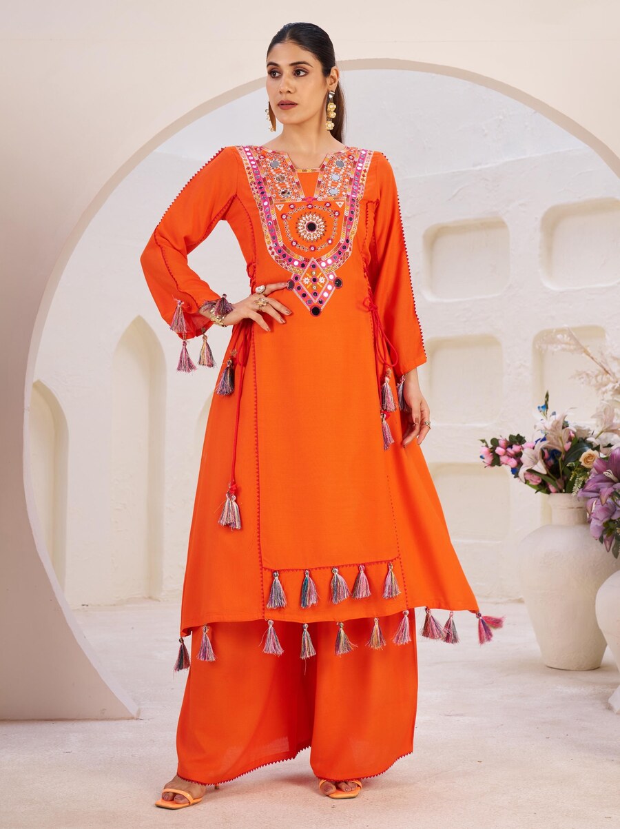CO-ORD SET : TOP : FABRIC : RAYON SILK WORK : EMBROIDERY WORK LENGTH : 32” INCH SIZE : M:38", L:40”, XL:42”, XXL:44” BOTTOM : FABRIC : RAYON SILK LENGTH : 38" INCH