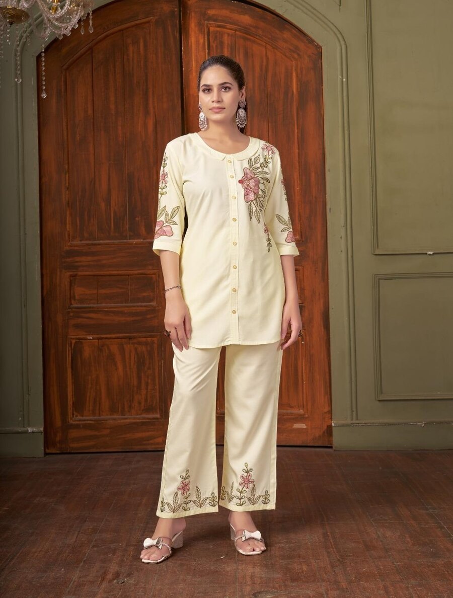 CO-ORD SET : FABRIC :- HEAVY RAYON WORK :- MULTI EMBROIDERY THREAD WORK SIZE :- M(38), L(40), XL(42), 2XL(44), 3XL(46) LENGTH :- 31 INCH SLEEVE LENGTH :- 16 INCH PANT (STITCHED) : FABRIC :- HEAVY RAYON ...