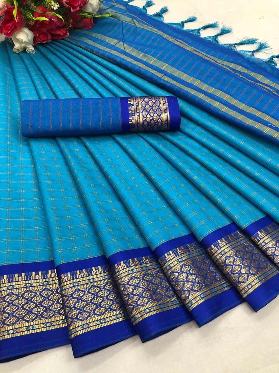 SAREE WITH UNSTITCHED BLOUSE Cotton silk saree NEW ARRIVAL SOFT COTTON JACQUARD PALLU SAREE WITH UNSTITCHED BLOUSE SKYFabric: Premium Soft Cotton Silk with broad border with running blouse contrast jacquard border Length: 5.50 Meter + unstitched blouse ₹629.00Add to cart EG27122