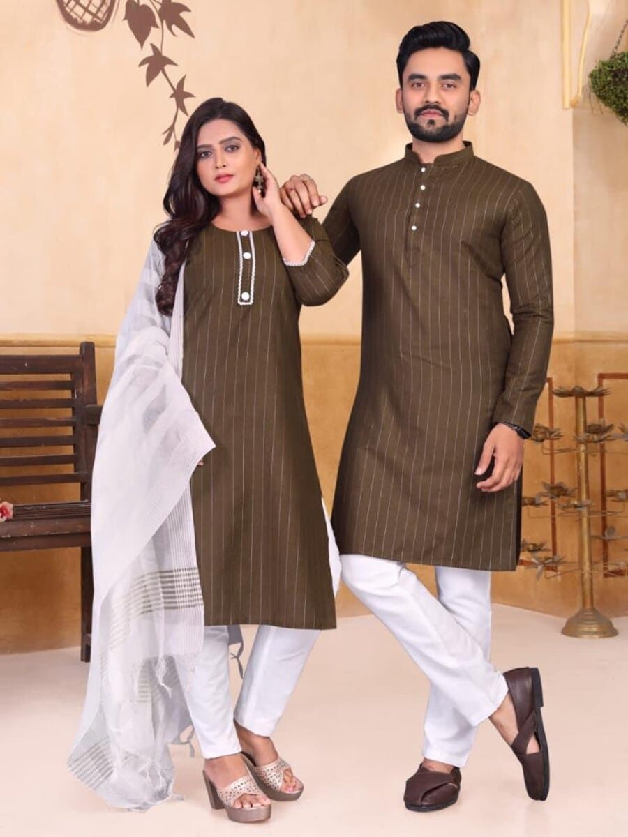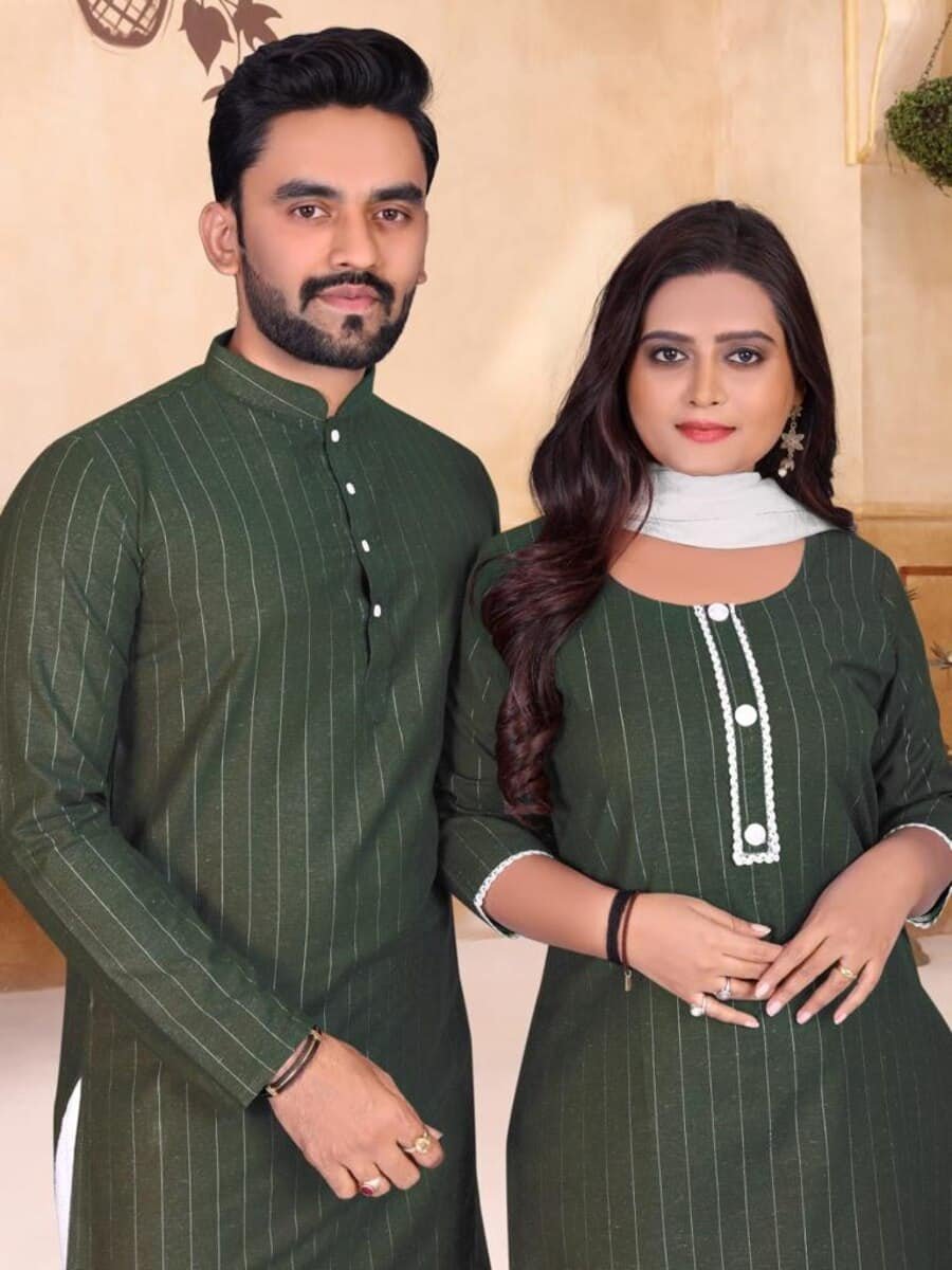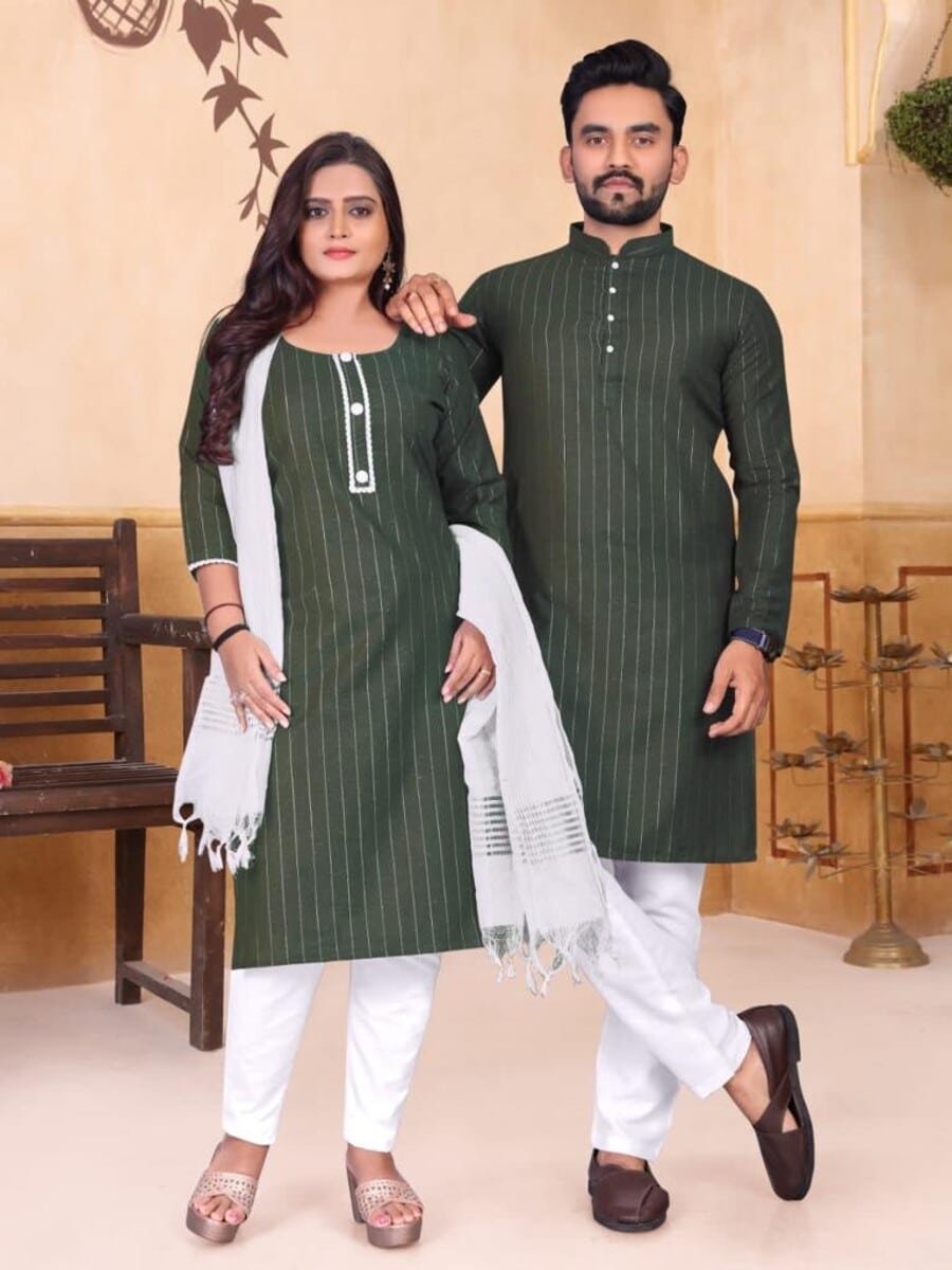 DESIGNER COTOTN SILVAR WEAVING WORK COUPLE WEAR COMBO OLIVE