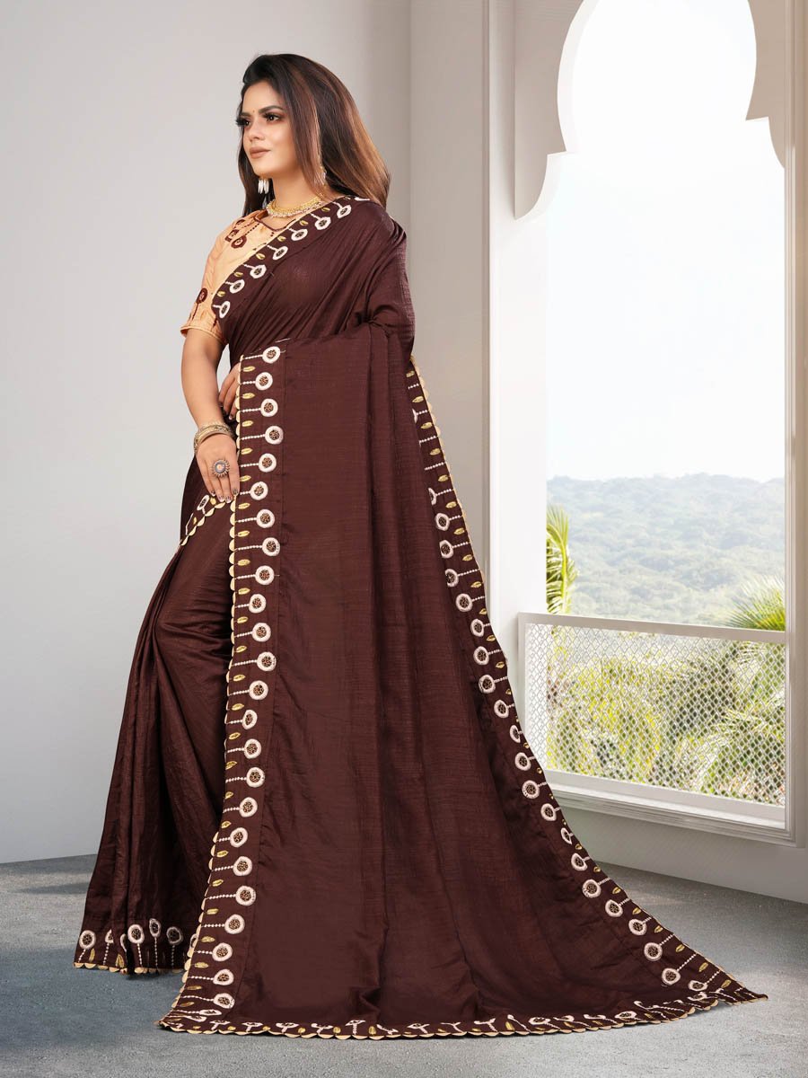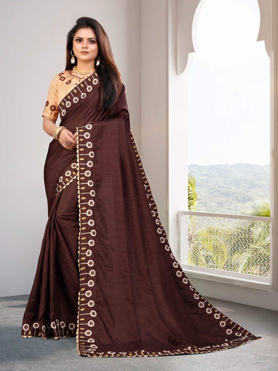 PARTY WEAR DOLA SILK EMBROIDERY WORK SAREE WITH UNSTITCHED BLOUSE BROWN