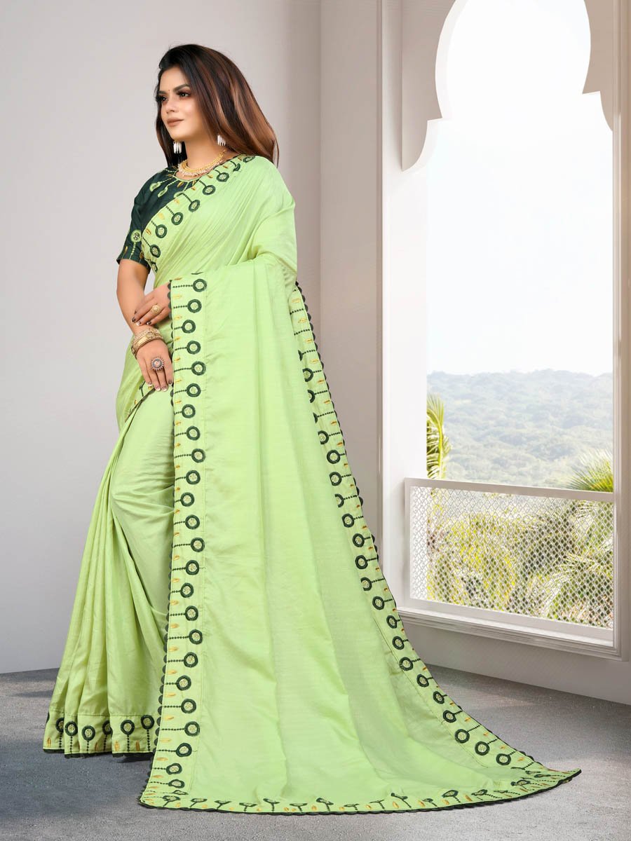 PARTY WEAR DOLA SILK EMBROIDERY WORK SAREE WITH UNSTITCHED BLOUSE LIGHT GREEN