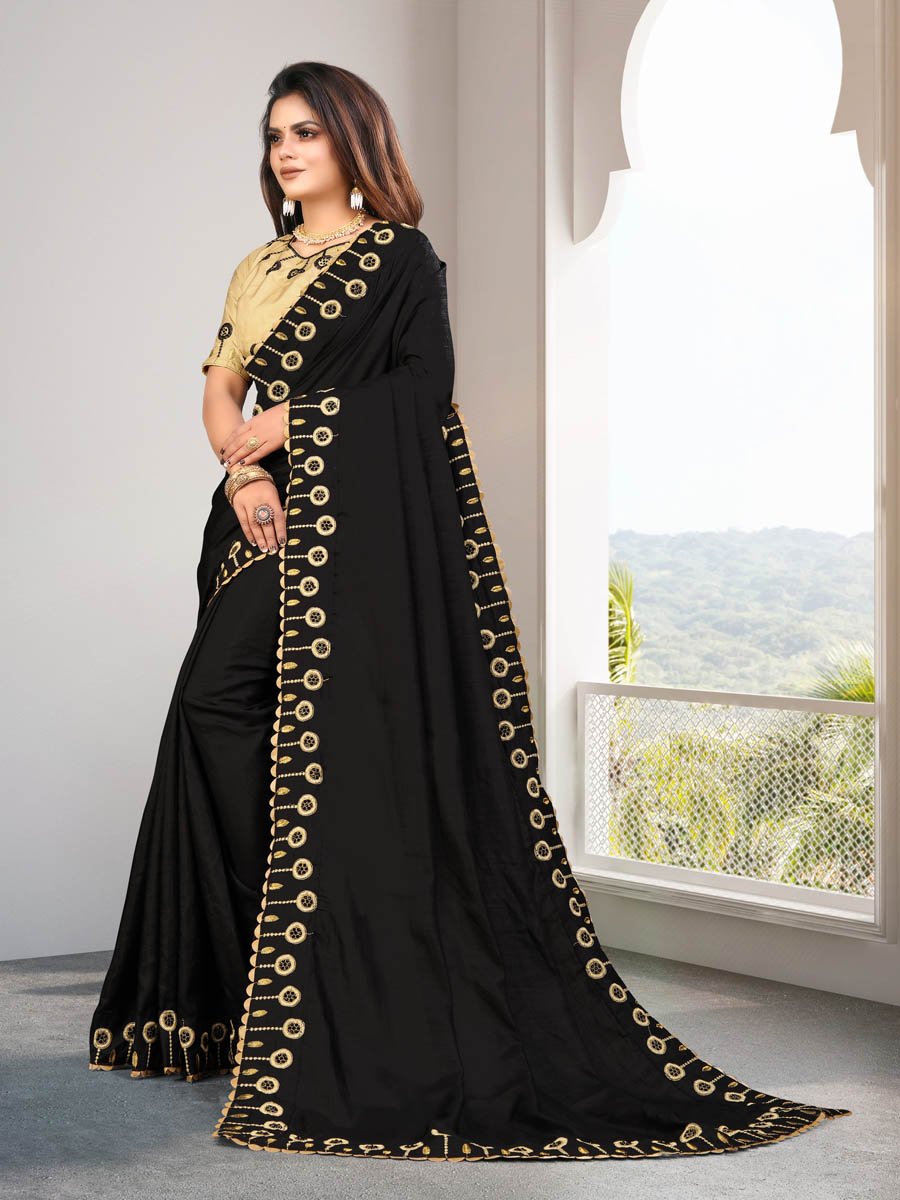 PARTY WEAR DOLA SILK EMBROIDERY WORK SAREE WITH UNSTITCHED BLOUSE BLACK