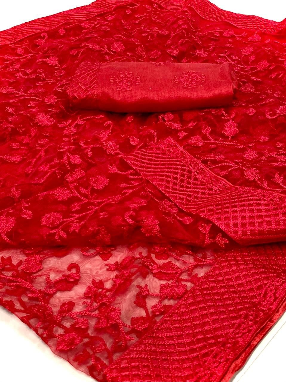 DESIGNER SUPER NET EMBROIDERY WORK SAREE WITH UNSTITCHED BLOUSE RED
