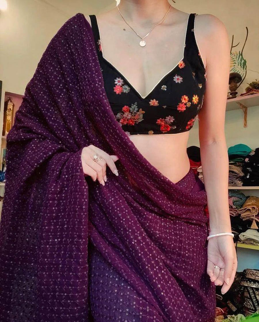 FANCY SOFT SILK SAREE UNSTITCHED BLOUSE GEORGETTE AND EMBROIDERY WORK PURPLE