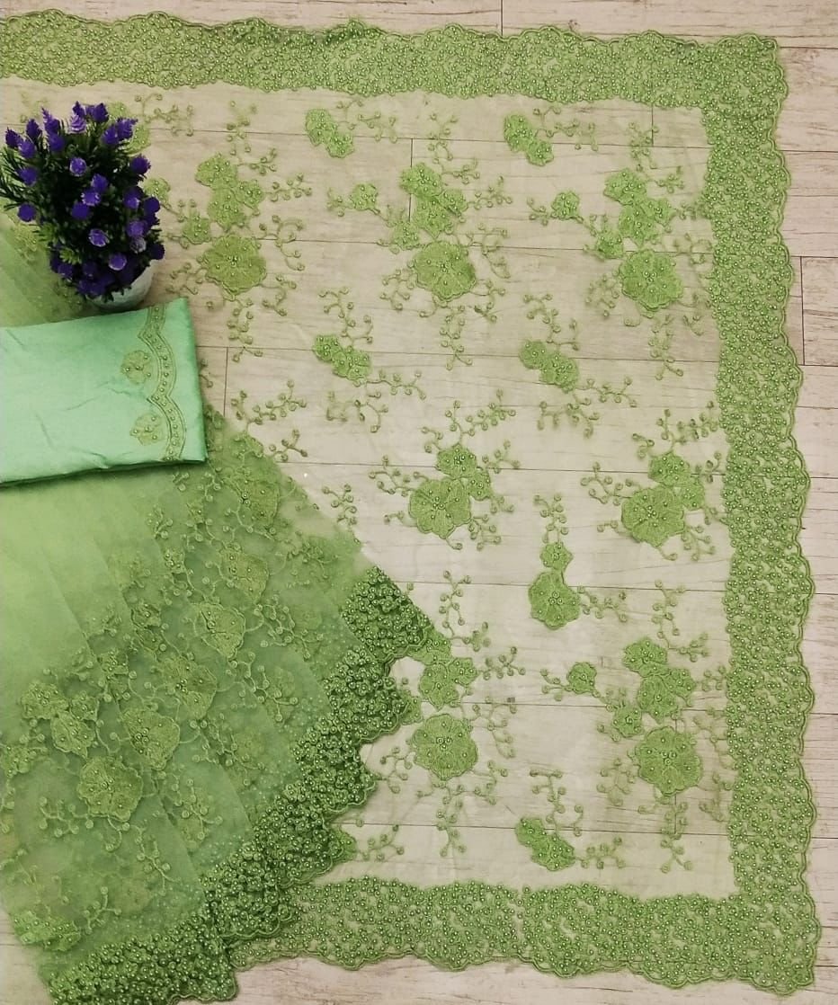 SAREE FABRICS: SUPERNET FULL EMBROIDERY WORK BLOUSE FABRICS: BANGLORY 5.5 METER SAREE + UNSTITCHED BLOUSE