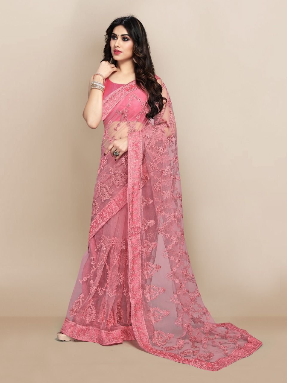 DESIGNER SUPER NET EMBROIDERY WORK SAREE WITH UNSTITCHED BLOUSE PINK