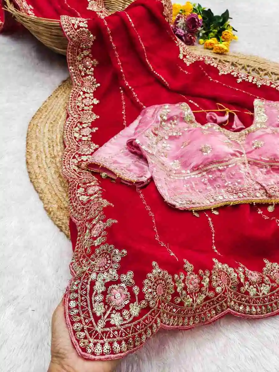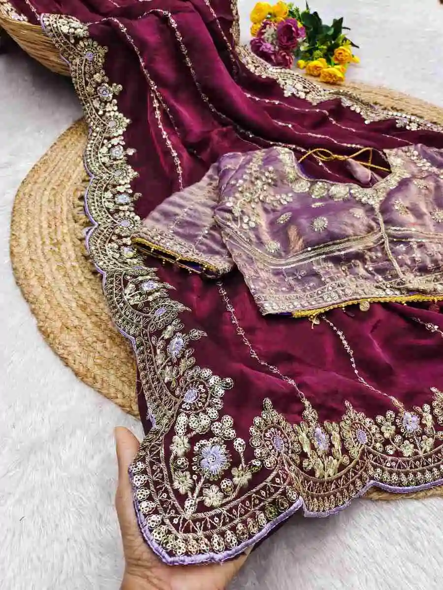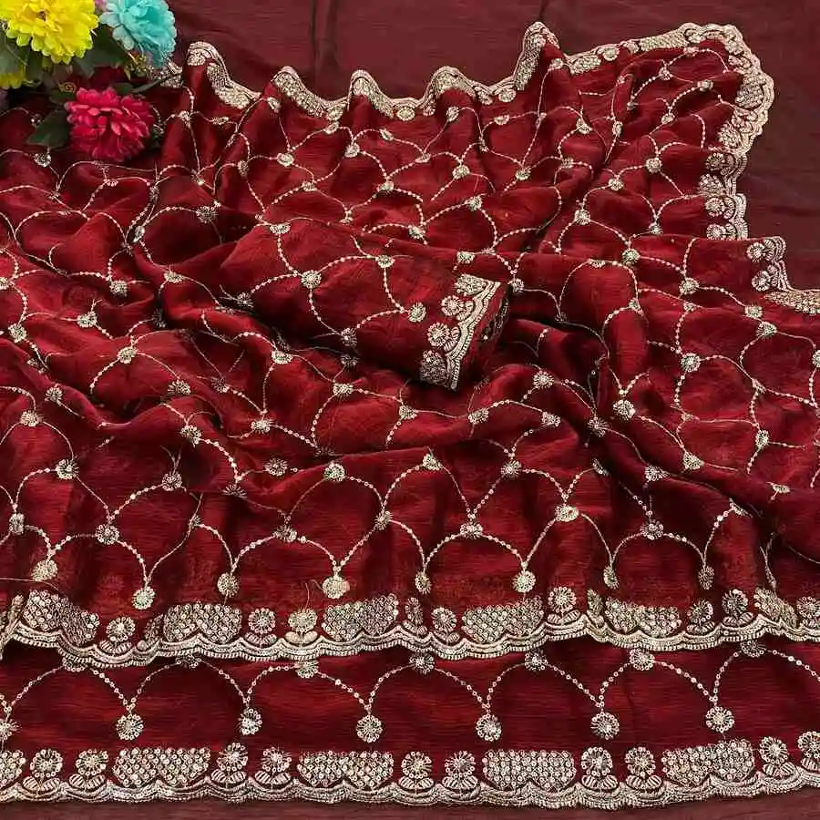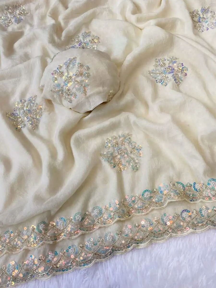 SAREE : FABRIC : SOFT SPACE SILK WORK : SEQUENCE EMBROIDERY WORK LENGTH : 5.5 METER BLOUSE : FABRIC : SPACE SILK WORK : SEQUENCE EMBROIDERY WORK LENGTH : 0.80 METER SAREE + UNSTITCHED BLOUSE