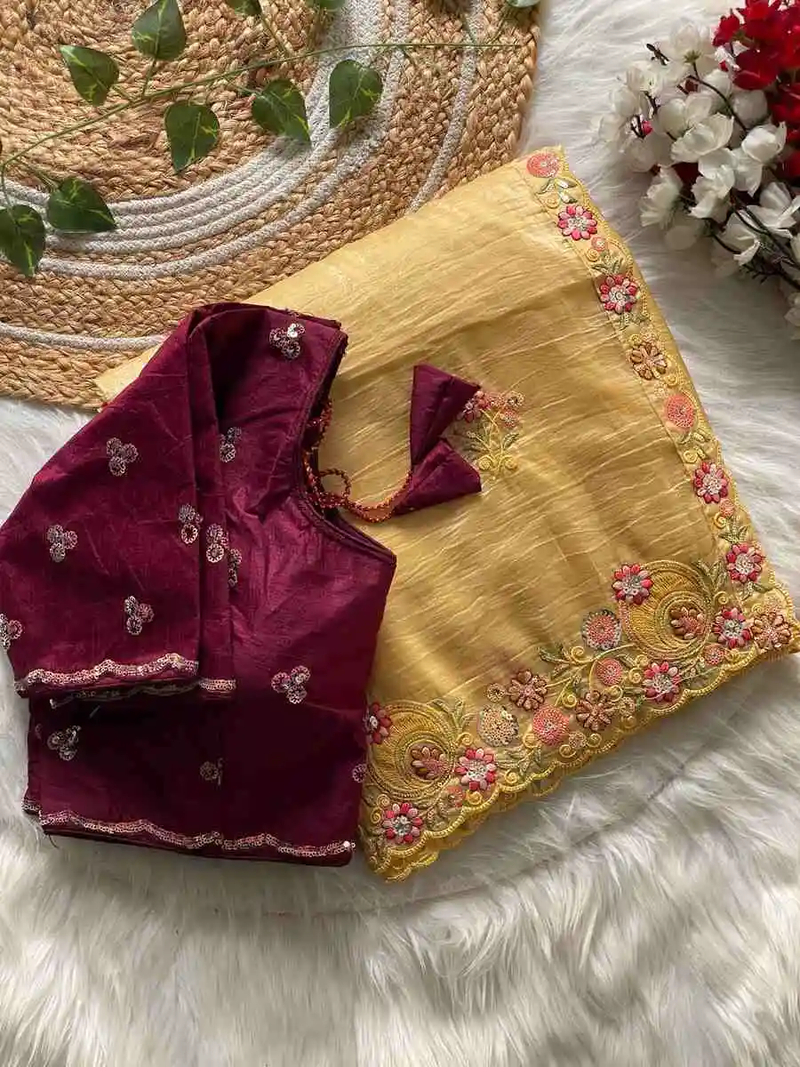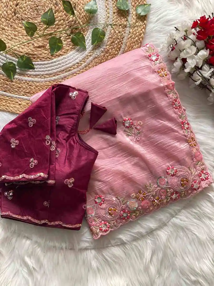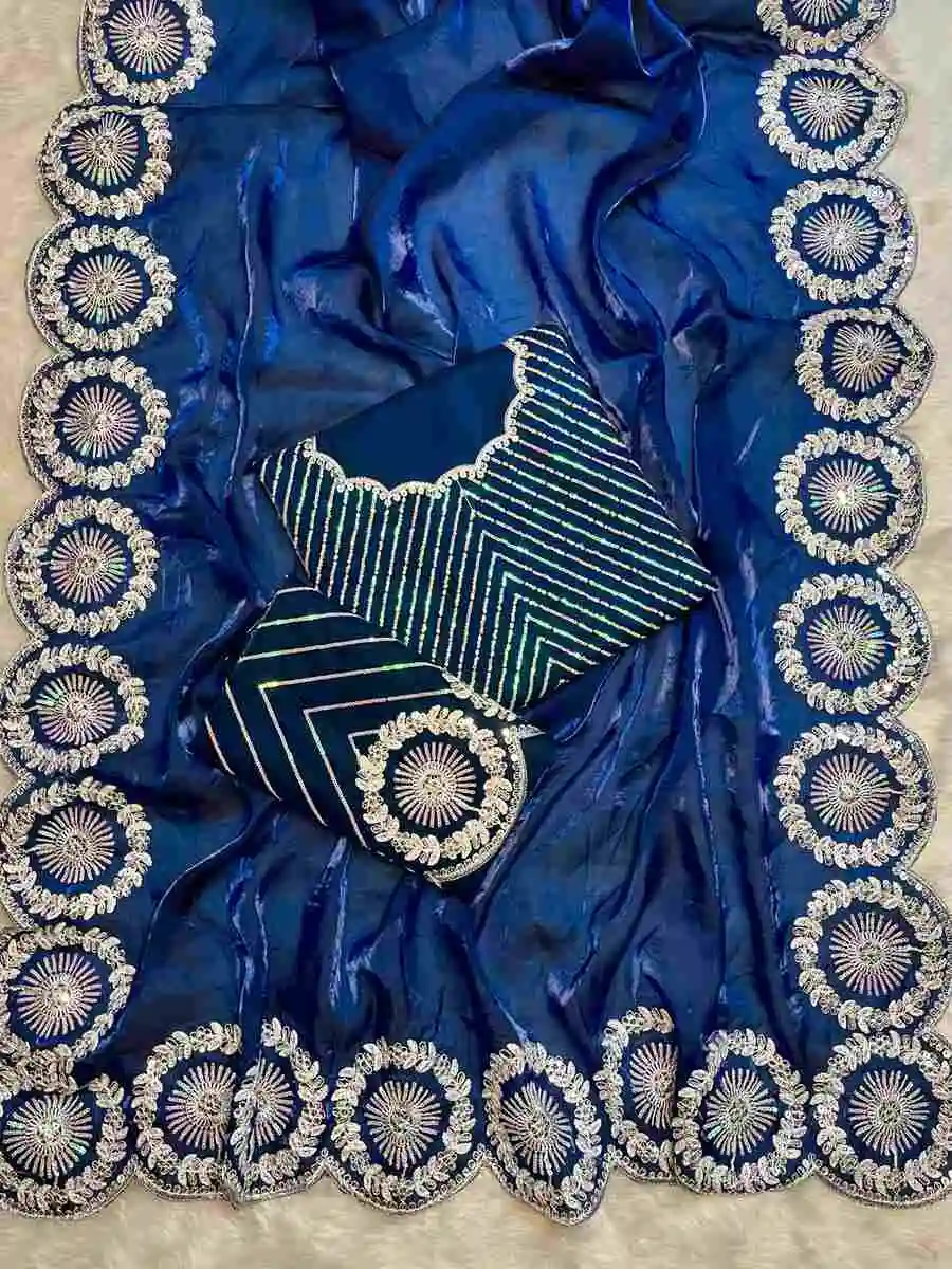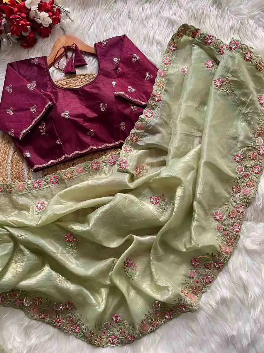 SAREE : FABRIC : PURE SOFT JIMMY CHOO CHIFFON SILK WORK : ZARI WORK WITH CONTRAST PALLU WORK BORDER & SAREE LENGTH : 5.5 METER BLOUSE : FABRIC : RUNNING FABRIC WORK : EMBROIDERY WORK LENGTH ...
