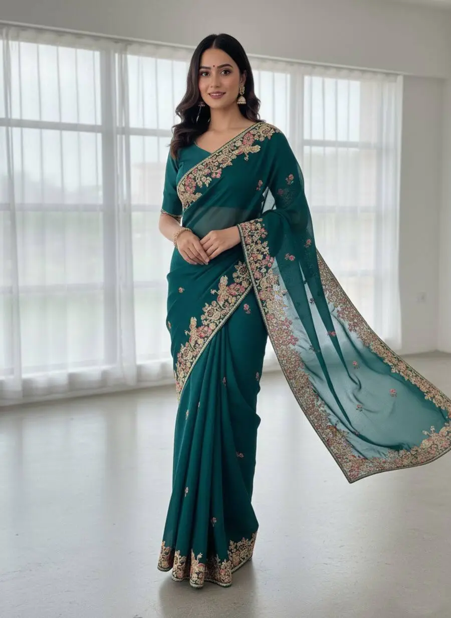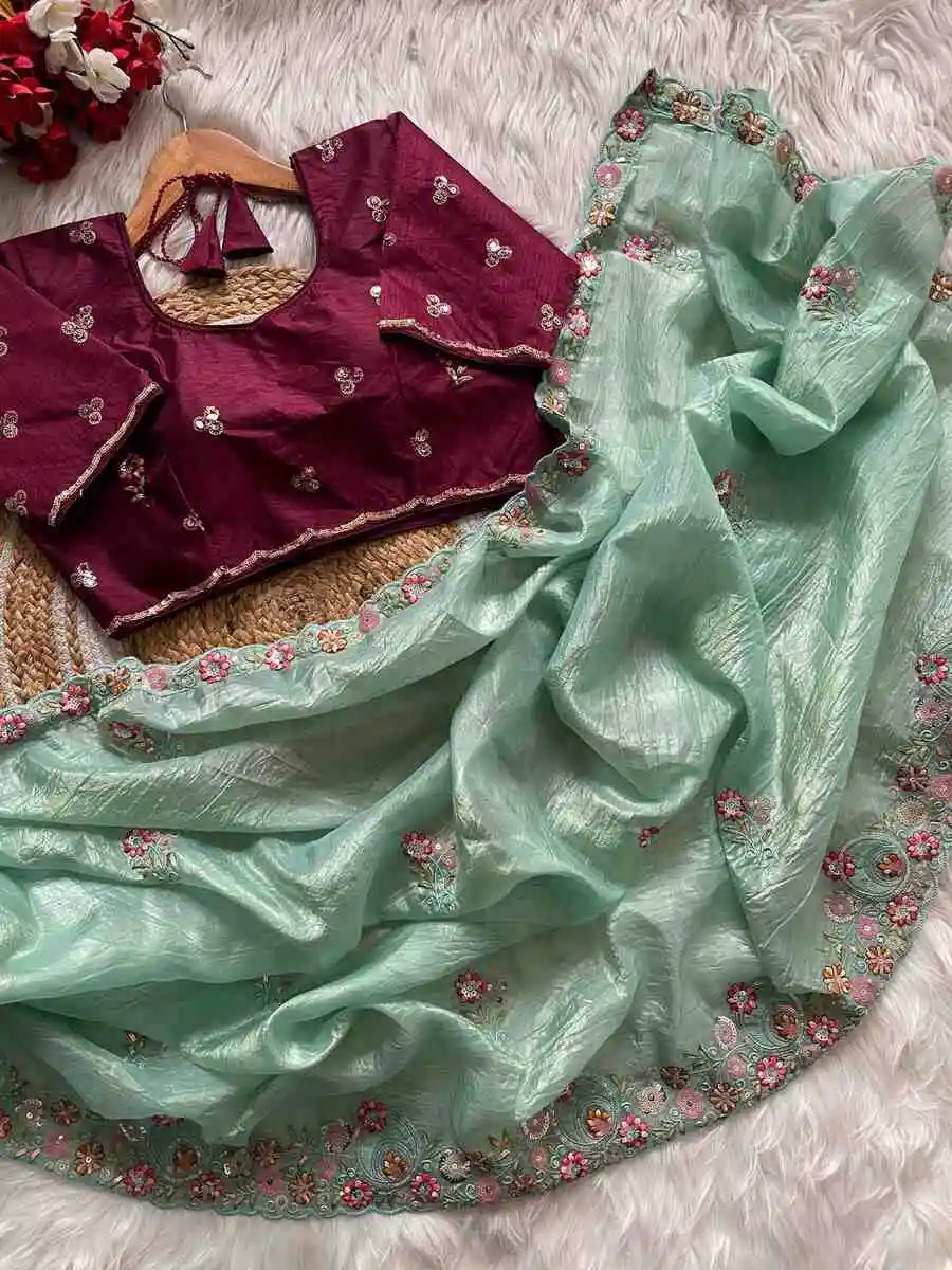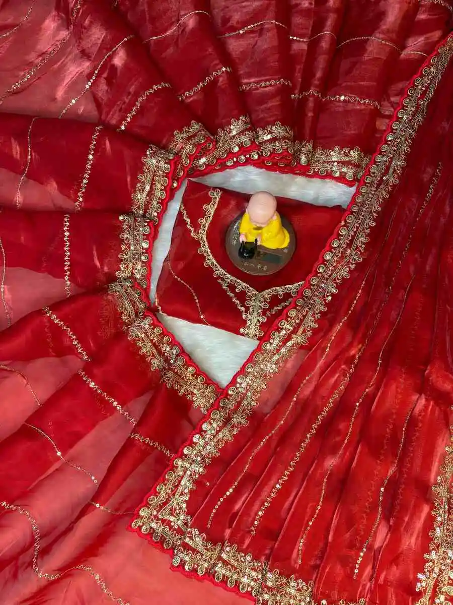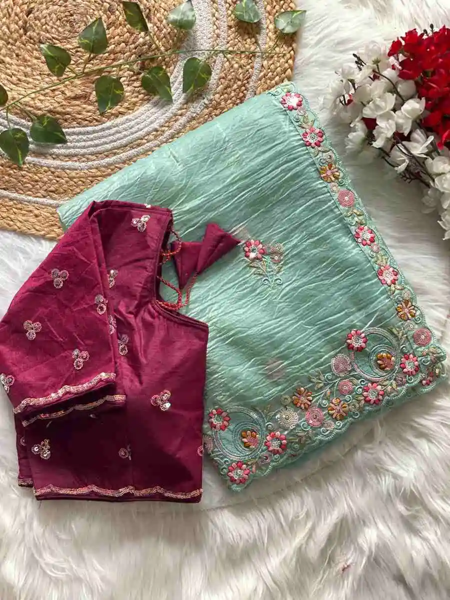SAREE : FABRIC : PURE SOFT JIMMY CHOO CHIFFON SILK WORK : ZARI WORK WITH CONTRAST PALLU WORK BORDER & SAREE LENGTH : 5.5 METER BLOUSE : FABRIC : RUNNING FABRIC WORK : EMBROIDERY WORK LENGTH ...
