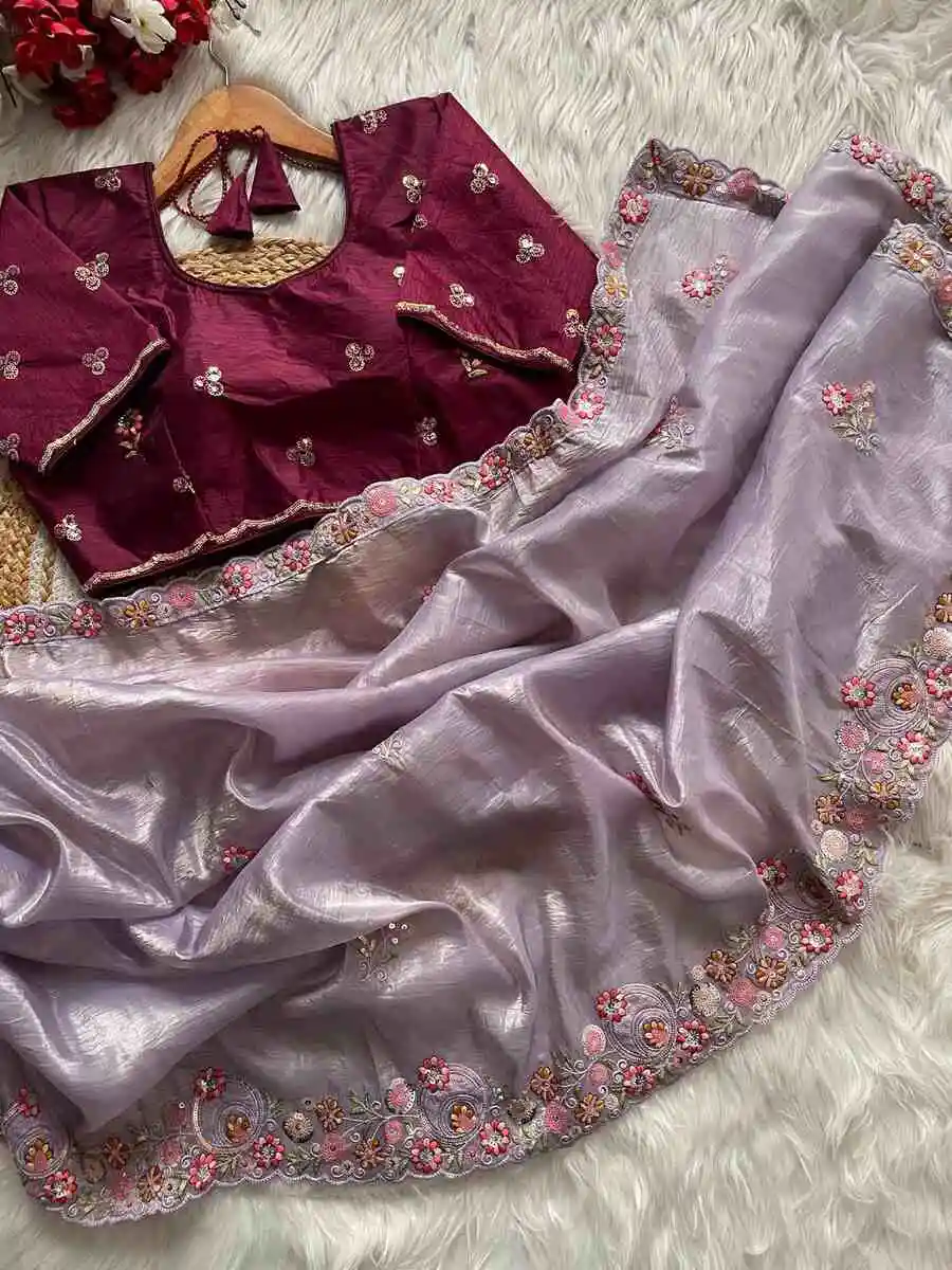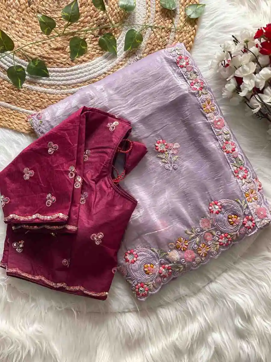 MODERN JIMMY CHOO CHIFFON SILK ZARI WORK WITH CONTRAST PALLU WORK BORDER WORK SAREE WITH UNSTITCHED BLOUSE LAVENDER