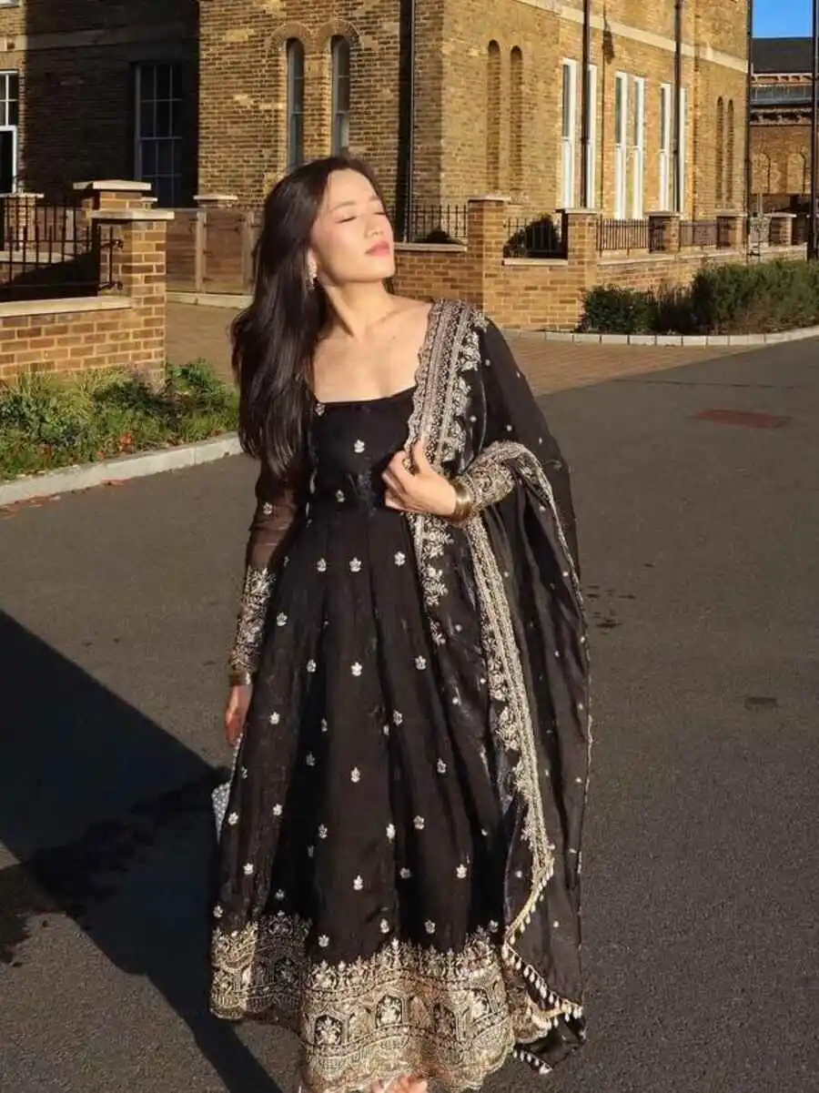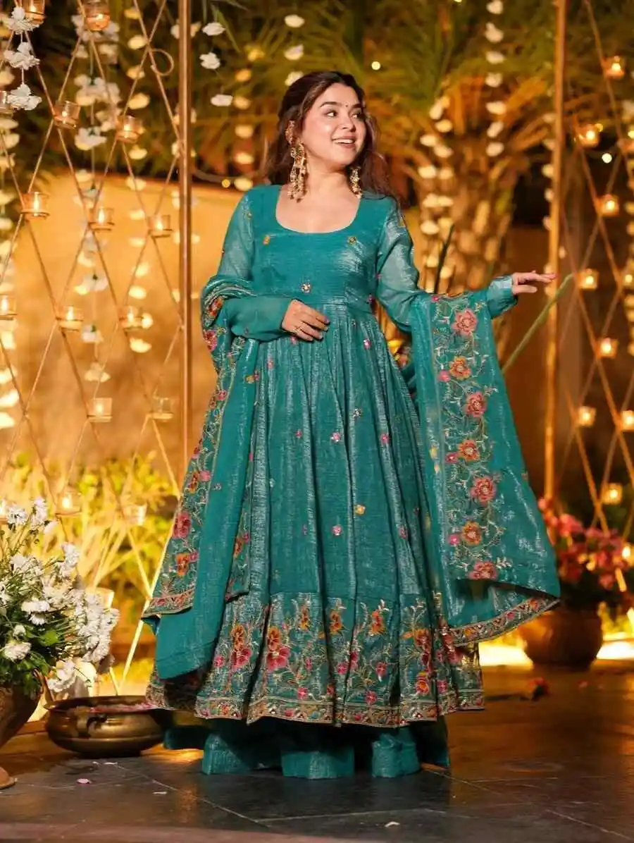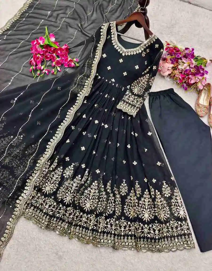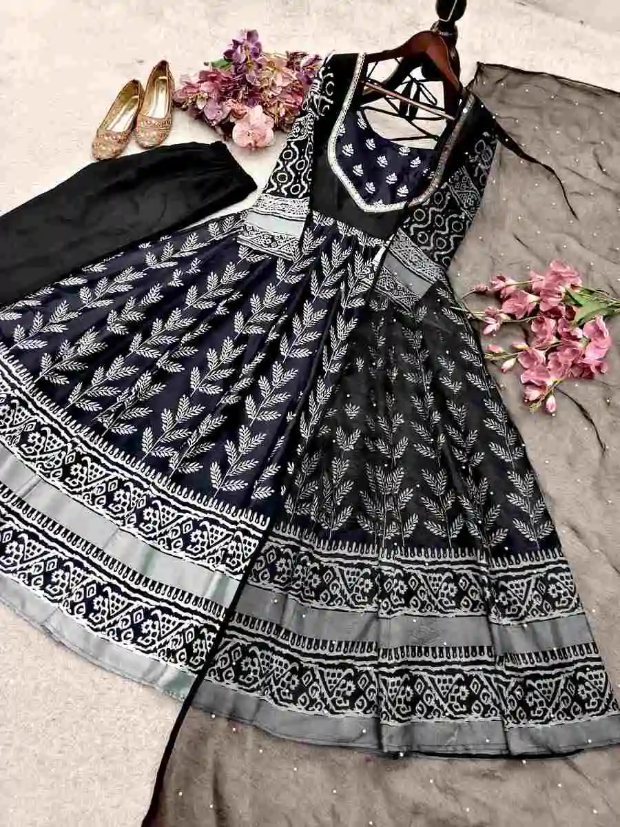 RICH LOOK VICHITRA SILK PLAIN GOWN PALAZZO WITH SEQUENCE AND EMBROIDERY WORK DUPATTA NAVY BLUE