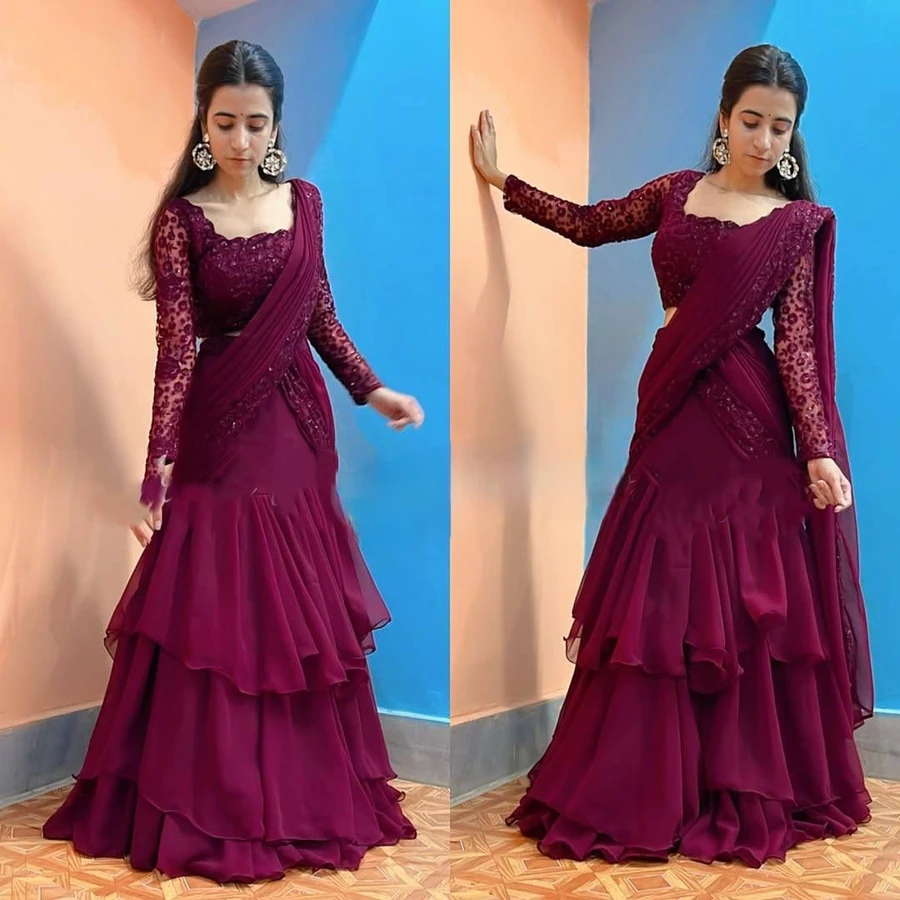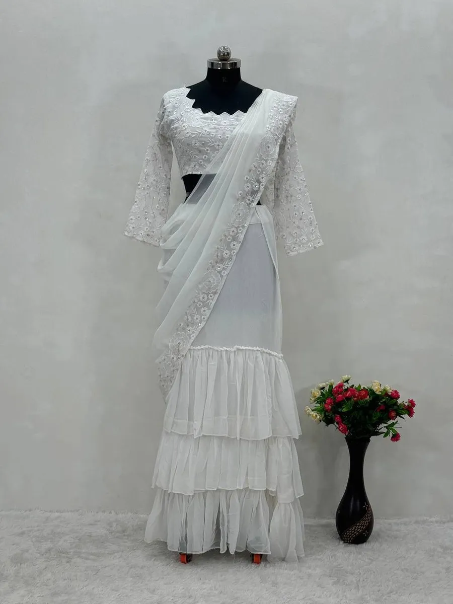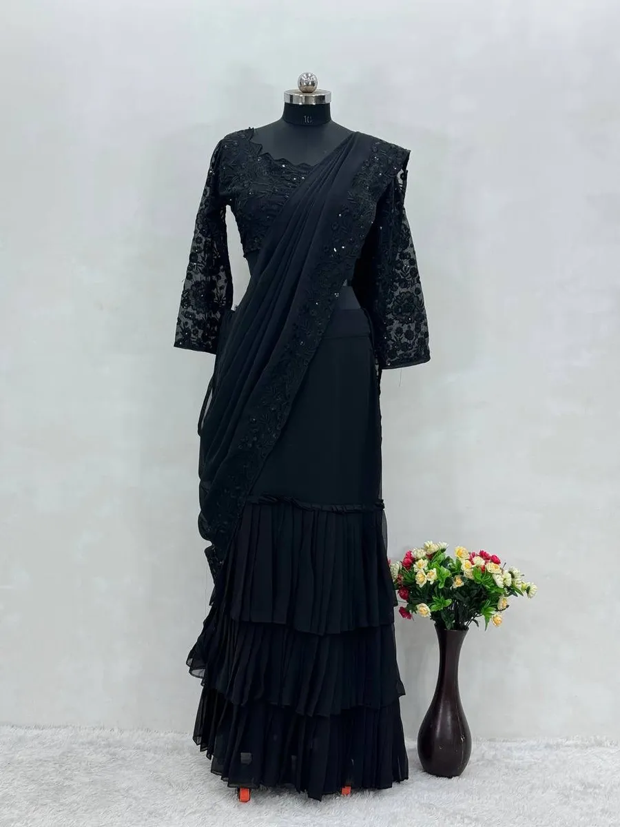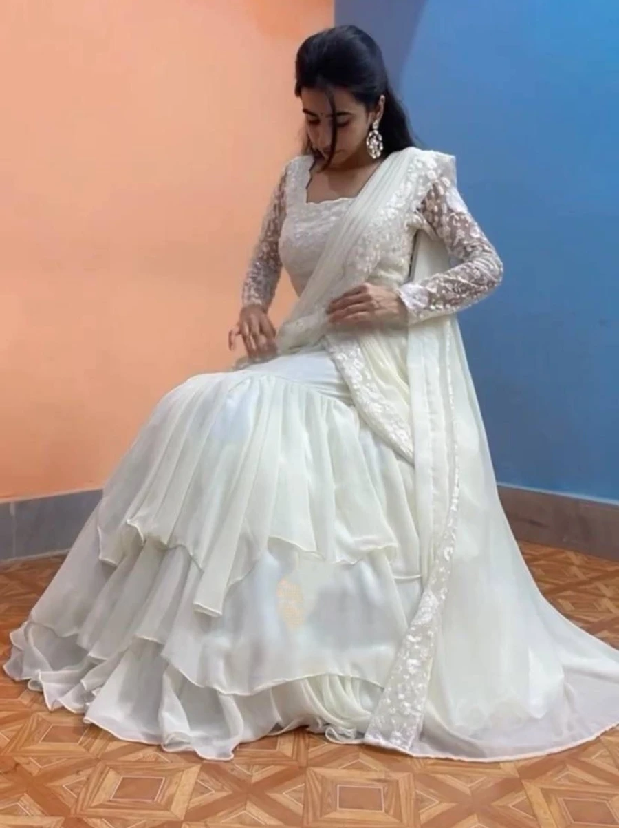 LEHENGA SAREE : FABRIC : HEAVY FUAX GEORGETTE WORK : HEAVY EMBROIDERY SEQUENCE WORK WITH RUFFLE INNER : MICRO COTTON FULL STITCHED UP TO 44"INCH SIZE CHOLI : FABRIC : HEAVY FUAX GEORGETTE SIZE : FULL ...