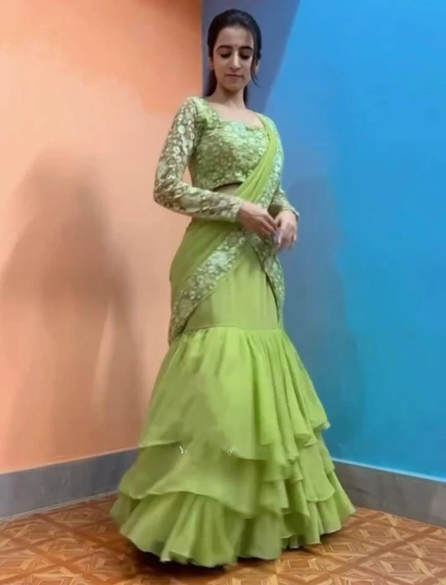 NEW ARRIVAL GEORGETTE EMBROIDERY SEQUENCE WORK WITH RUFFLE WORK LEHENGA SAREE CHOLI WITH ATTACHED DUPATTA GREEN