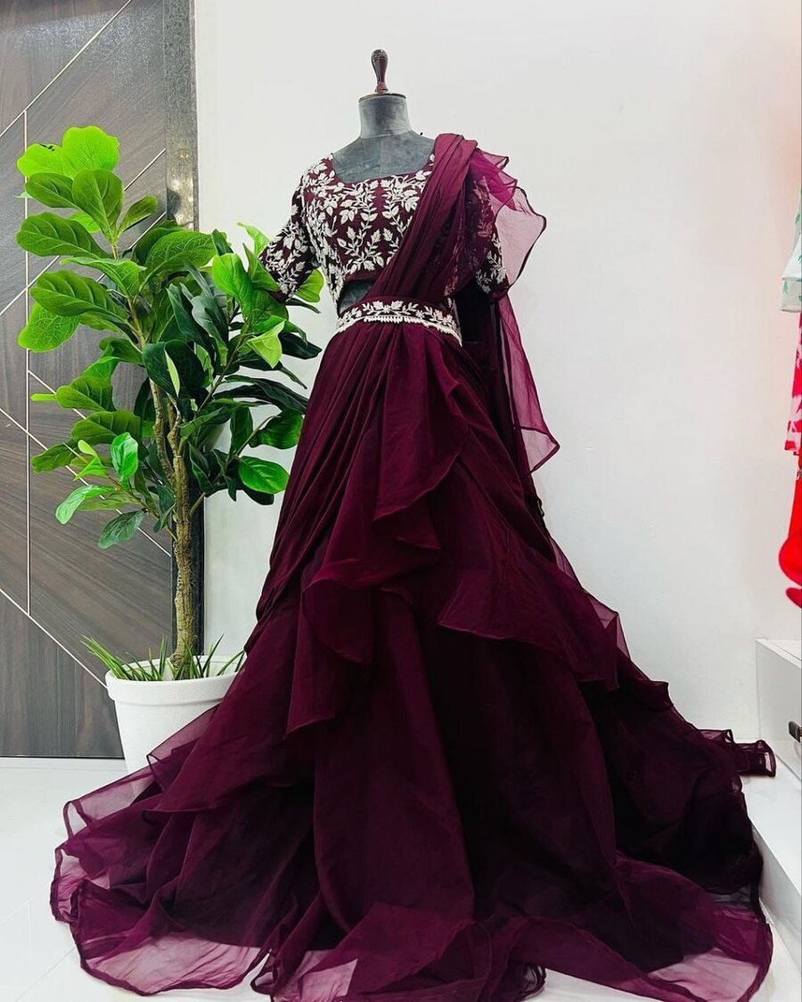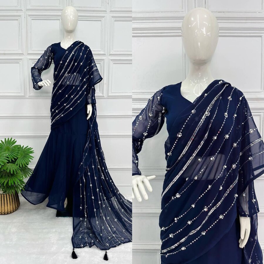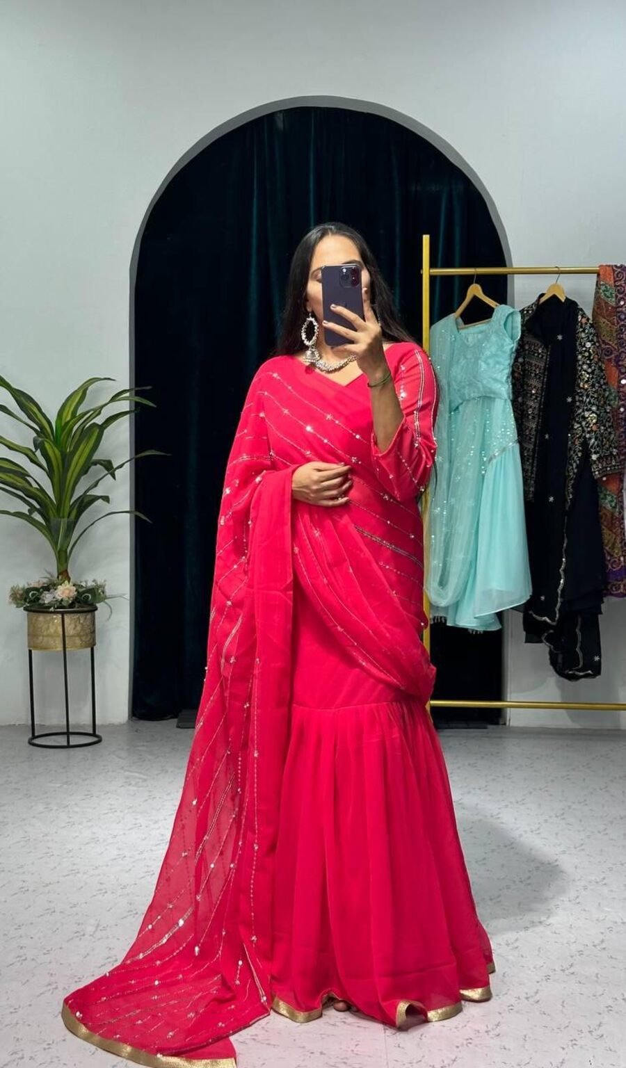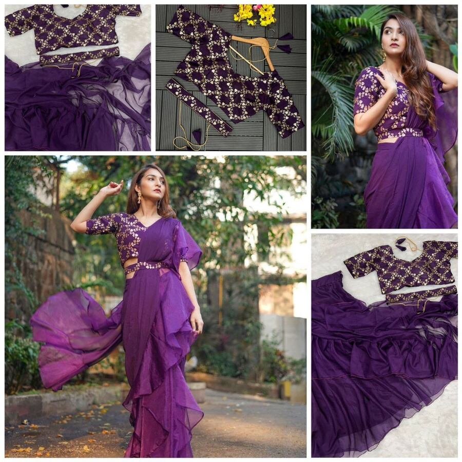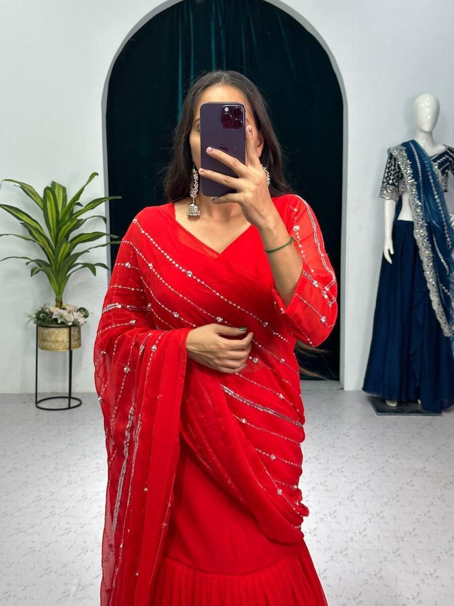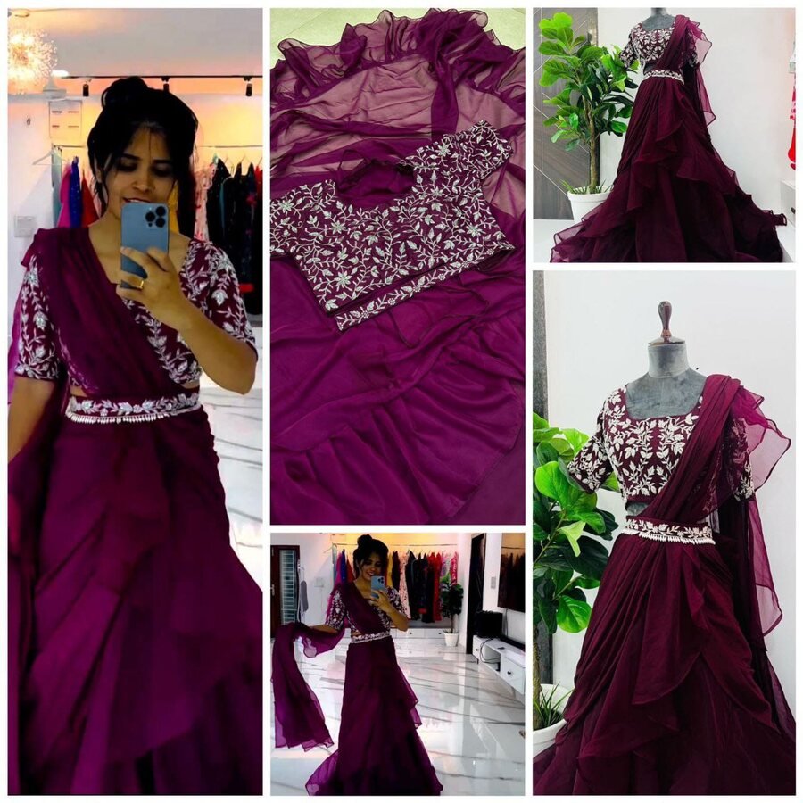 LEHENGA SAREE :- FAUX GEORGETTE 3 LAYER RUFFLE WITH ATTACHED DUPATTA BLOUSE :- MONO BANGLORI SILK WITH MULTI THREAD EMBROIDERY SEQUENCE FRONT AND BACK BOTH SIDE WORK ( FULL STITCH ) SIZE :- 42-XL FREE SIZE( ...