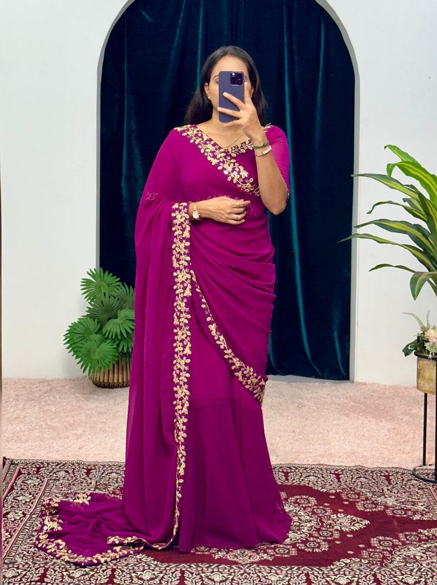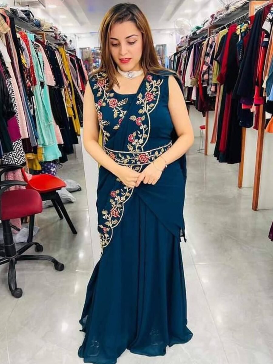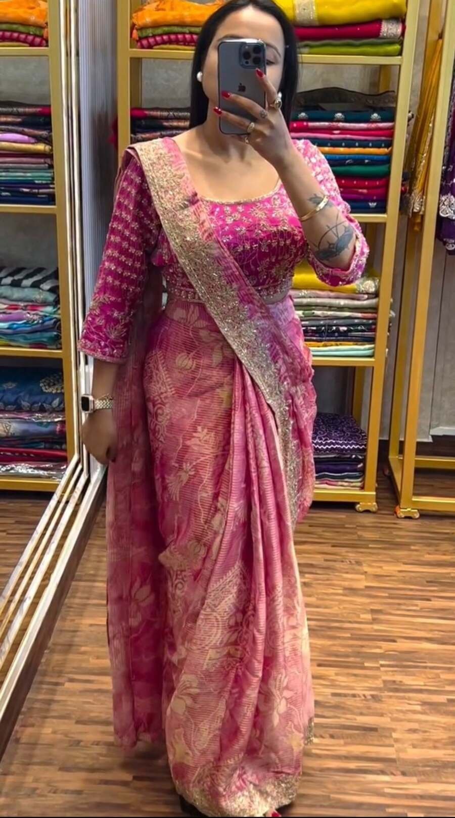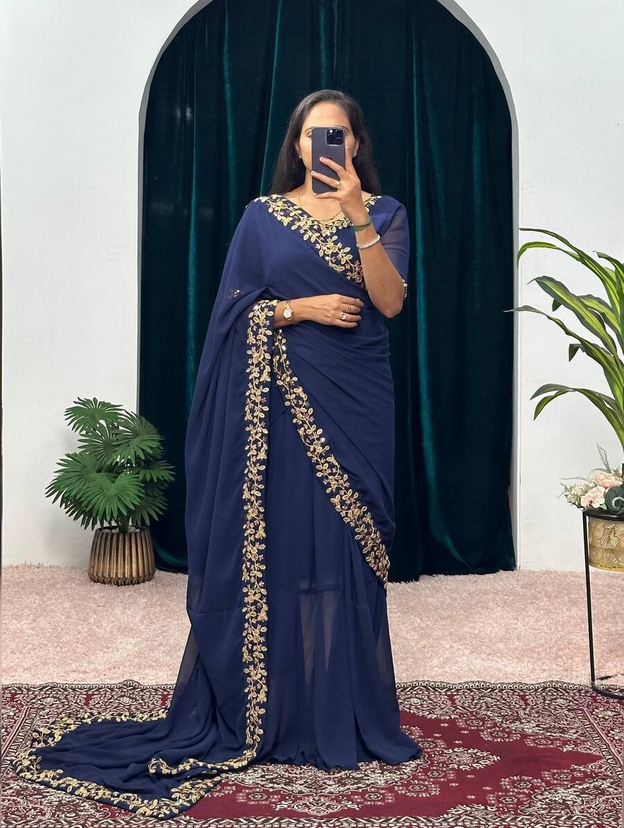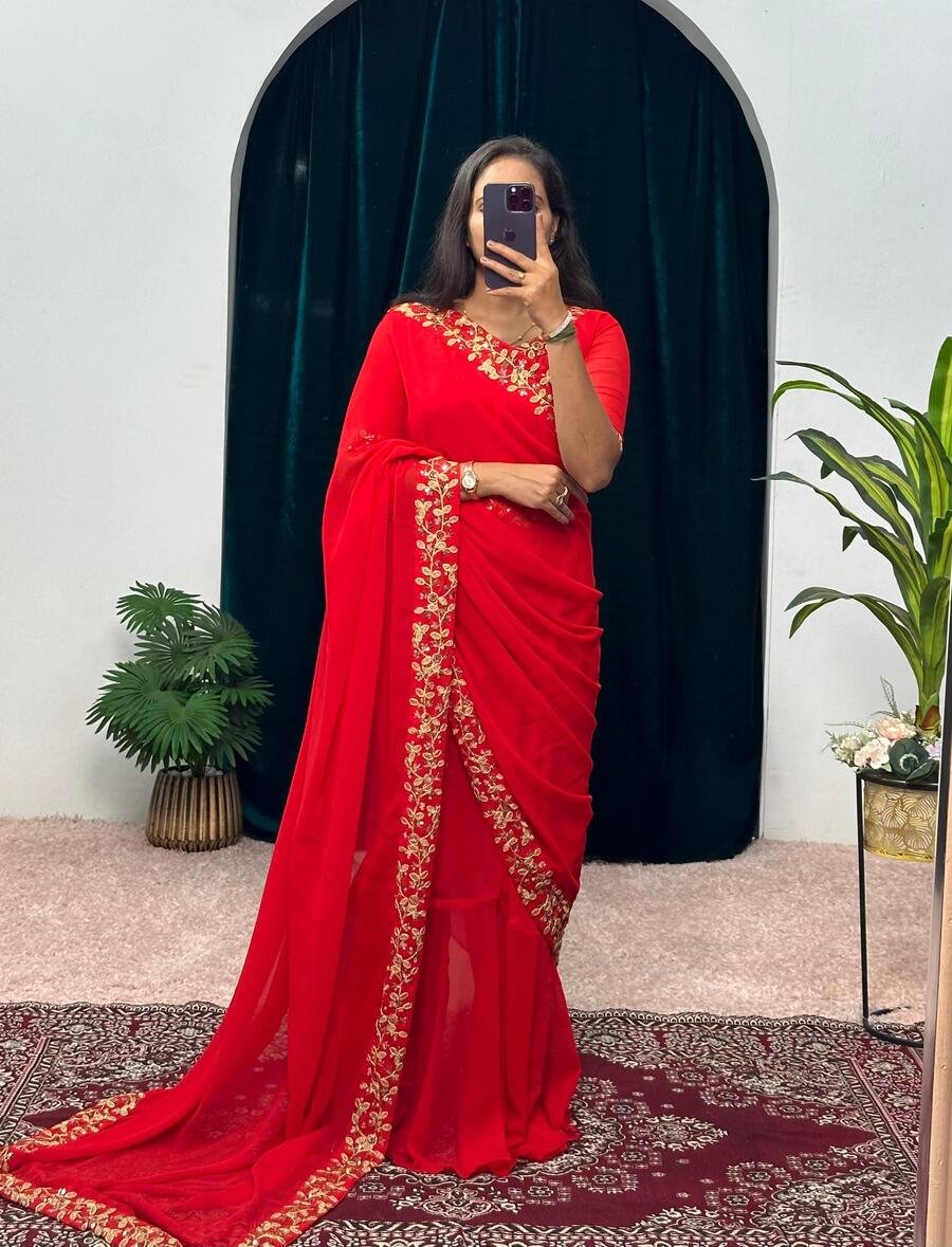 LEHENGA SAREE :- FAUX GEORGETTE 3 LAYER RUFFLE WITH ATTACHED DUPATTA BLOUSE :- MONO BANGLORI SILK WITH MULTI THREAD EMBROIDERY SEQUENCE FRONT AND BACK BOTH SIDE WORK ( FULL STITCH ) SIZE :- 42-XL FREE SIZE( ...