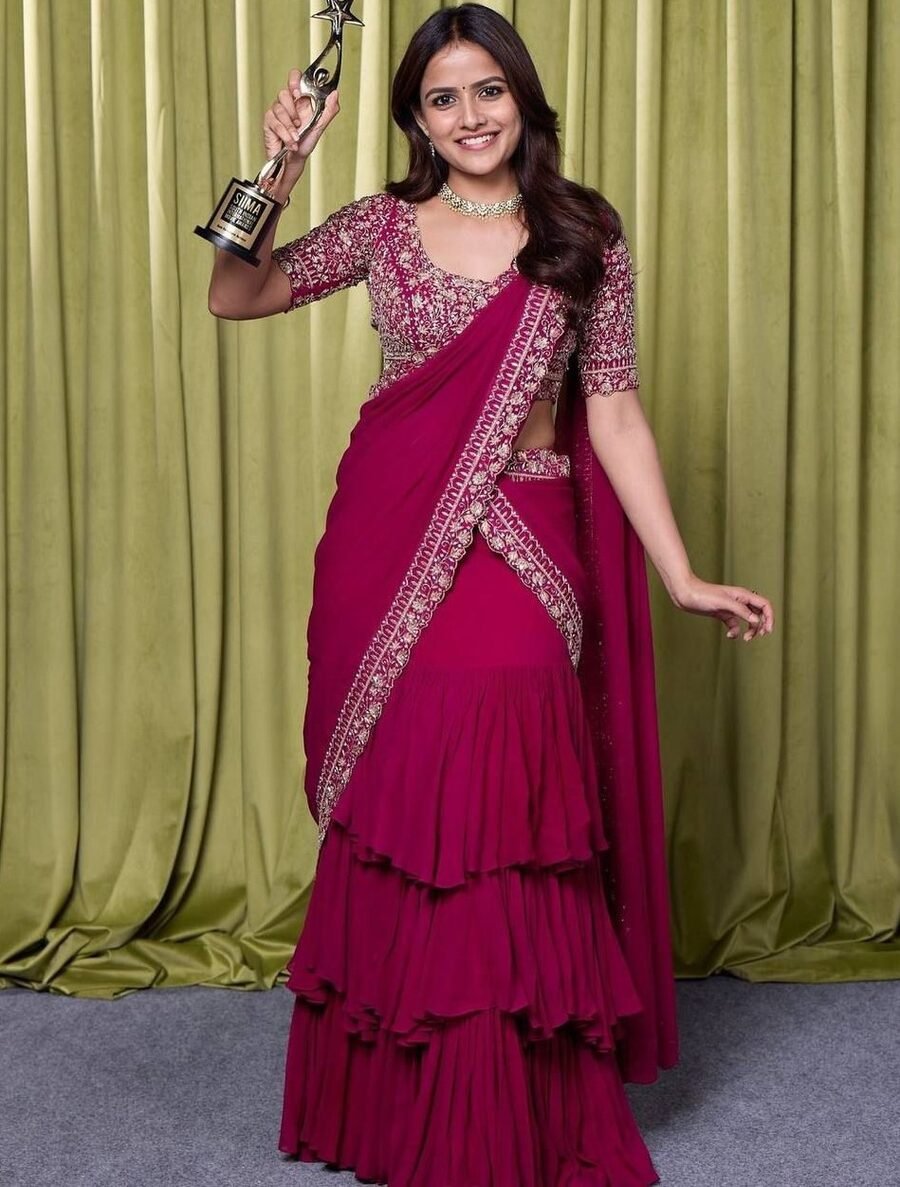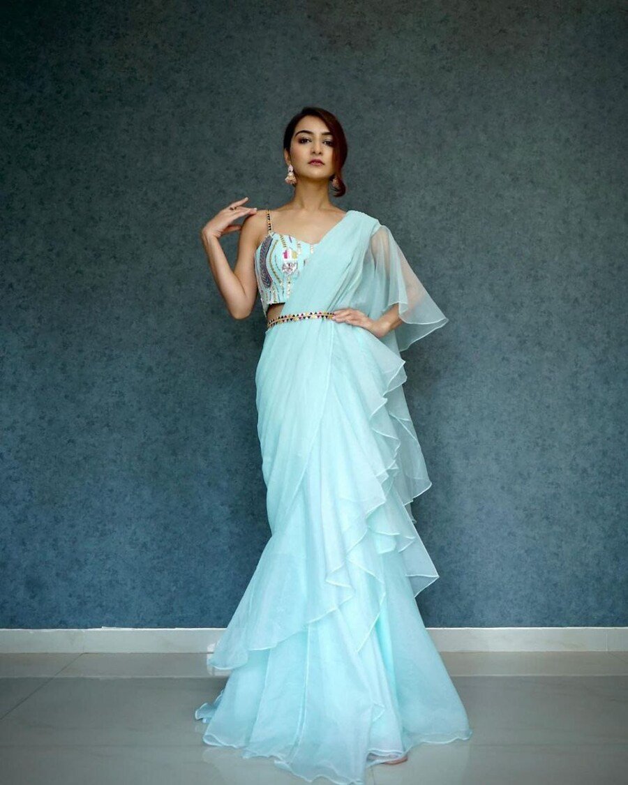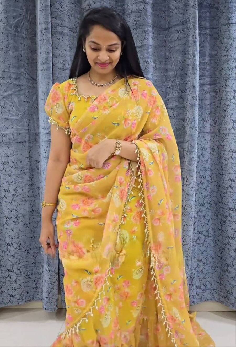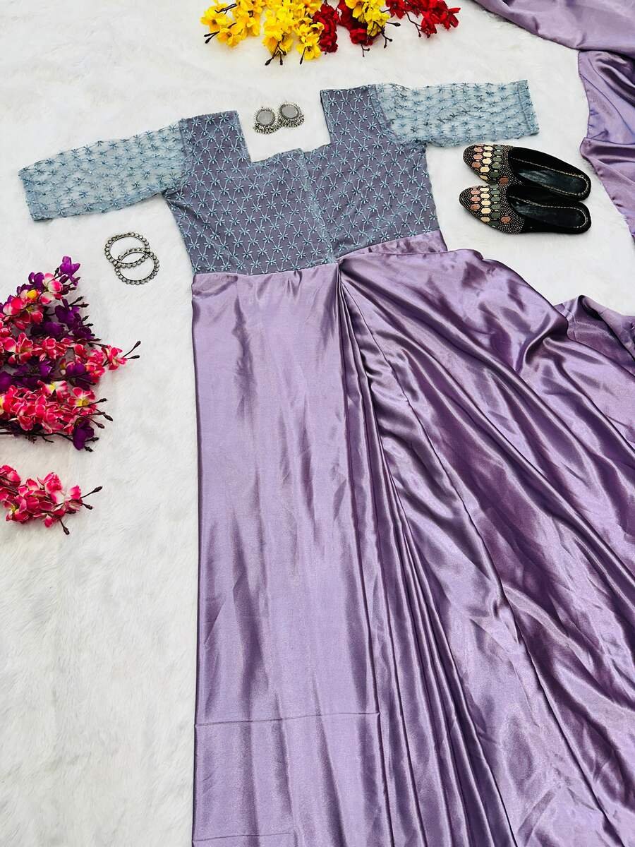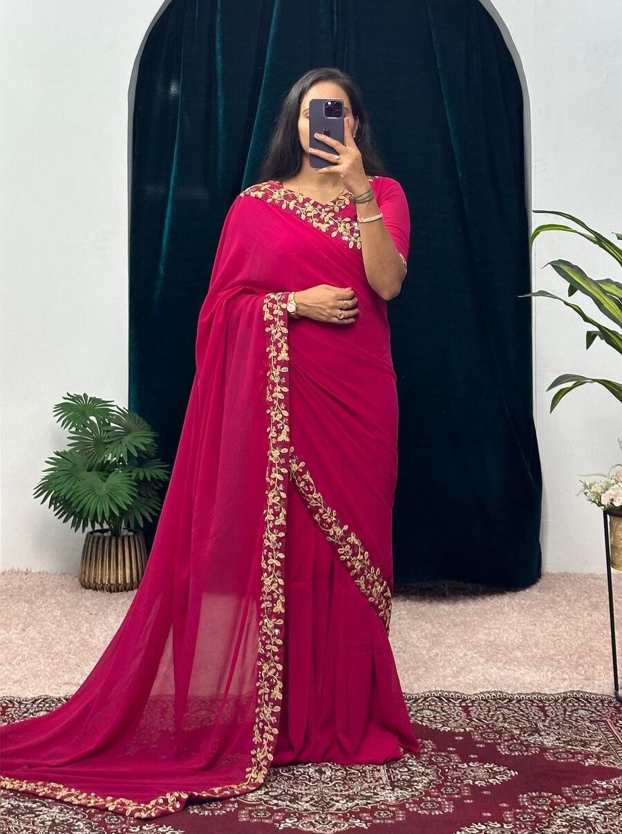 LEHENGA SAREE :- FAUX GEORGETTE 3 LAYER RUFFLE WITH ATTACHED DUPATTA BLOUSE :- MONO BANGLORI SILK WITH MULTI THREAD EMBROIDERY SEQUENCE FRONT AND BACK BOTH SIDE WORK ( FULL STITCH ) SIZE :- 42-XL FREE SIZE( ...