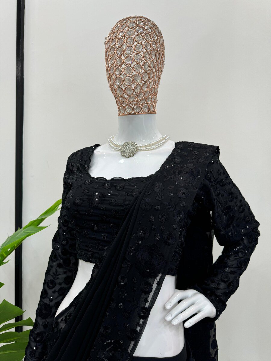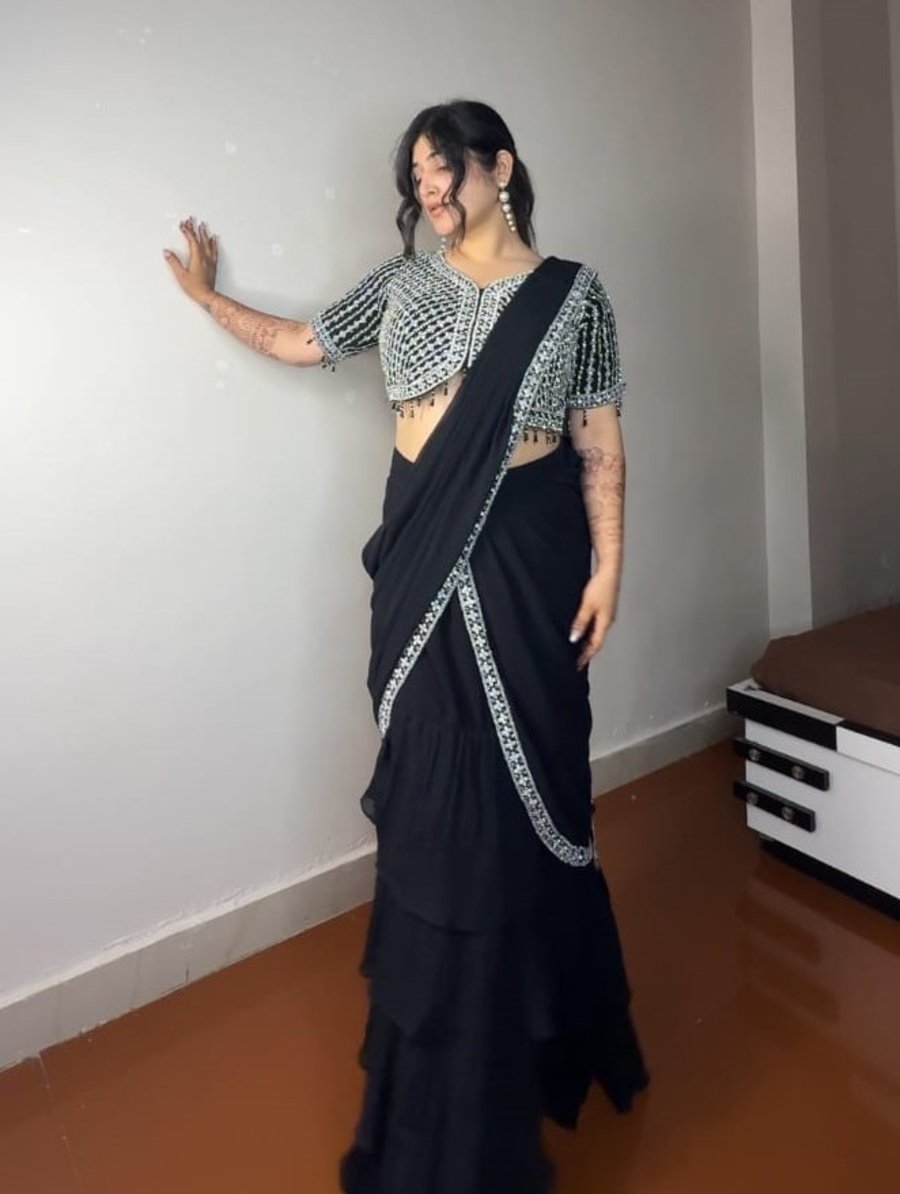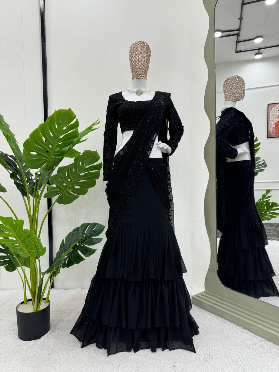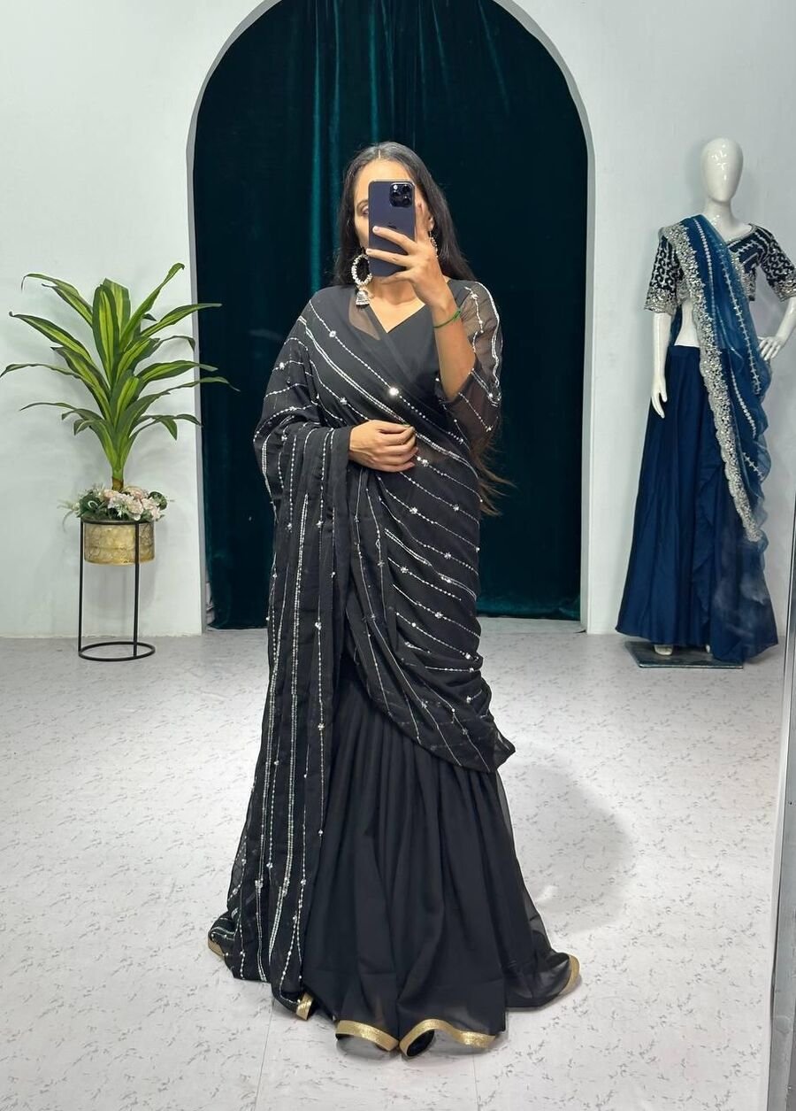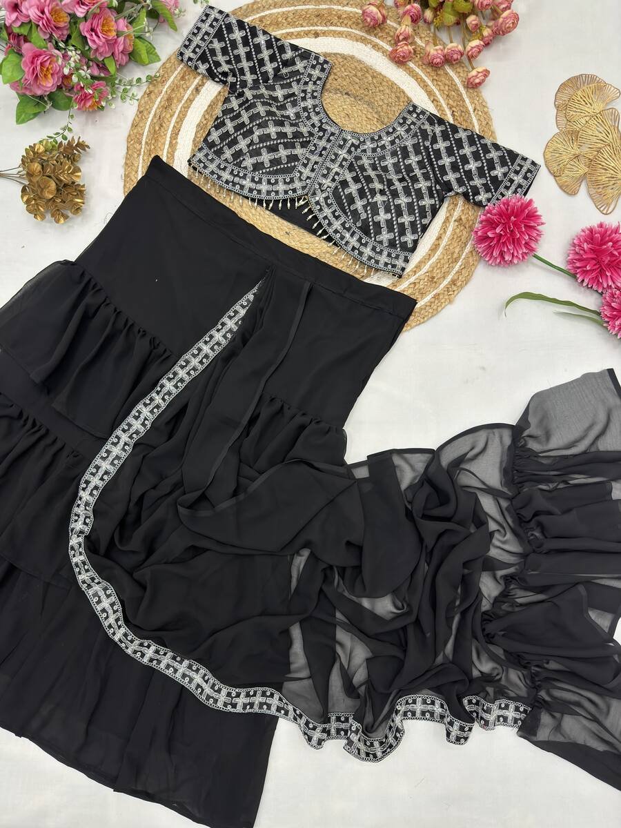 DESIGNER GEORGETTE RUFFLE EMBROIDERY THREAD SEQUENCE WORK LEHENGA SAREE WITH UNSTITCHED BLOUSE BLACK