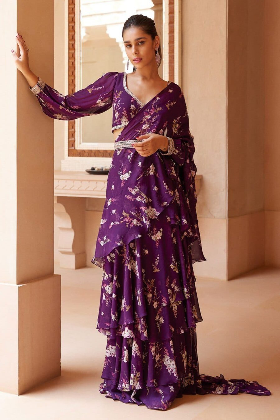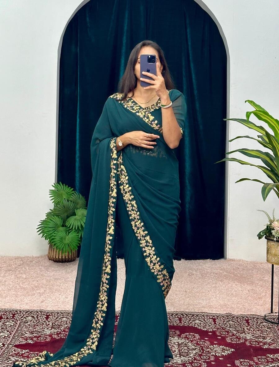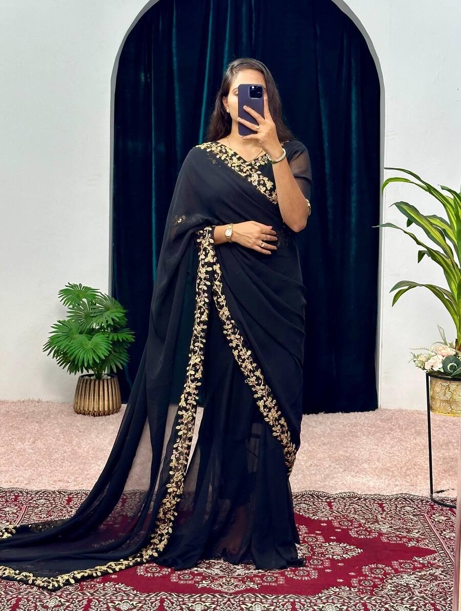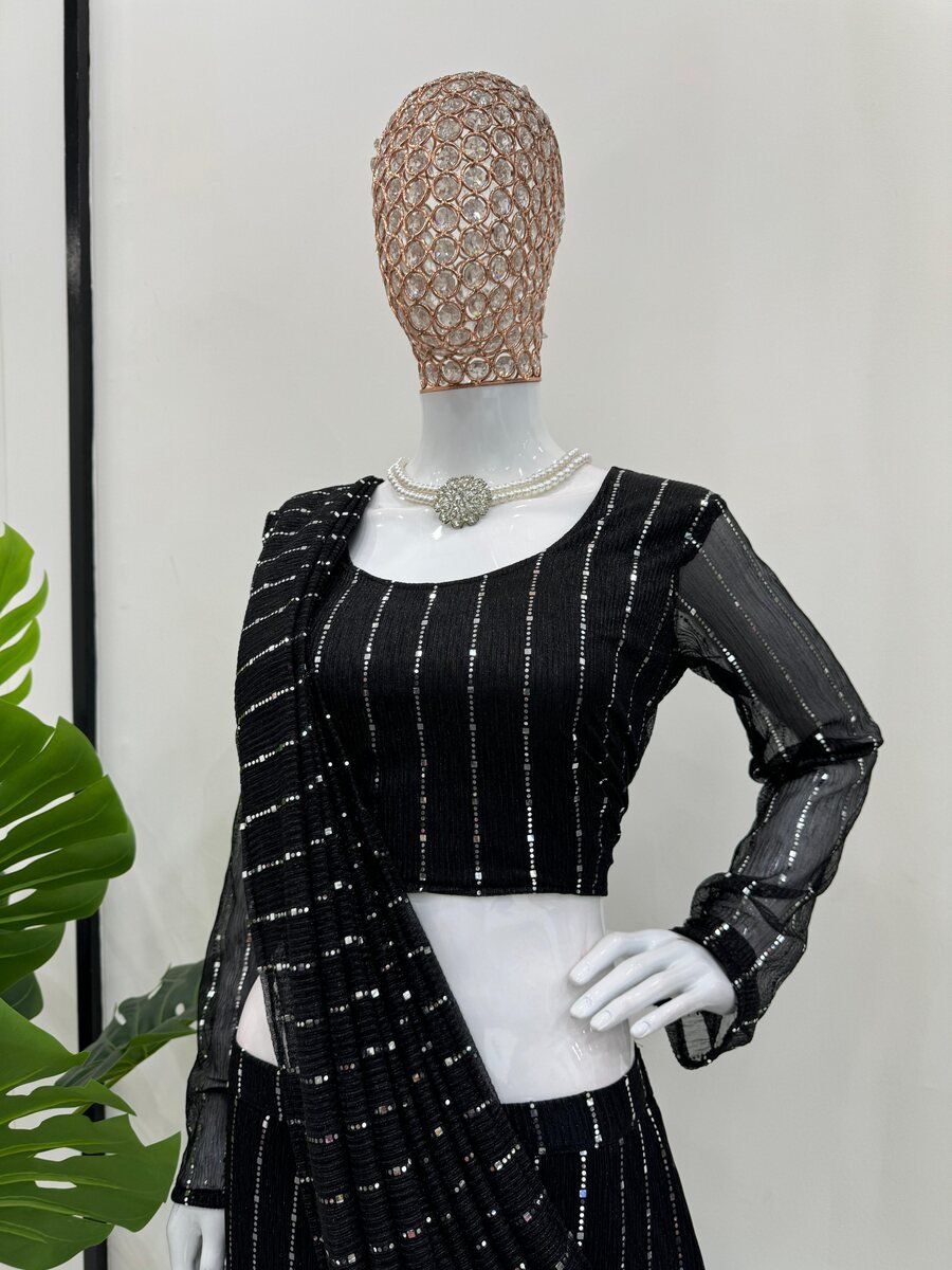 DESIGNER GEORGETTE RUFFLE EMBROIDERY THREAD SEQUENCE WORK LEHENGA SAREE WITH UNSTITCHED BLOUSE BLACK
