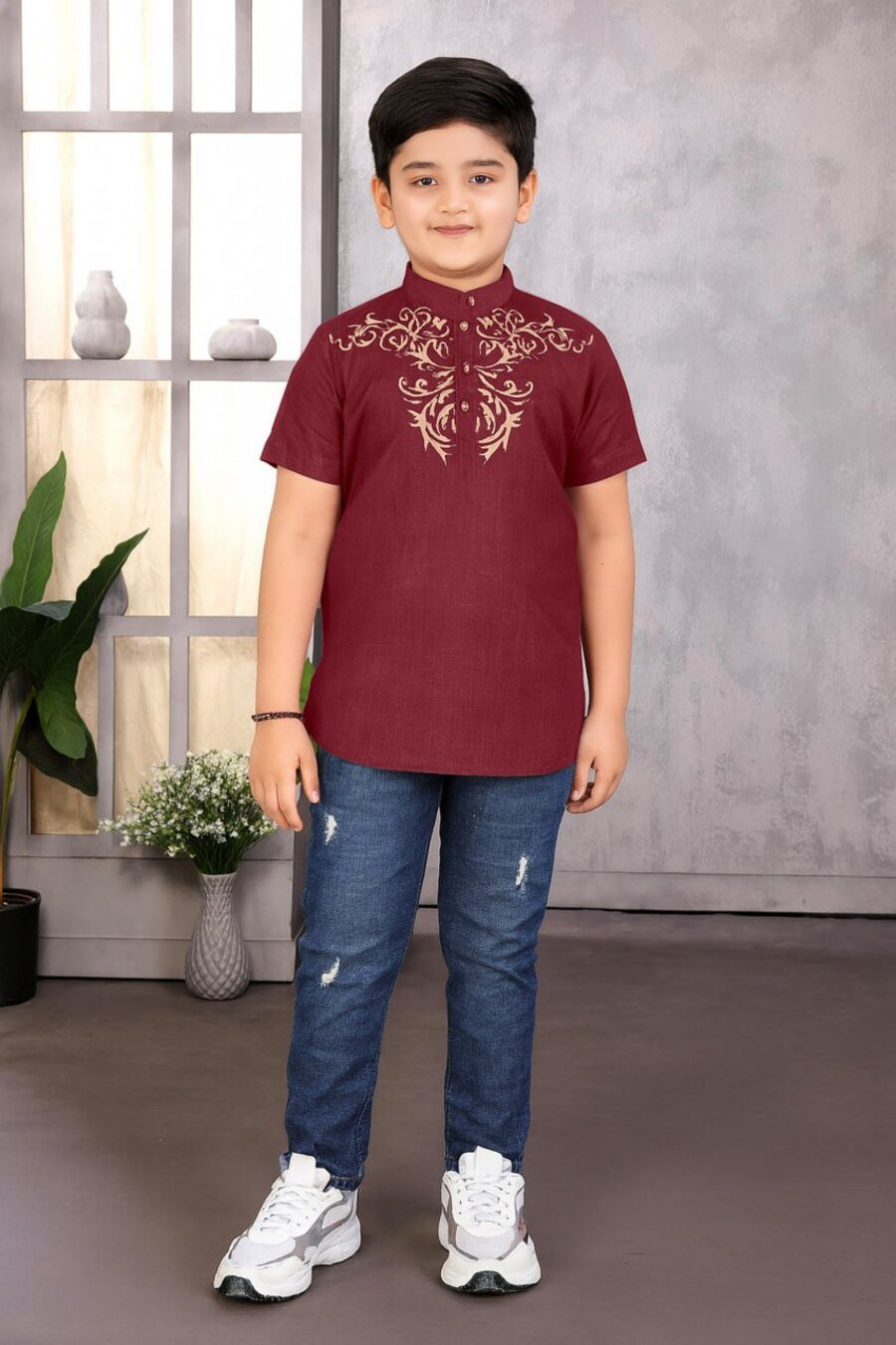 NEW ARRIVAL MAGIC COTTON FOIL PRINT WORK KID’S SHIRT MAROON