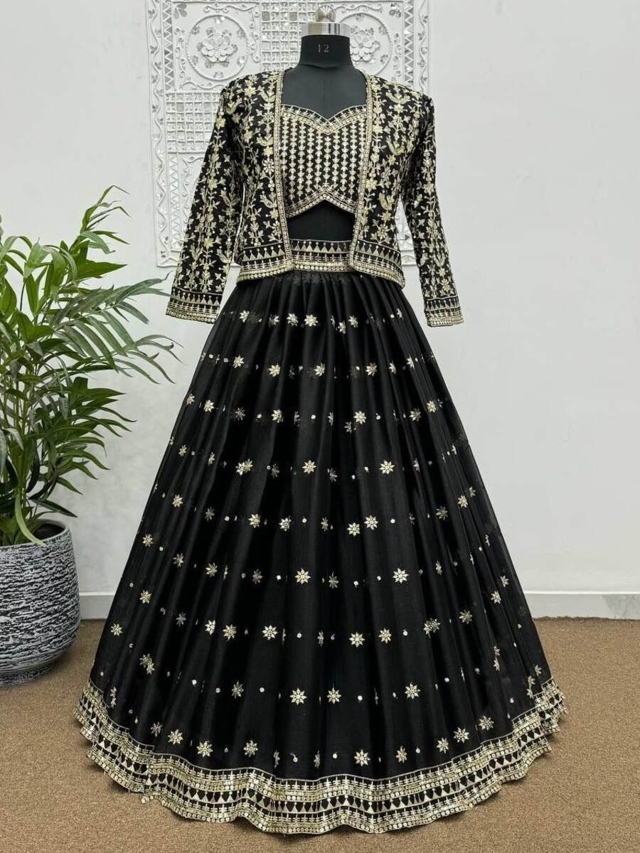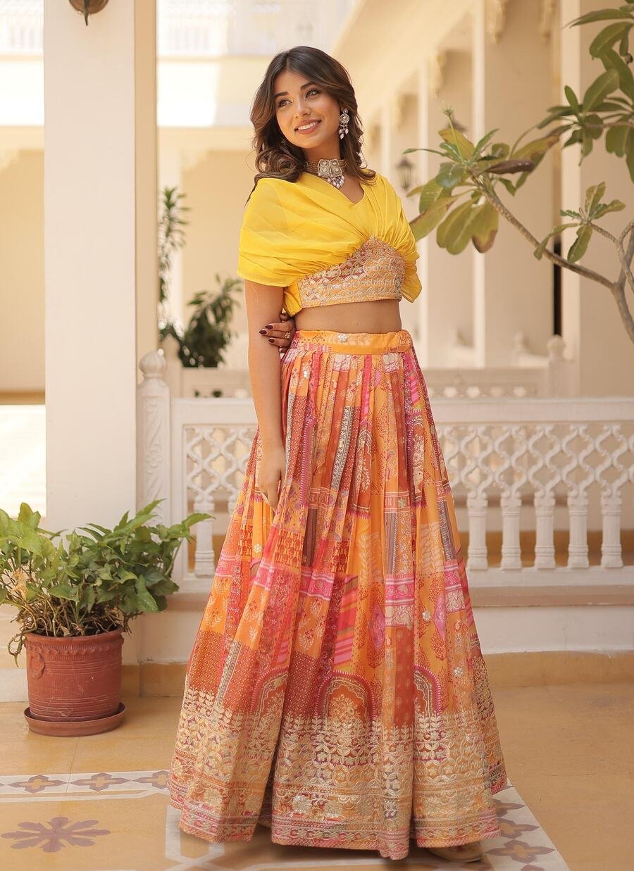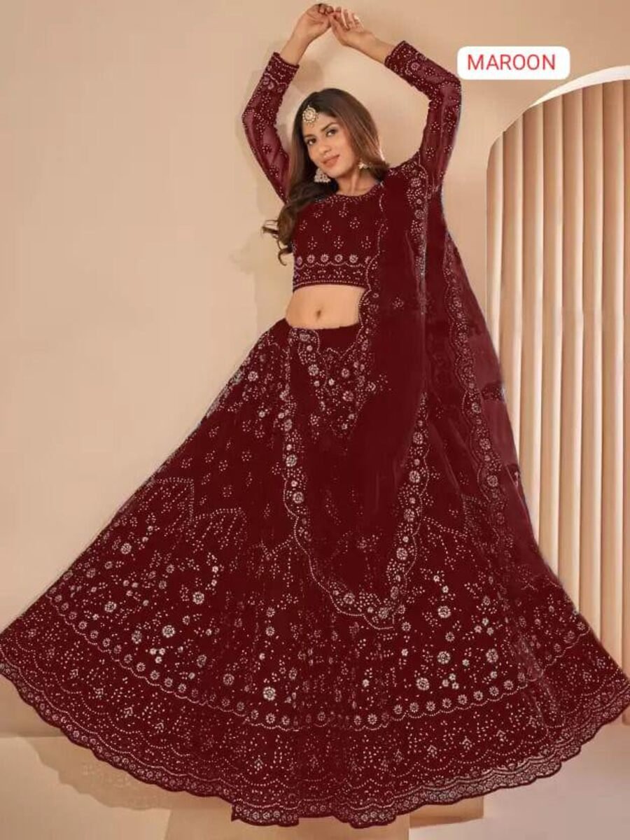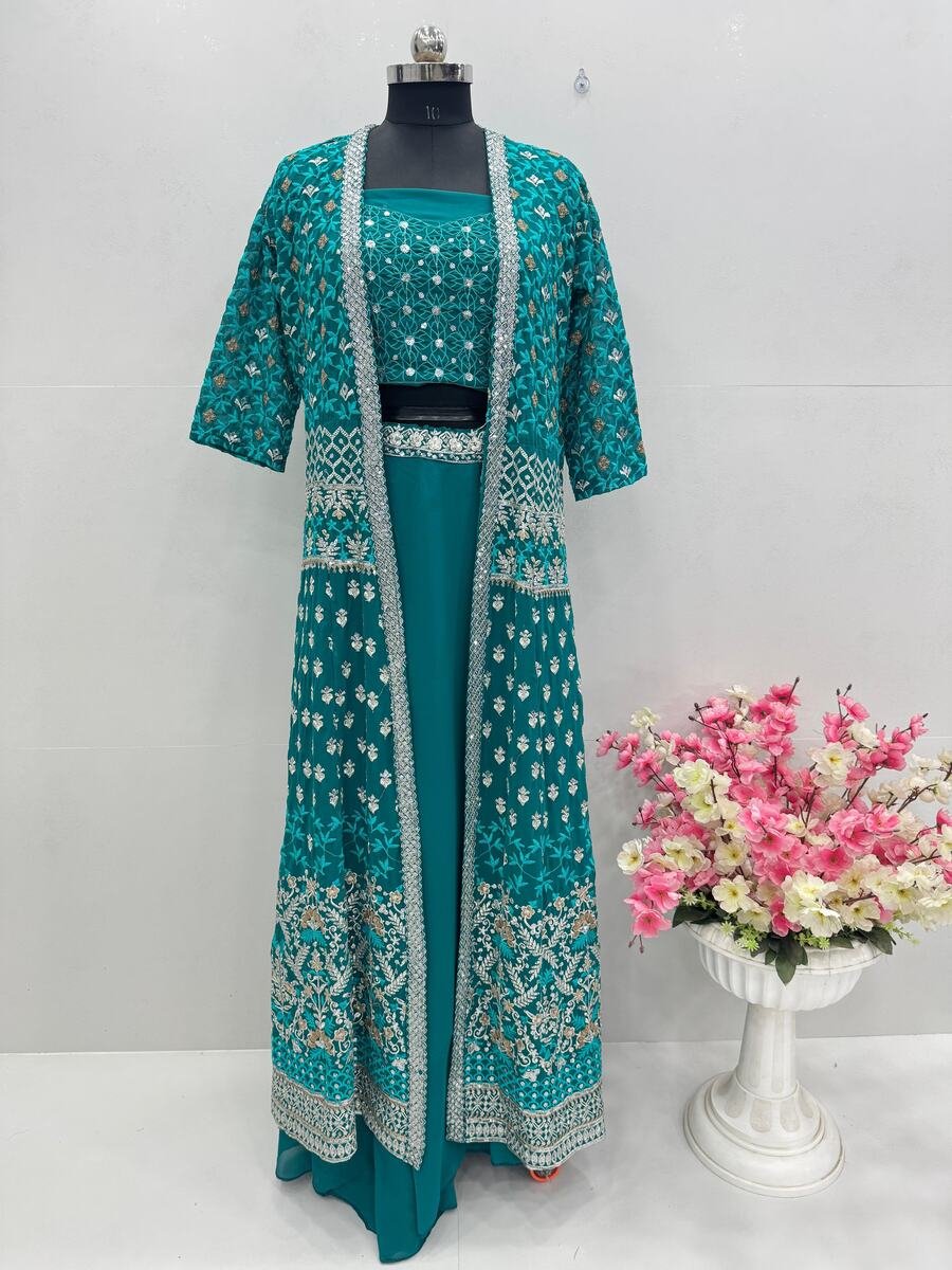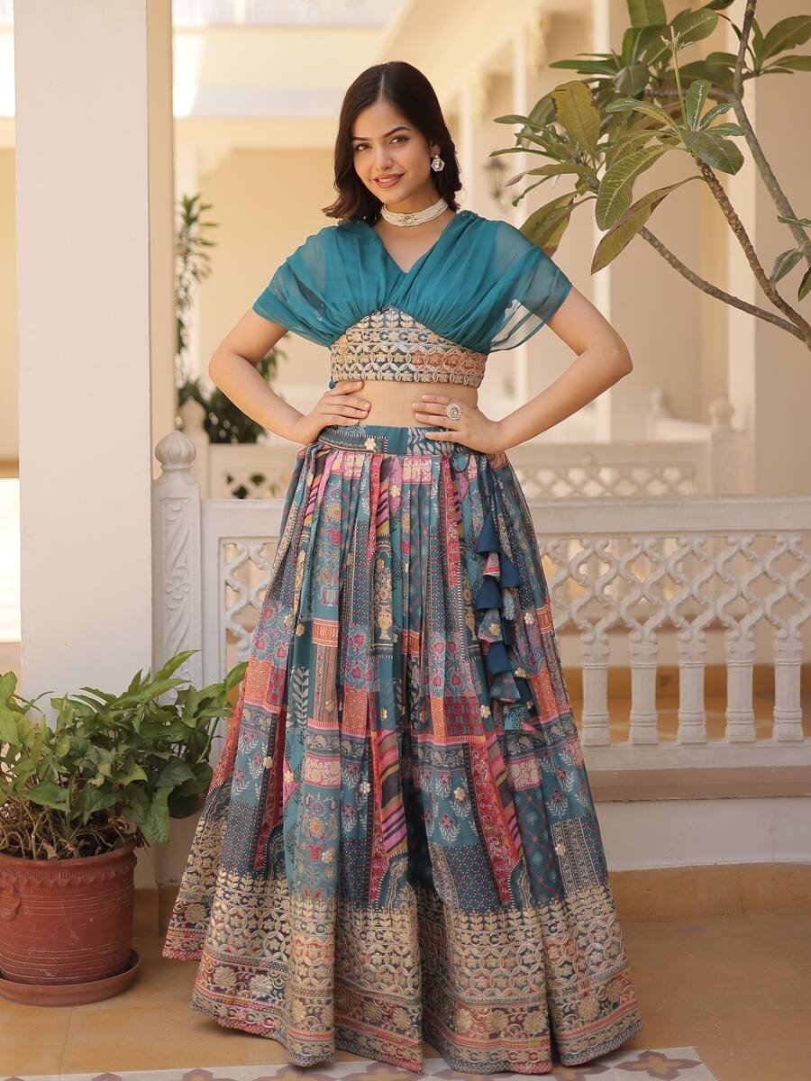 LEHENGA(STITCHED) : FABRIC : HEAVY GEORGETTE WORK : PLAIN WAIST : SUPPORTED UP TO 42 INCH CLOSER : DRAWSTRING WITH HAND MADE TASSELS AND ZIP STITCHING : STITCHED WITH CANVAS WITH CAN CAN LENGTH : 41 ...