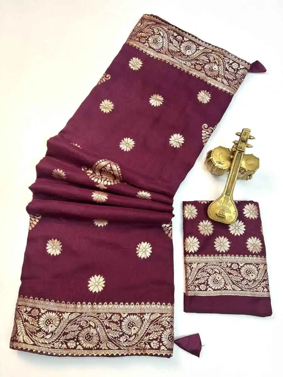 RICH LOOK DOLA SILK ZARI & MEENAKARI WEAVING WITH PIPING LACE BORDER WORK SAREE WITH UNSTITCHED BLOUSE WINE