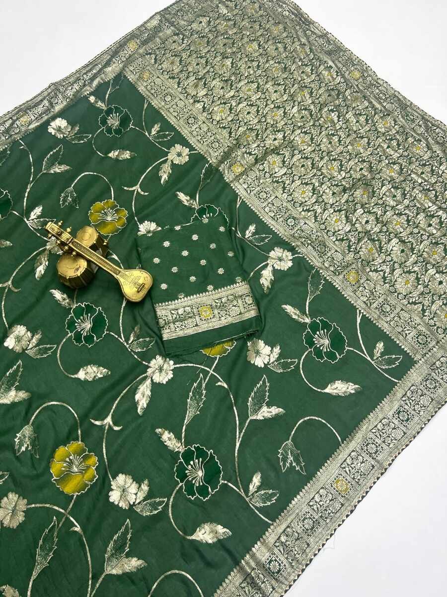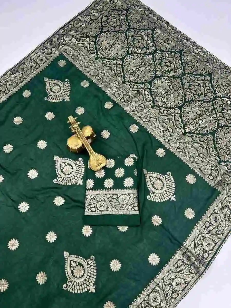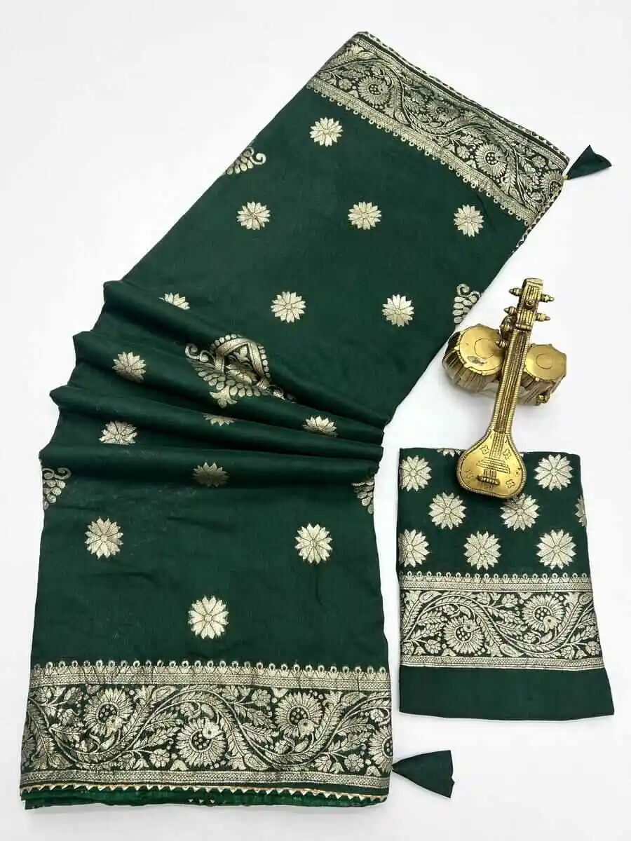 TRENDING LICHI SILK BANARASI WEAVING WORK SAREE WITH UNSTITCHED BLOUSE DARK GREEN