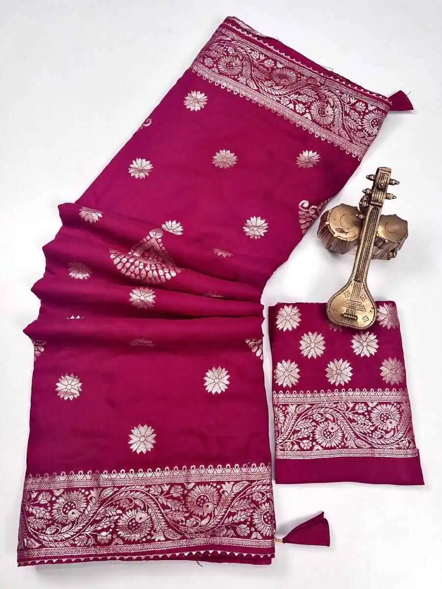 SAREE : FABRIC : LICHI SILK WORK : BANARASI WEAVING WORK LENGTH : 5.5 METER BLOUSE : FABRIC : RUNING LENGTH : 0.80 METER SAREE WITH UNSTITCHED BLOUSE