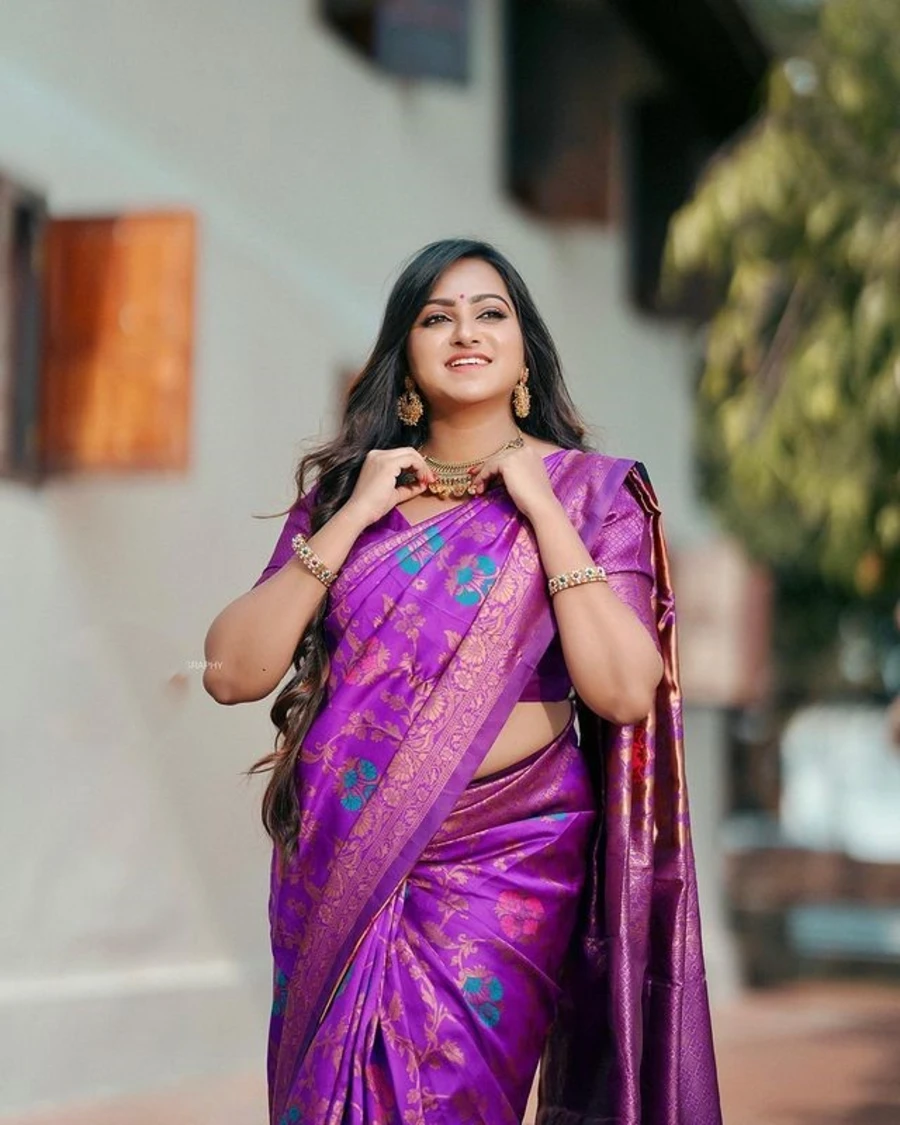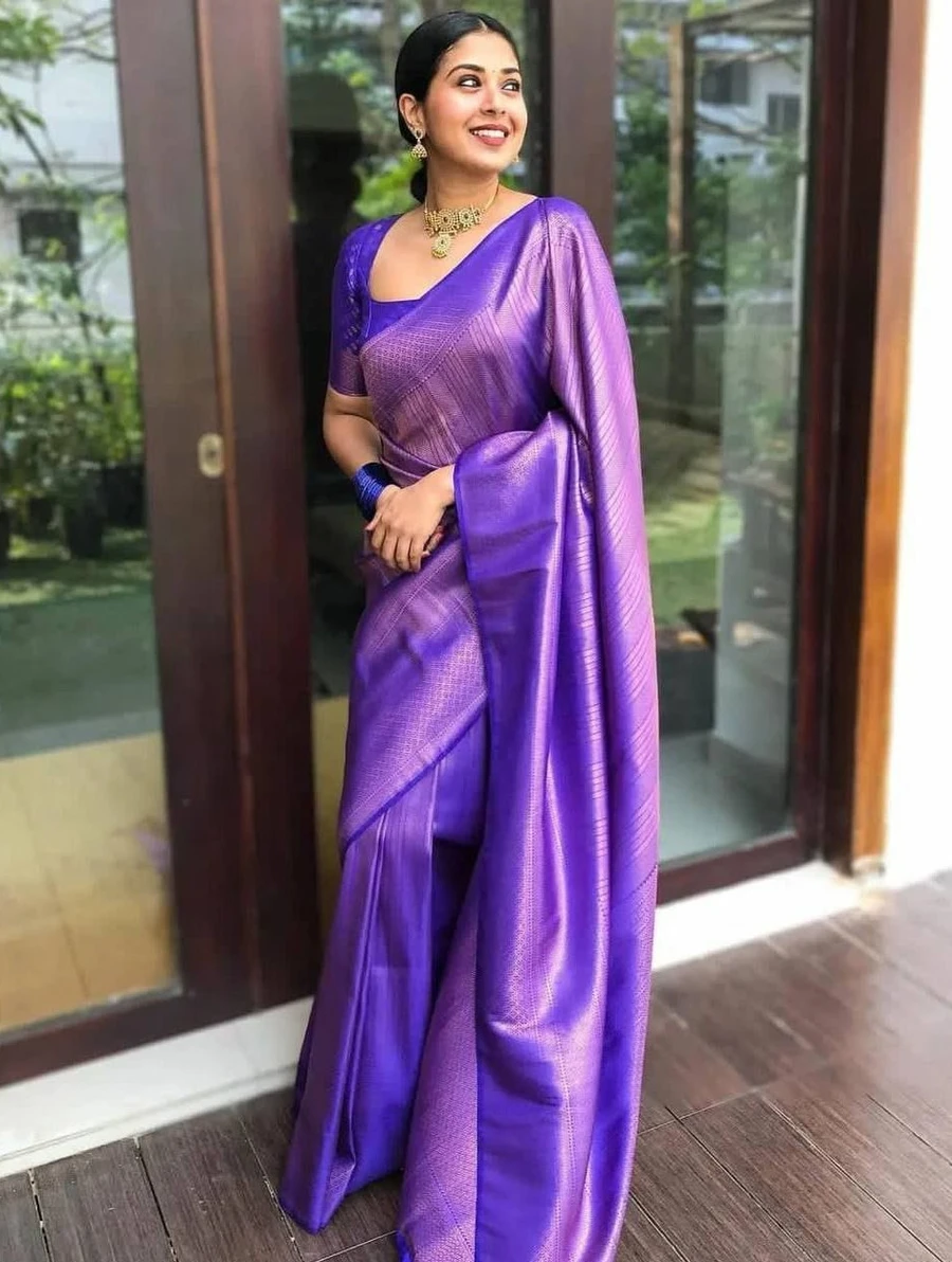 RICH LOOK LICHI SILK JACQUARD BORDER COPPER WORK SAREE WITH UNSTITCHED BLOUSE PURPLE