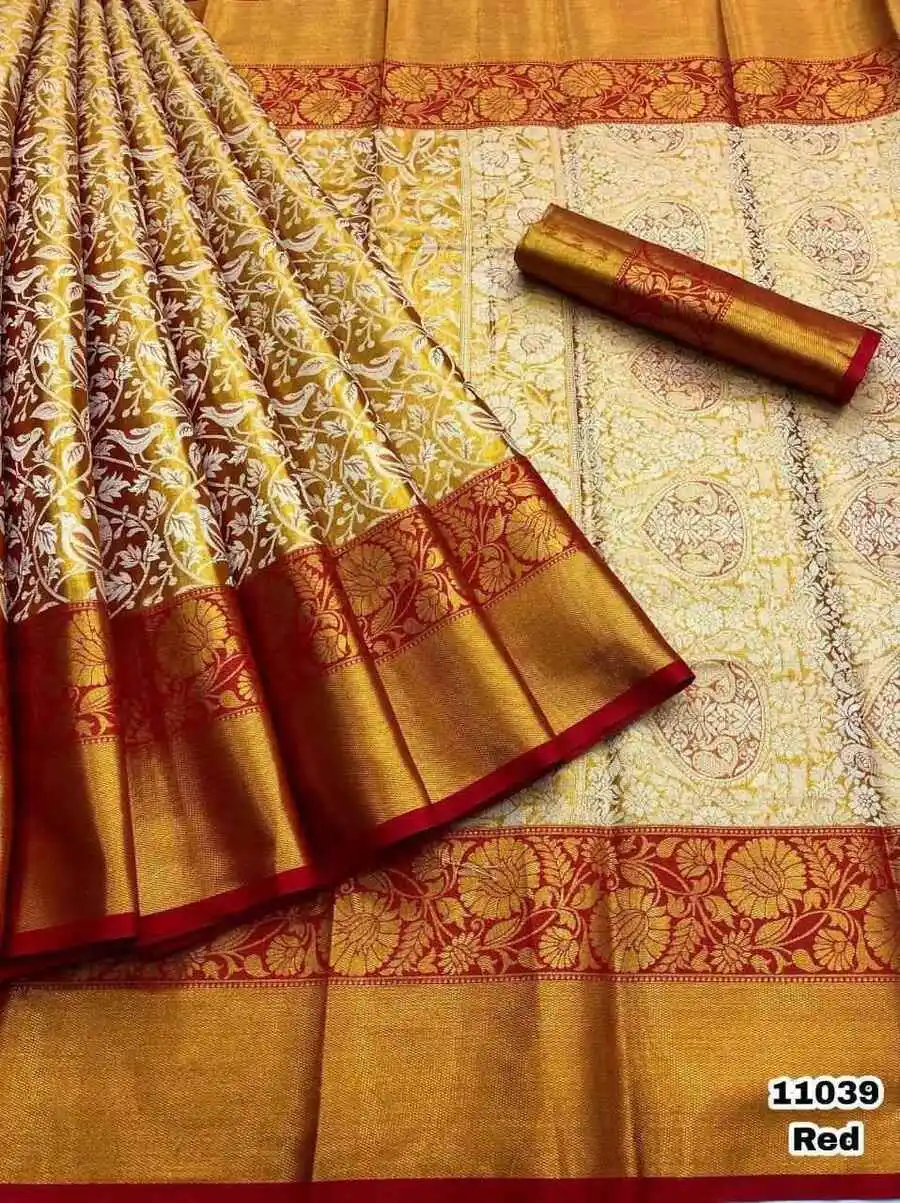 RICH LOOK KANJIVARAM SILK MINA WEAVING & CONTRAST BORDER & CONTRAST GOLD ZARI WORK SAREE WITH UNSTITCHED BLOUSE RED