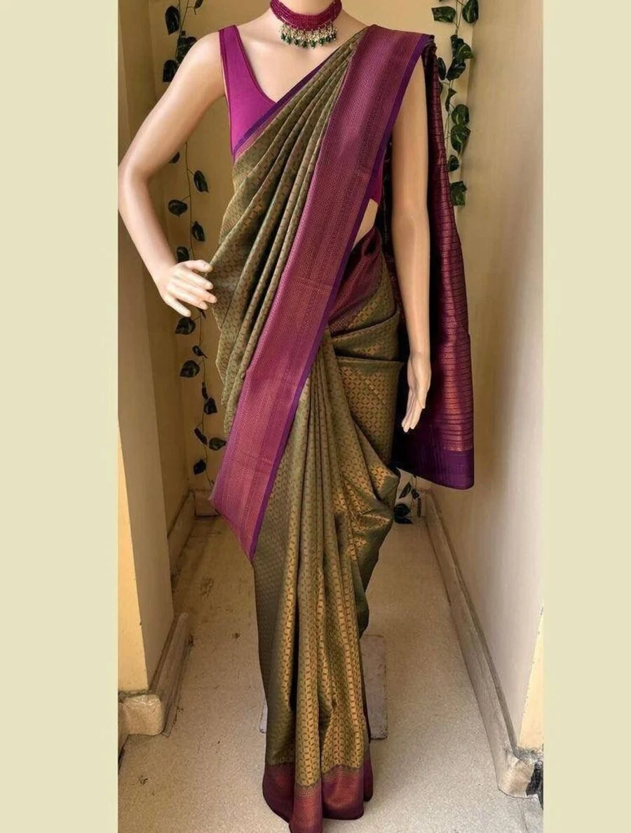 DESIGNER LICHI SILK JACQUARD WORK SAREE WITH UNSTITCHED BLOUSE MEHNDI