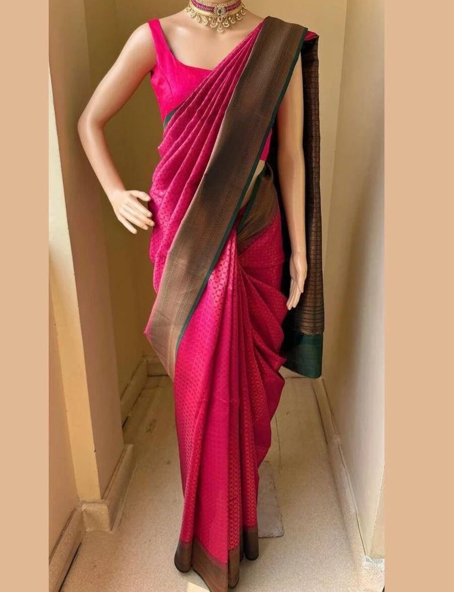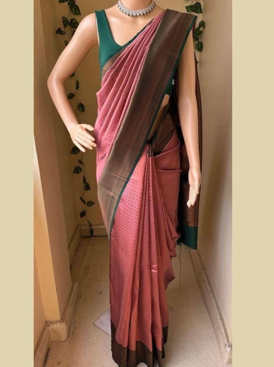SAREE : FABRIC : SOFT LICHI SILK DESIGN : BEAUTIFUL RICH PALLU & JACQUARD BORDER COPPER WORK LENGTH : 5.5 METER BLOUSE : FABRIC : RUNING WORK : COPPER ZARI WEAVING WORK LENGTH : 0.80 METER ...