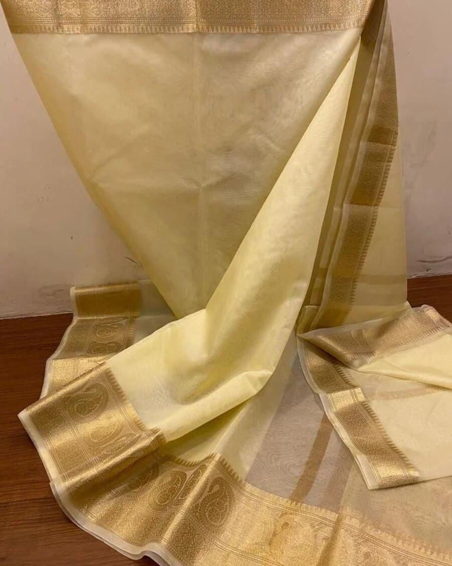SAREE :- PURE ORGANZA WEAVING SAREE WITH CHITT PALLU COPPER ZARI KUBERA BORDER BLOUSE :- ORGANZA WITH RUNNING BLOUSE 5.5 METER SAREE WITH UNSTITCHED BLOUSE