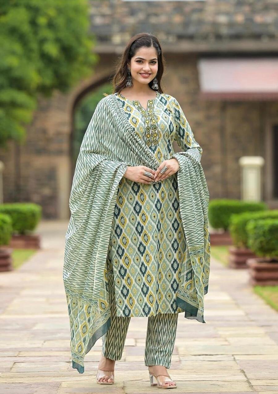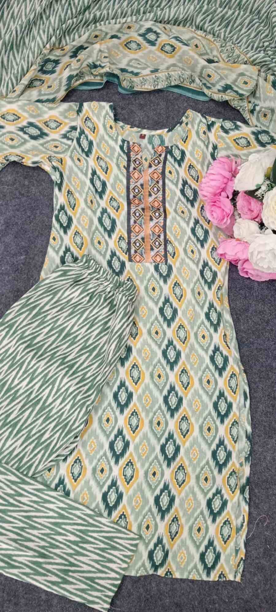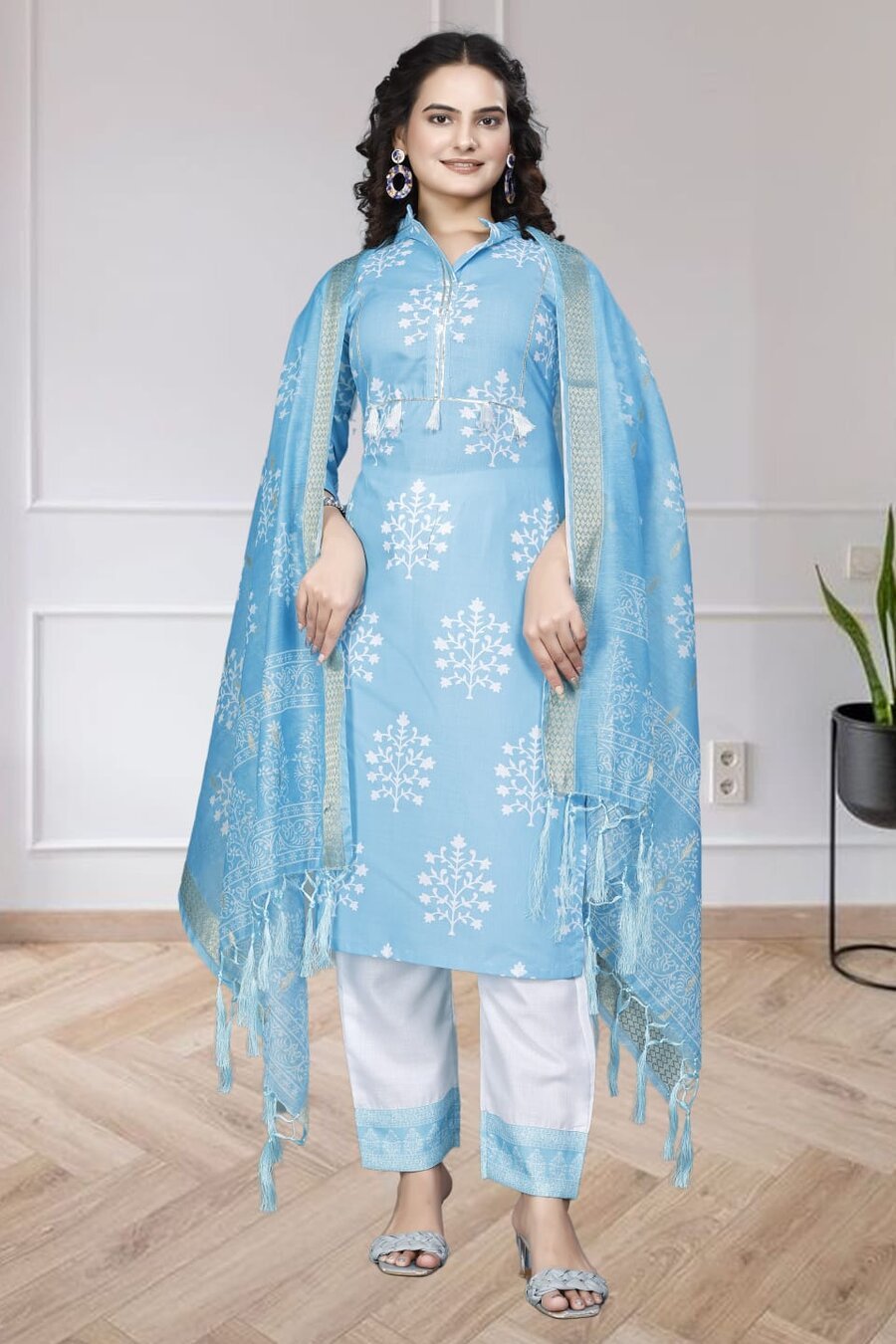 TOP FABRIC :- COTTON WITH BEAUTIFUL DIGITAL PRINT BOTTOM FABRIC :- COTTON WITH BEAUTIFUL DIGITAL PRINT DUAPPTA FABRIC :- CHANDERI PRINT WITH ZARI BORDER DUAPPTA LENGTH :- 2 METER SIZE :- M ,L ,XL, XXL ,3XL ...