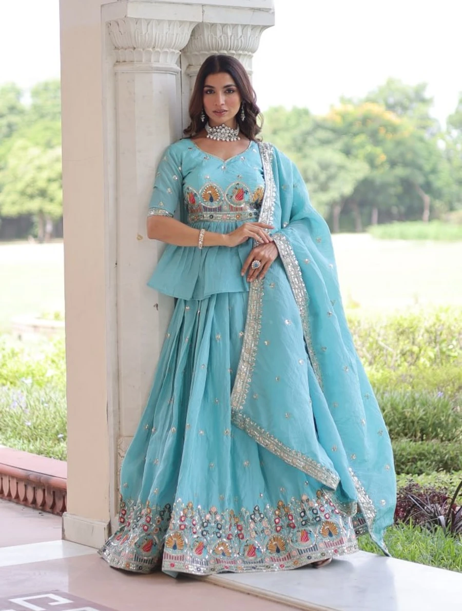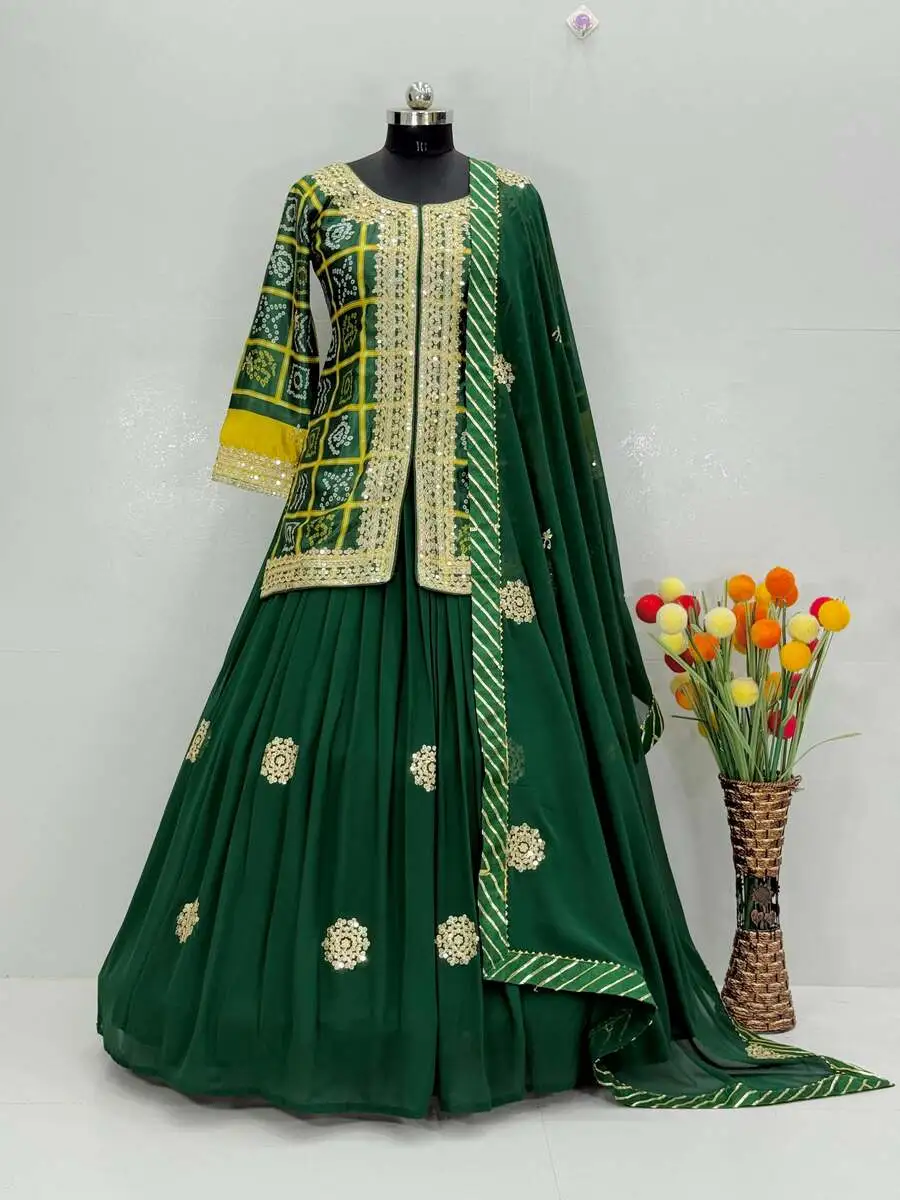 DESIGNER BUTTRFLY NET THREAD WITH SEQUENCE WORK SHRUG BLOUSE AND LEHENGA PARROT GREEN