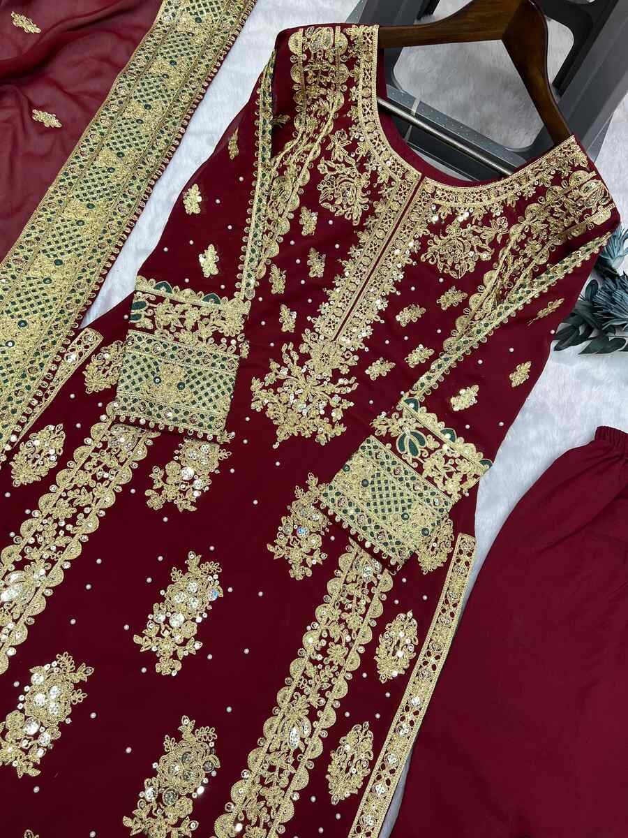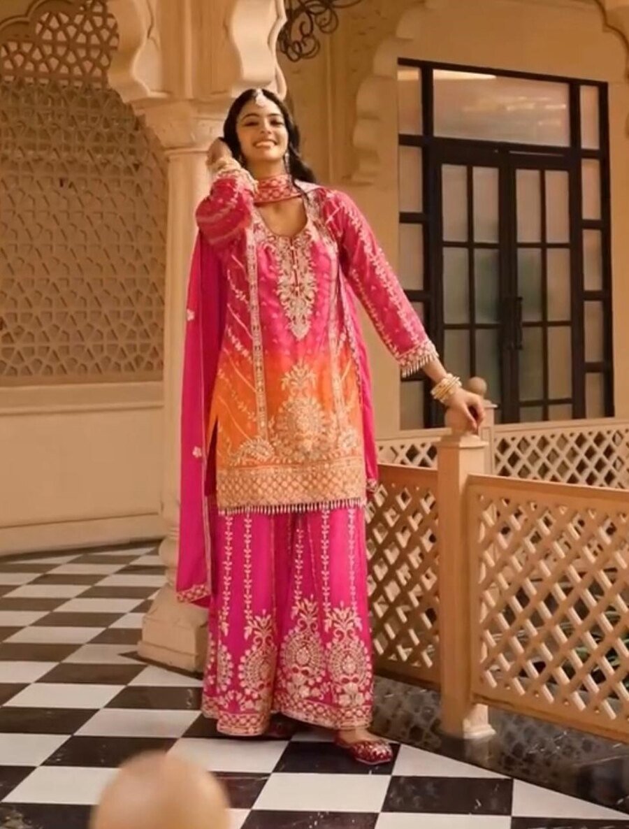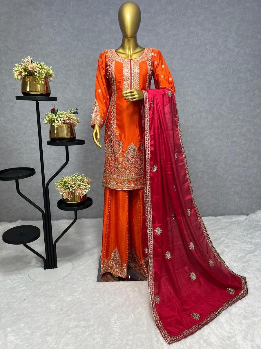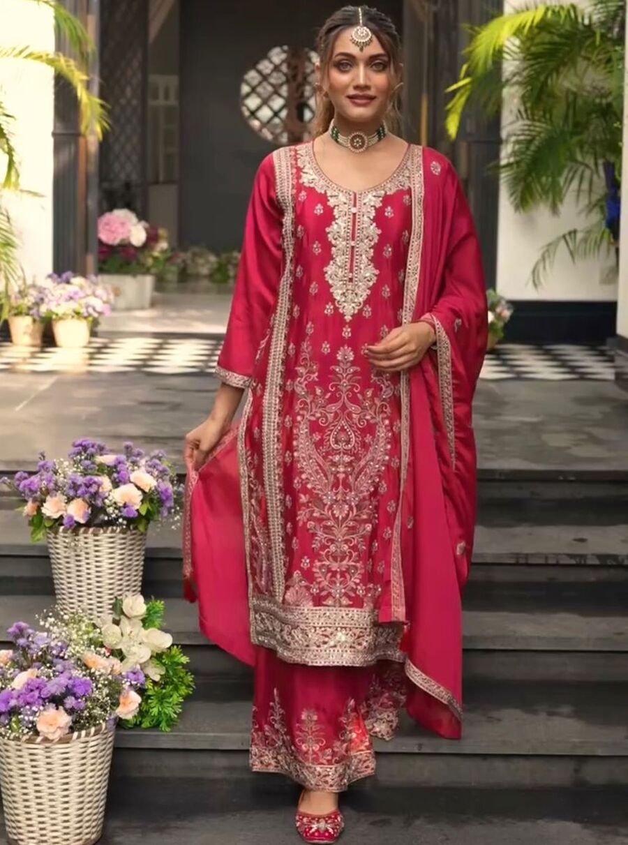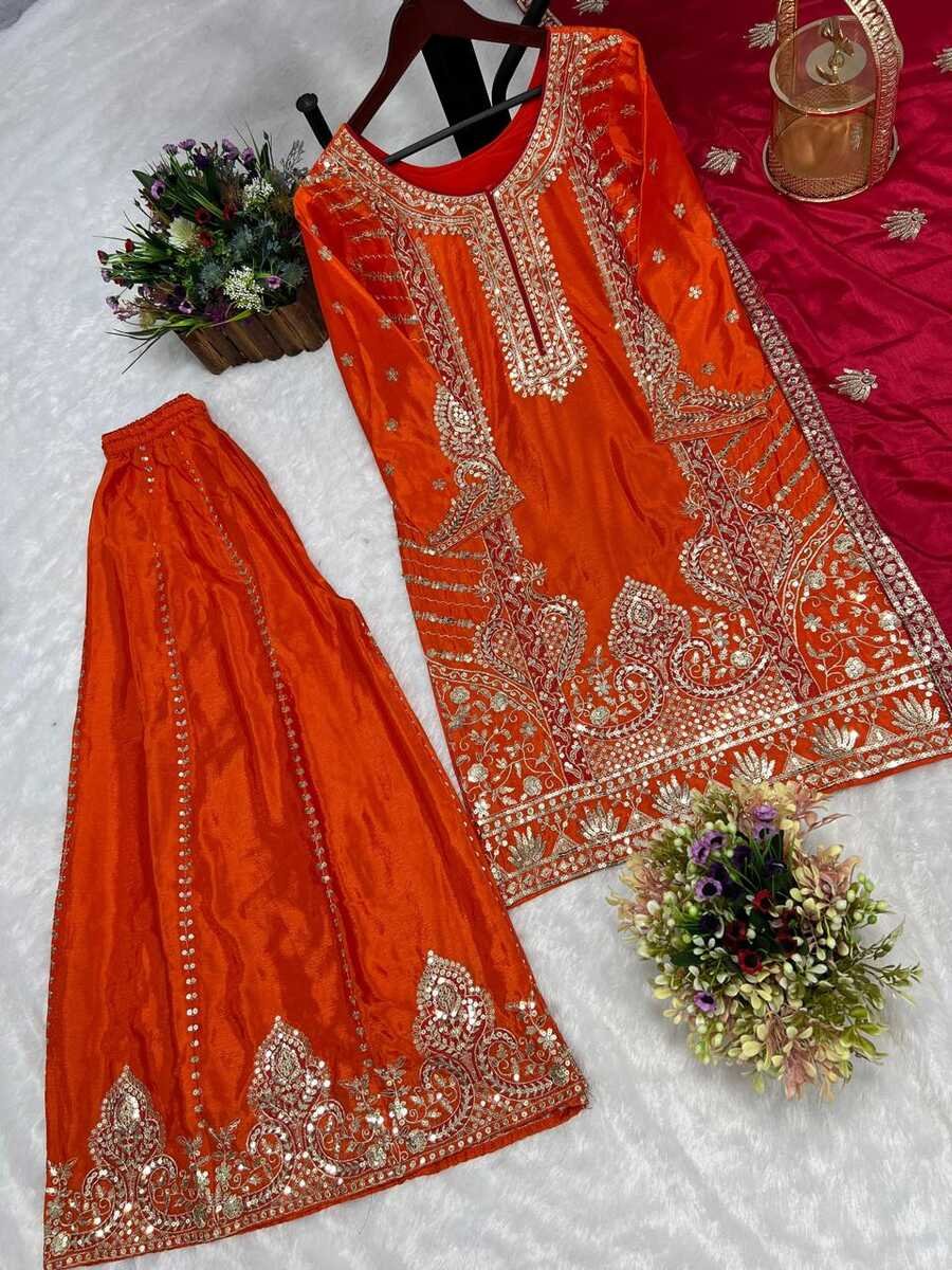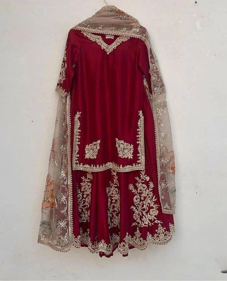 DESIGNER CHINON THREAD EMBROIDERY SEQUENCE WORK TOP PALAZZO WITH DUPATTA RED