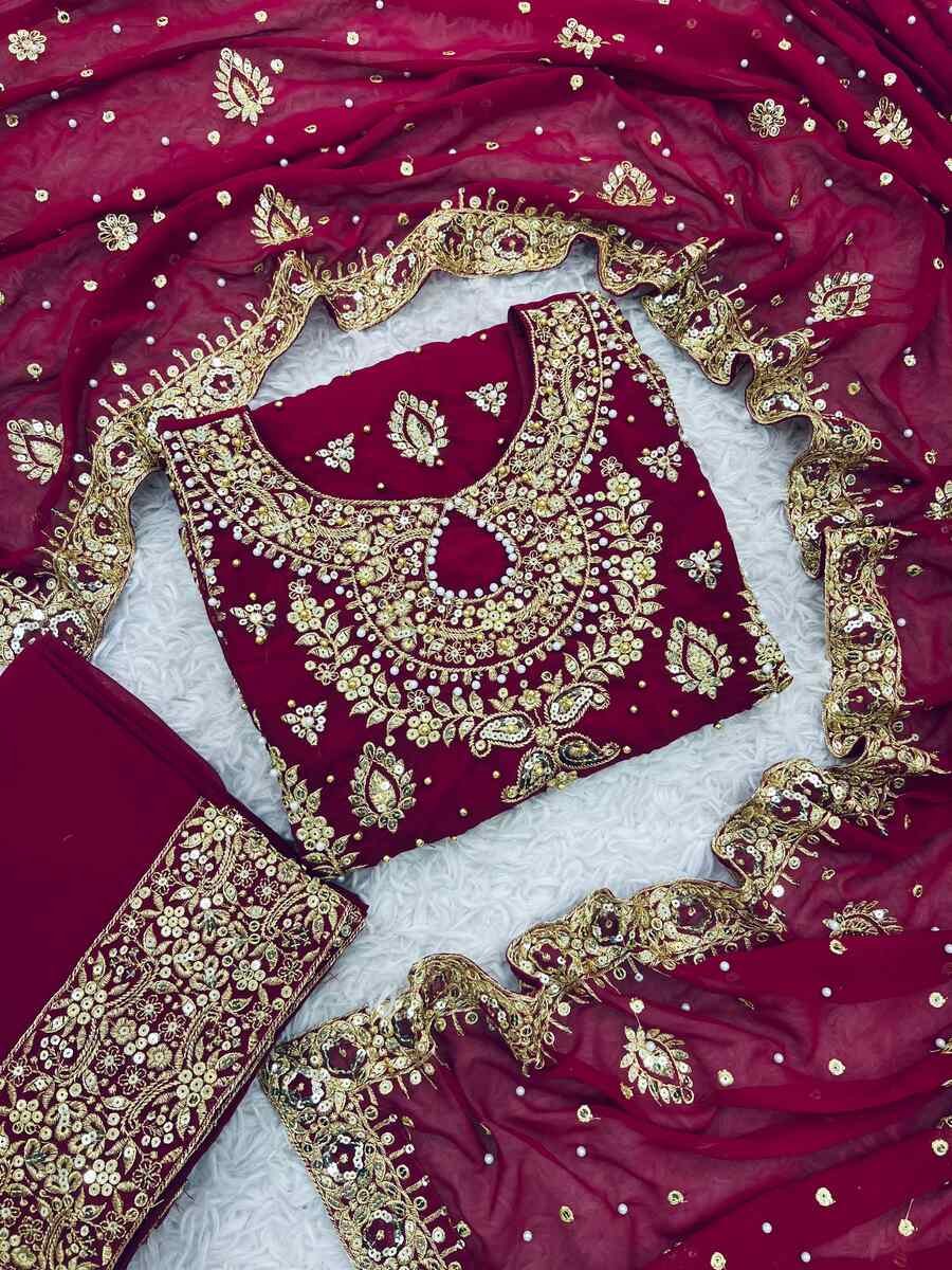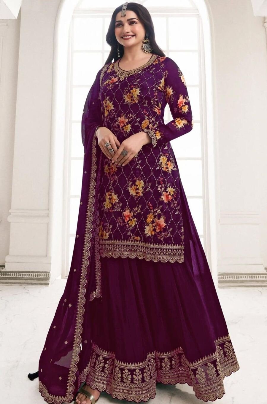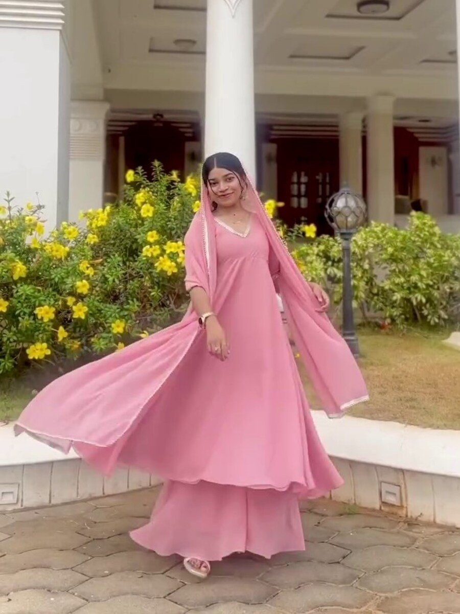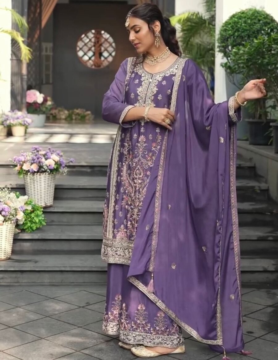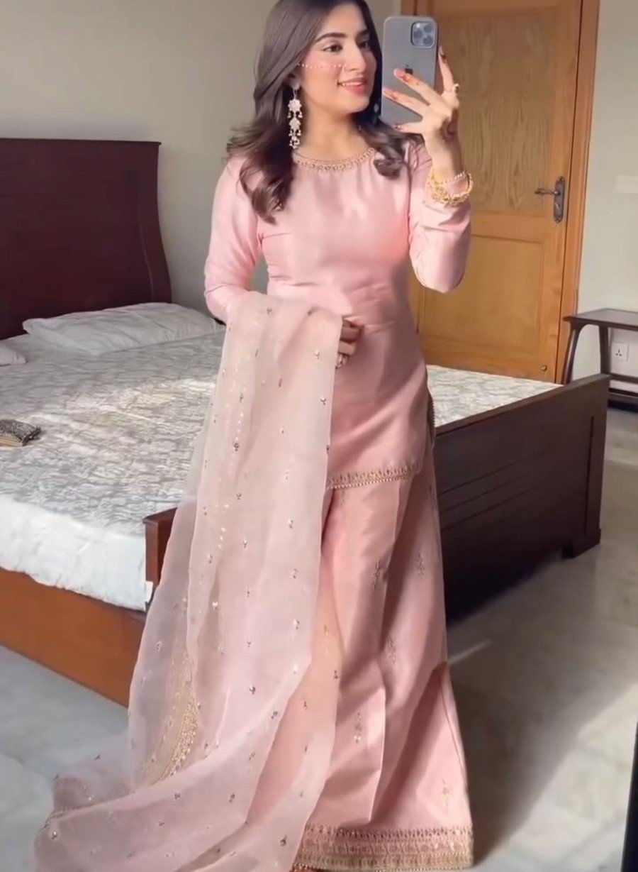 DESIGNER CHINON THREAD EMBROIDERY SEQUENCE WORK TOP PALAZZO WITH DUPATTA RED