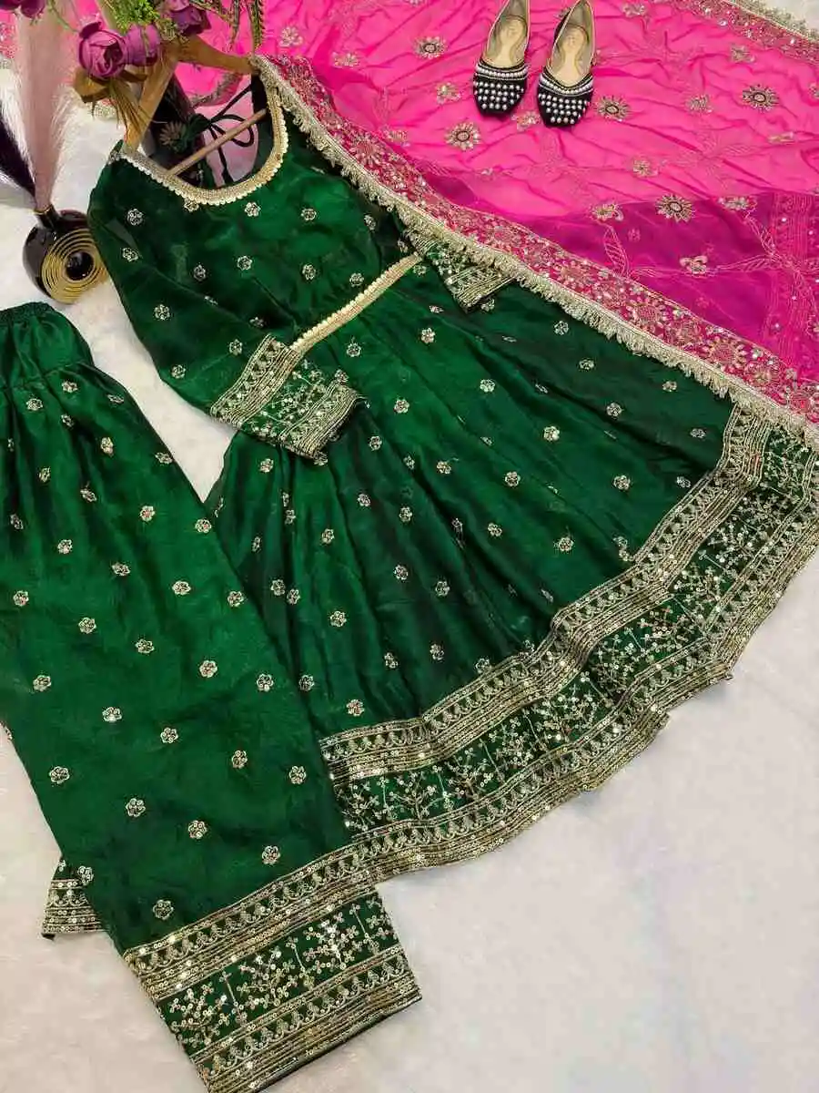 RICH LOOK CHINON SEQUENCE EMBROIDERY WORK TOP PATIYALA WITH DUPATTA PINK AND OFF WHITE