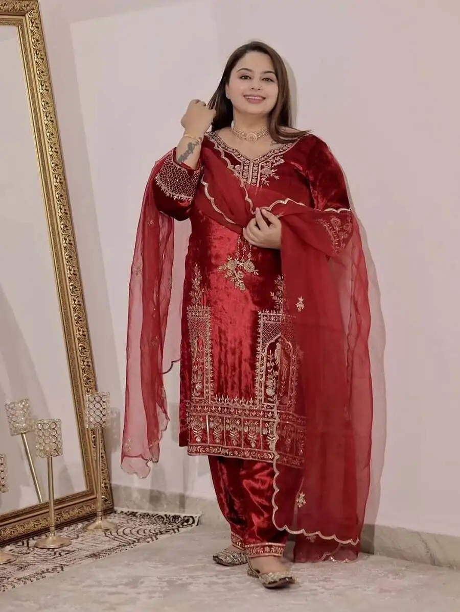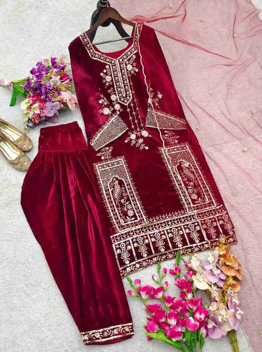 TOP : FABRIC : PURE VISCOSE VELVET WORK : EMBROIDERY THREAD AND SEQUENCE WORK WITH FULL SLEEVE INNER : HEAVY MICRO COTTON LENGTH : 34-35 INCH SIZE : M(38), L(40), XL(42), XXL(44) (FULLY STITCHED READY TO ...