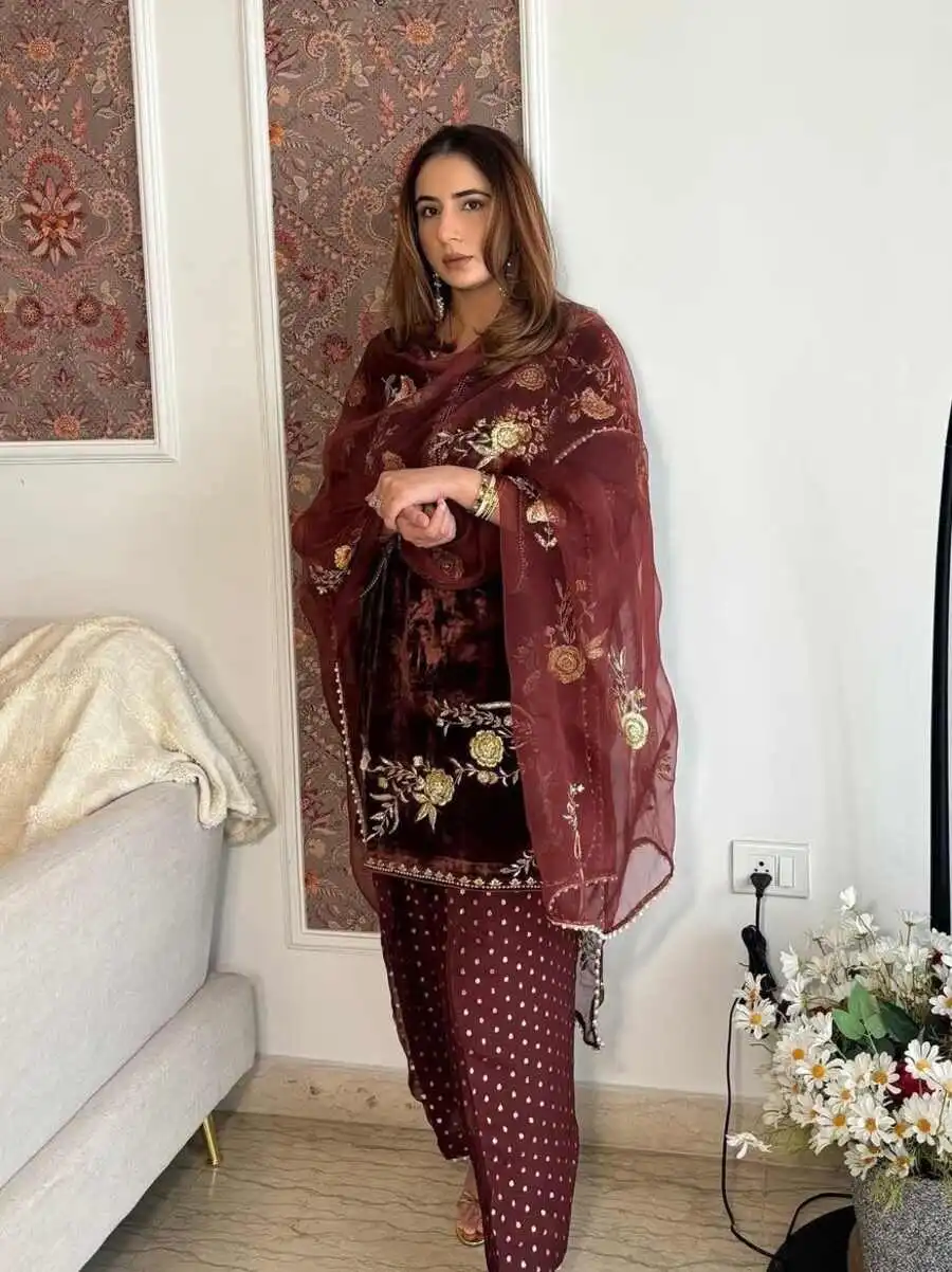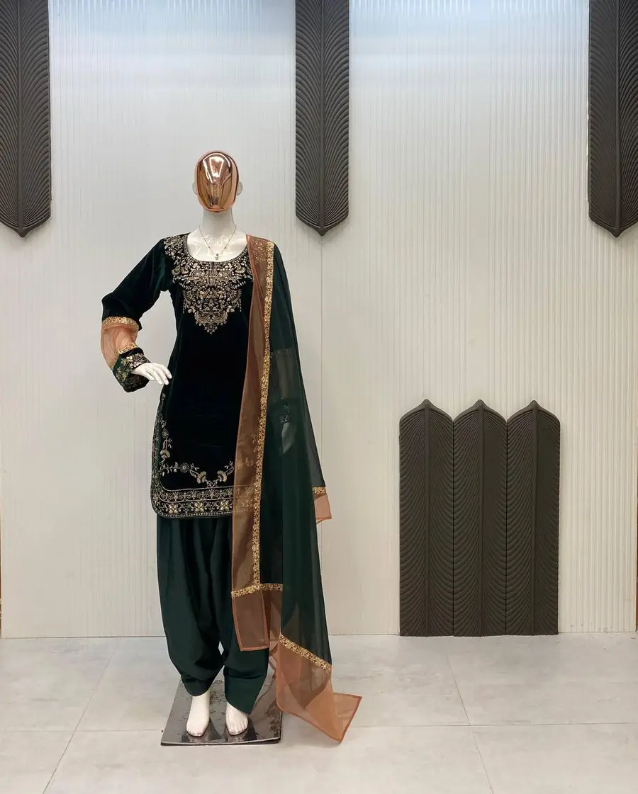 TOP : FABRIC : CHINON WORK : HEVAY SEQUENCE EMBROIDERY WORK FRONT AND BACK SIDE INNER : MICRO HEIGHT : 46”INCH SIZE : M-38” ,L-40” , XL-42” , XXL-44” PATIYALA : FABRIC : CHINON WORK : ...