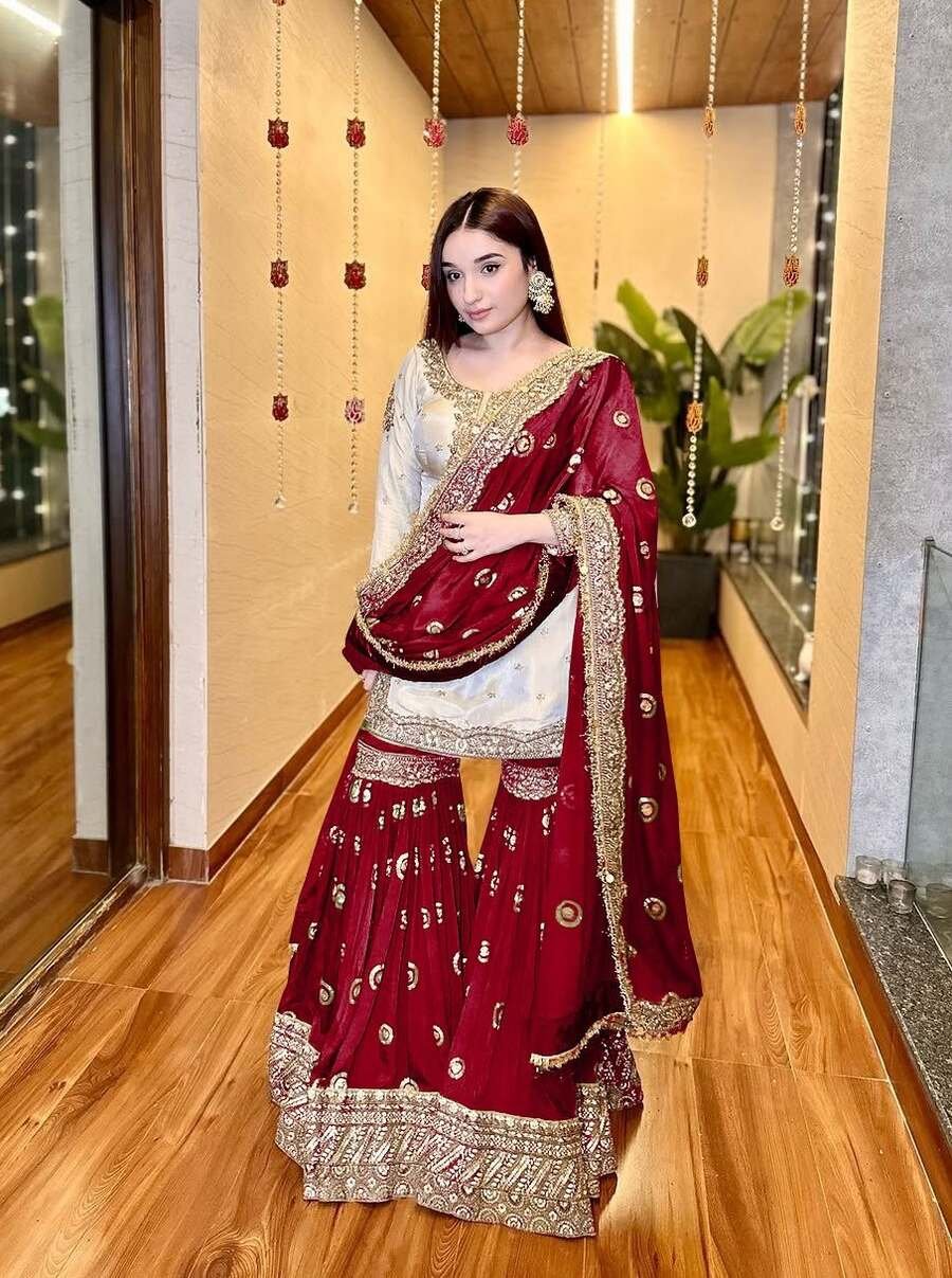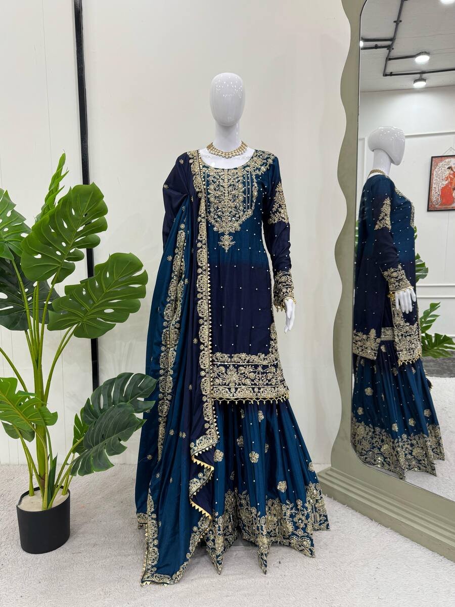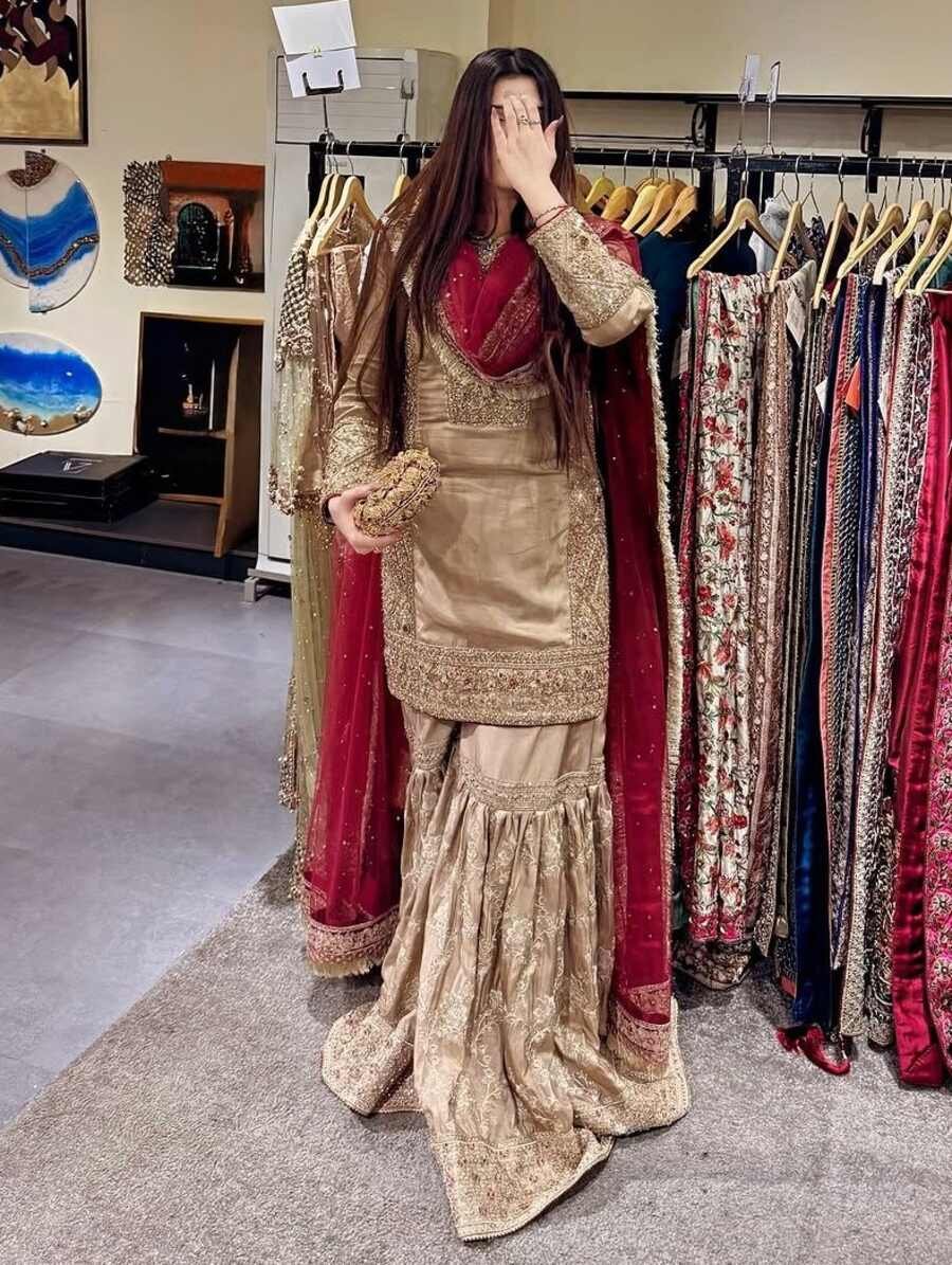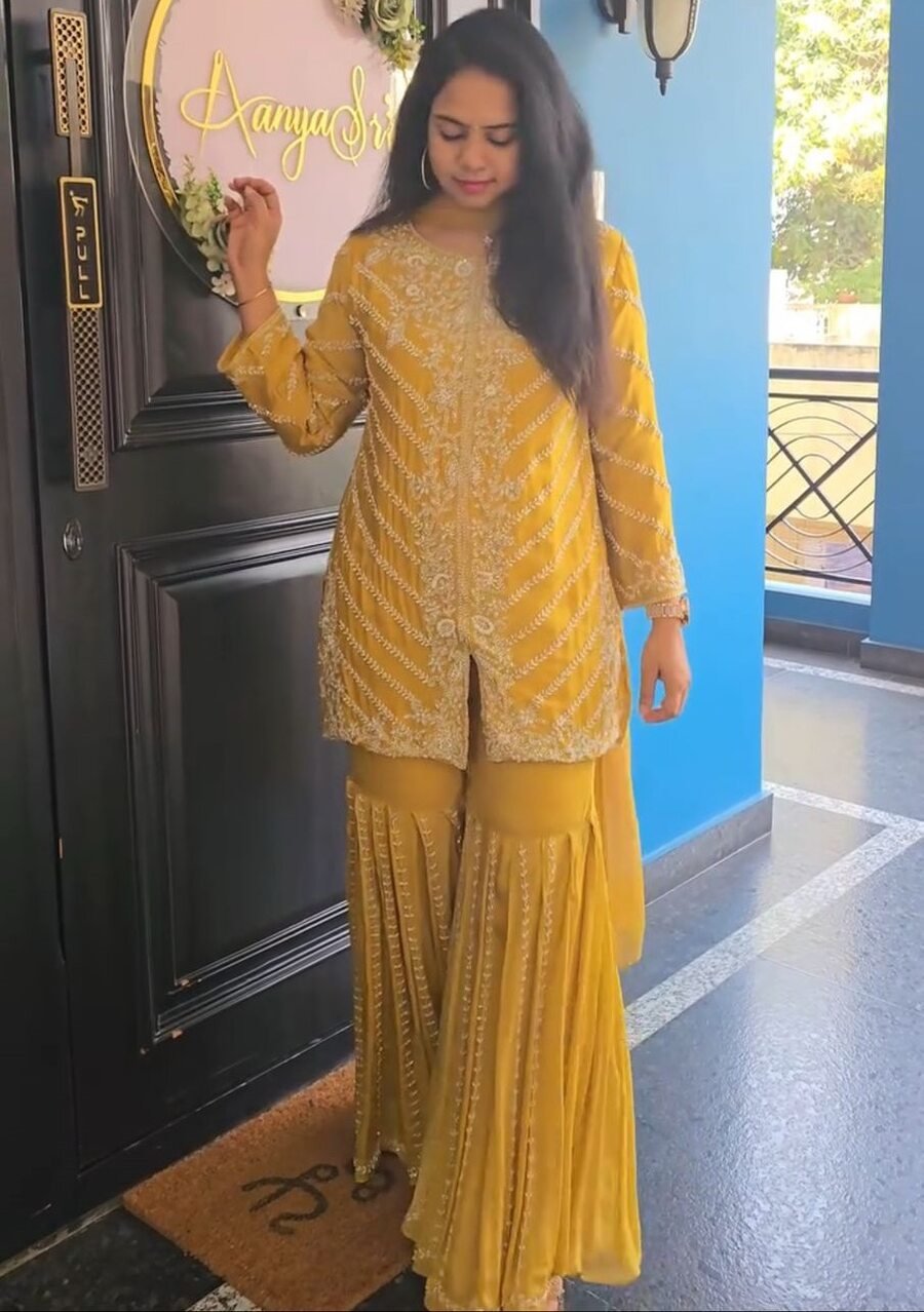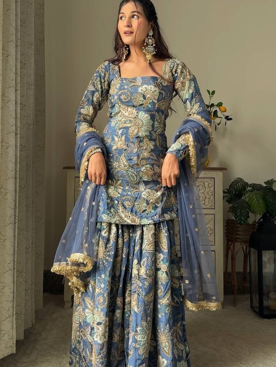FANCY CHINON SEQUENCE EMBROIDERY WORK NAYRA CUT KURTI SHARARA WITH DUPATTA MEHNDI
