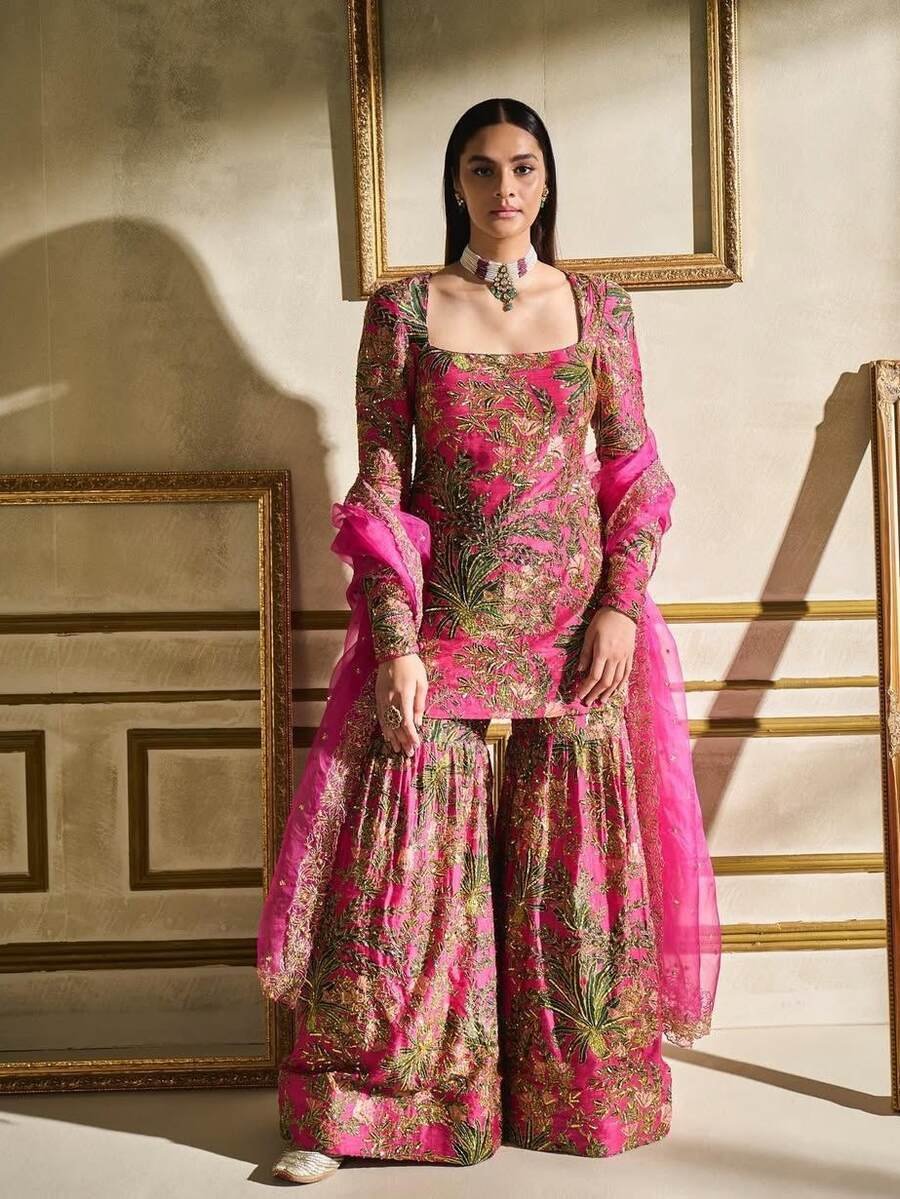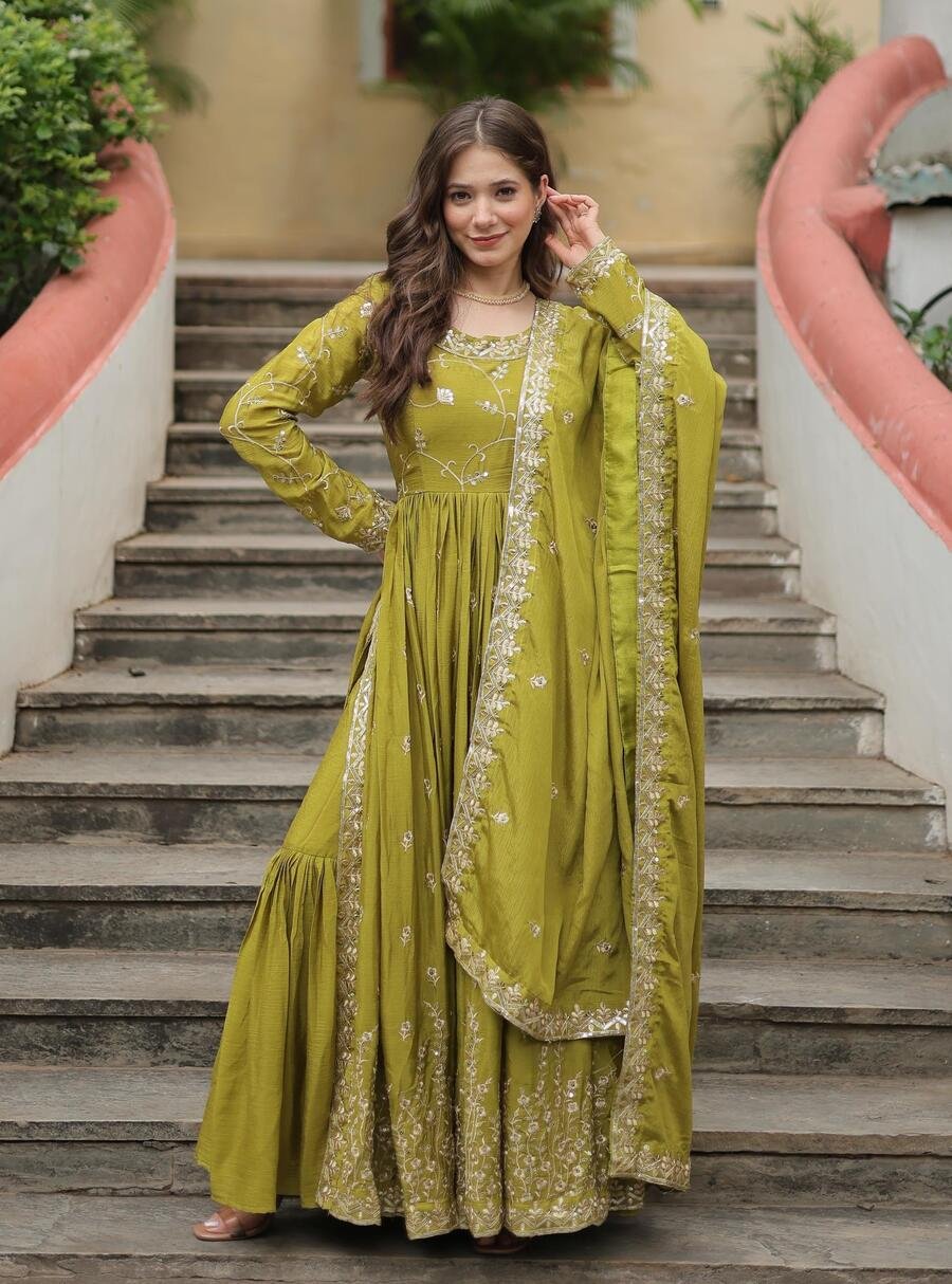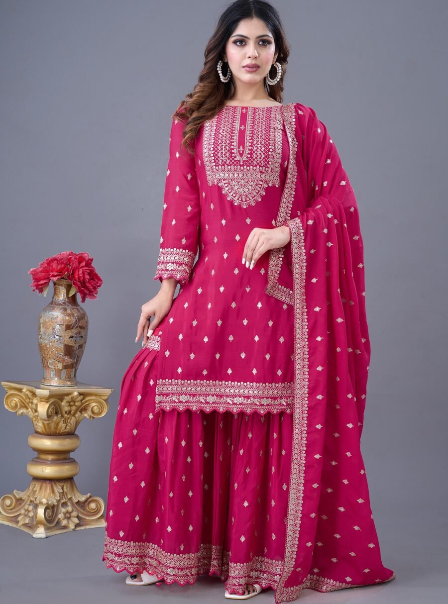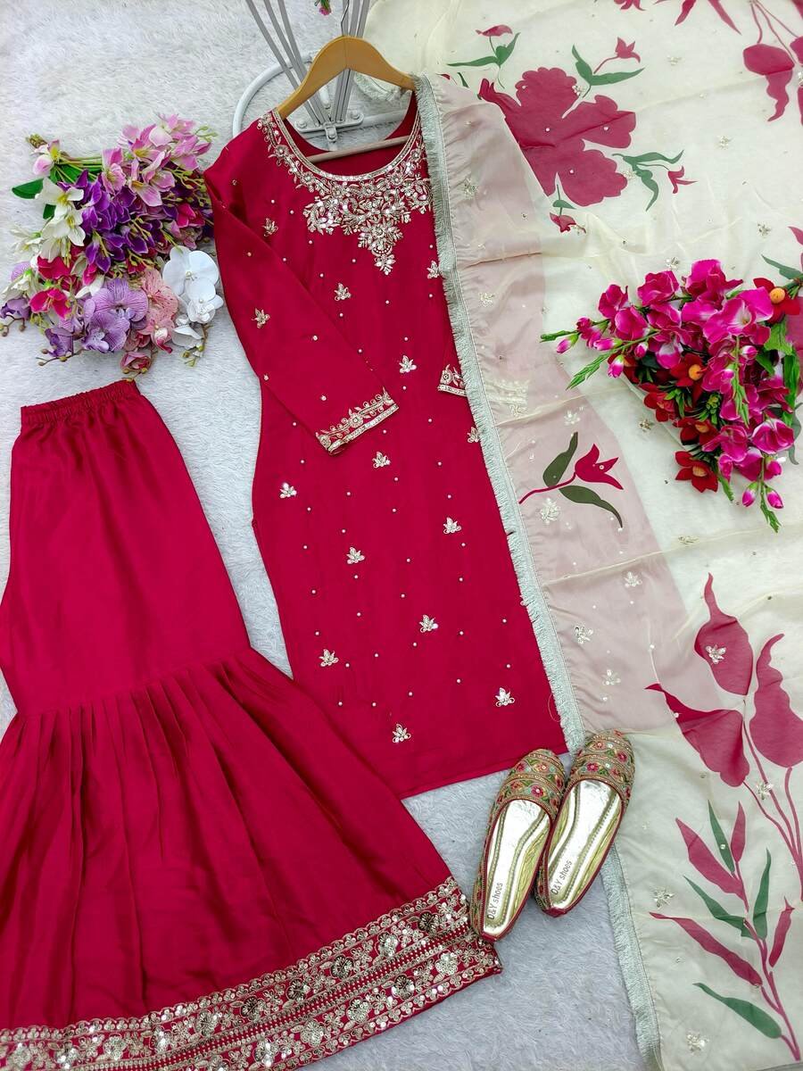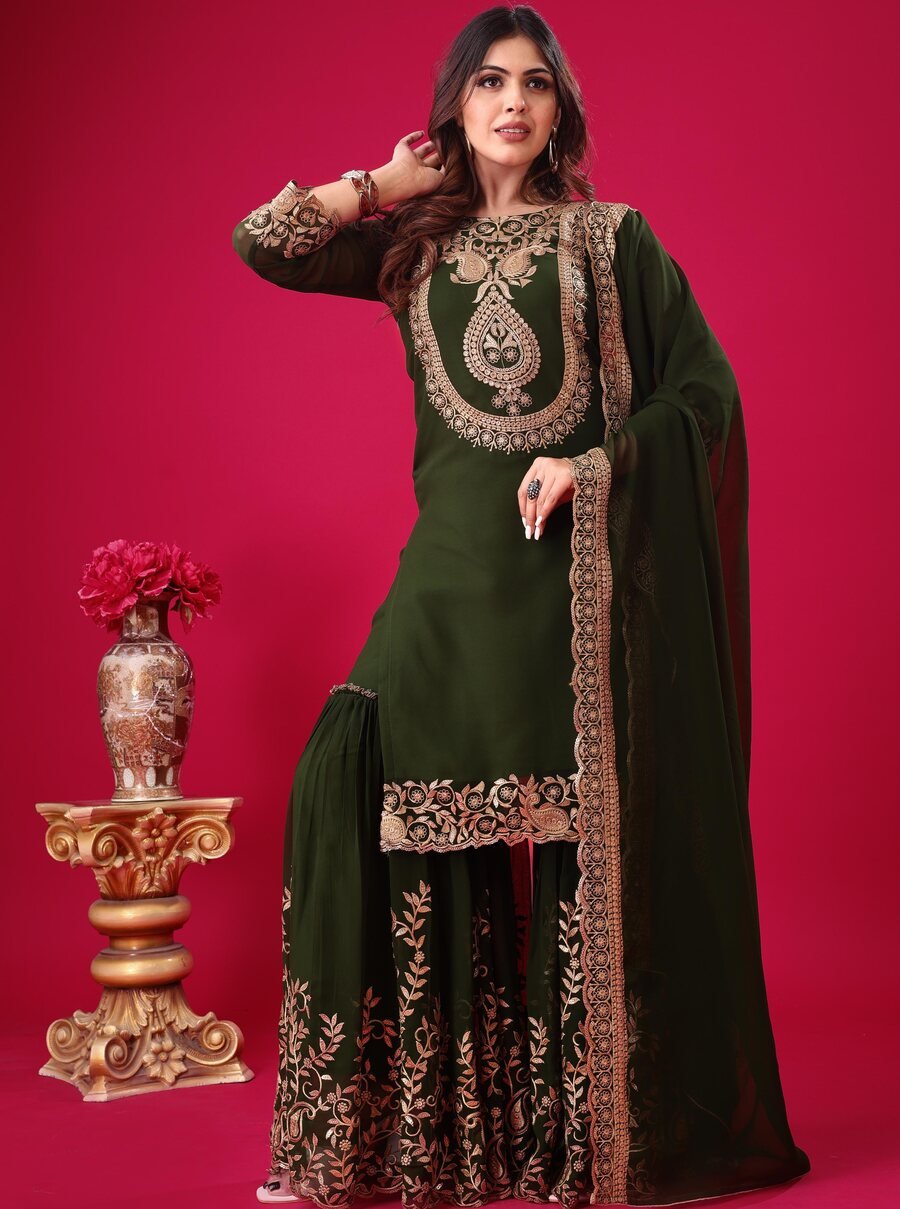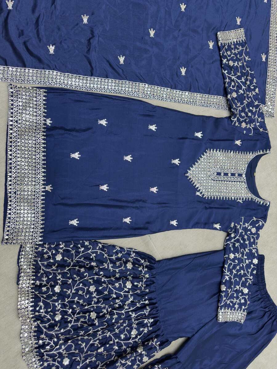 FANCY CHINON SEQUENCE EMBROIDERY WORK NAYRA CUT KURTI SHARARA WITH DUPATTA MEHNDI