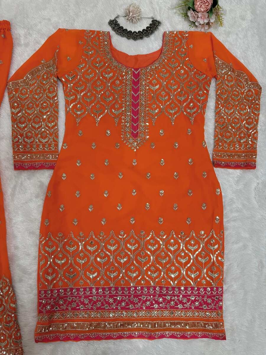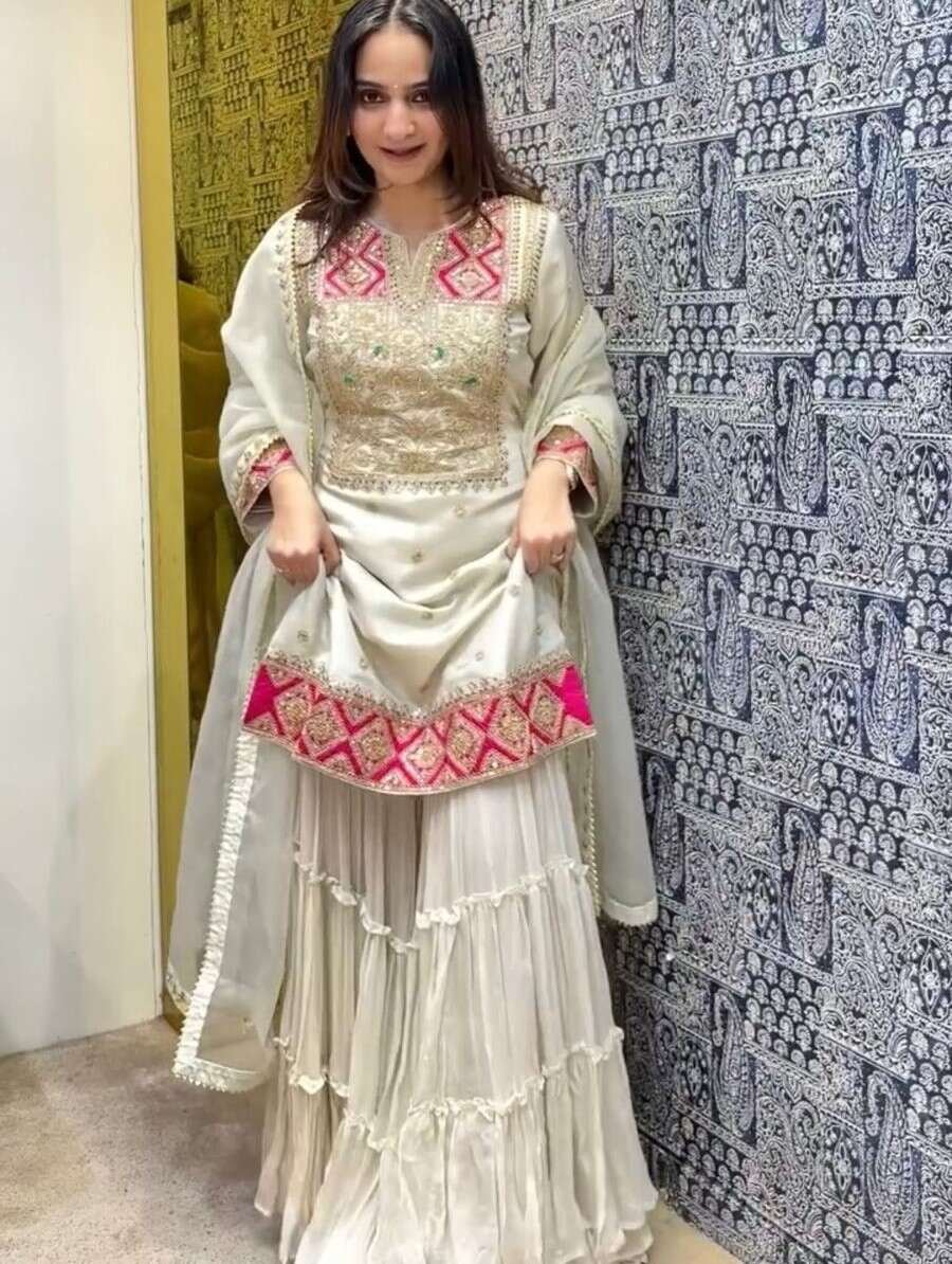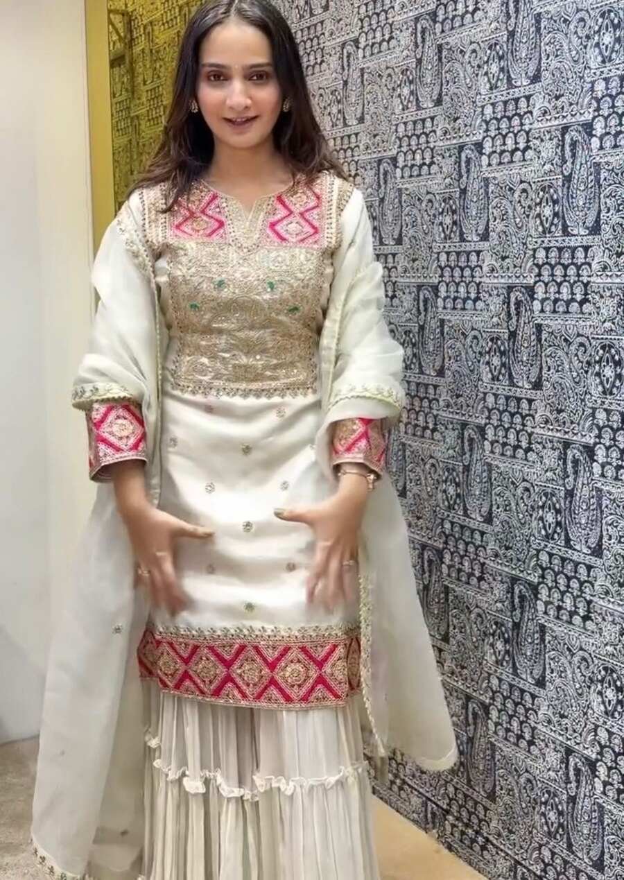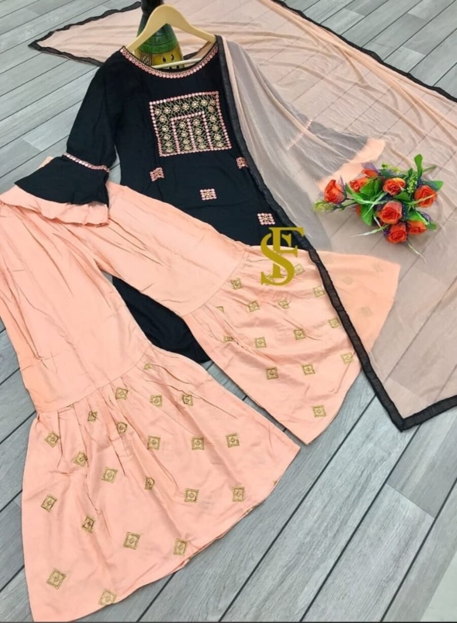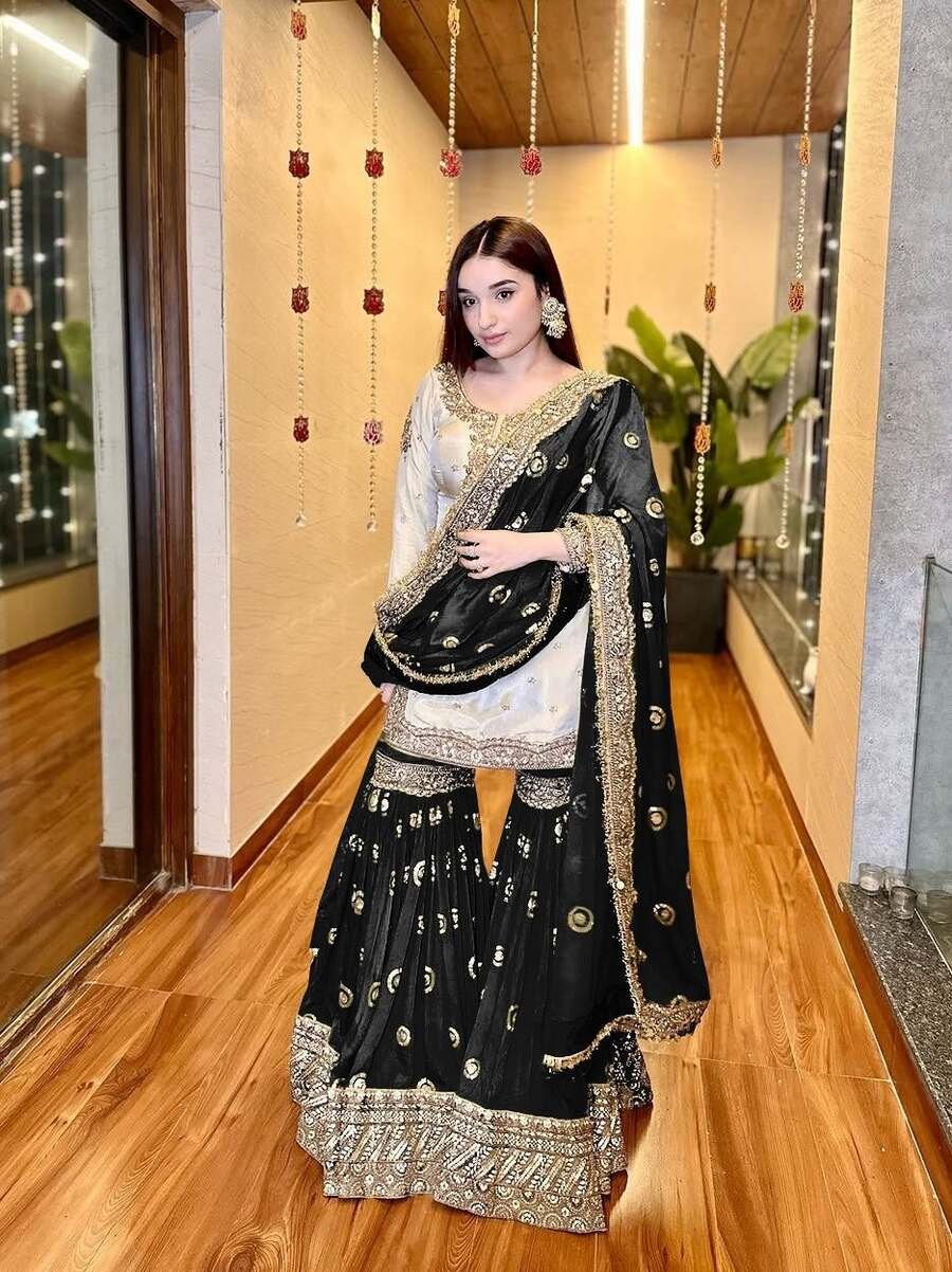TOP : TOP FABRIC : HEAVY CHINON TOP WORK : HEAVY EMBROIDERY SEQUENCE WORK TOP INNRT : SOFT SILK TOP SIZE : MAX UP TO 44 INCH TOP LENGTH : 32 INCH SHARARA : SHARARA FABRIC ...