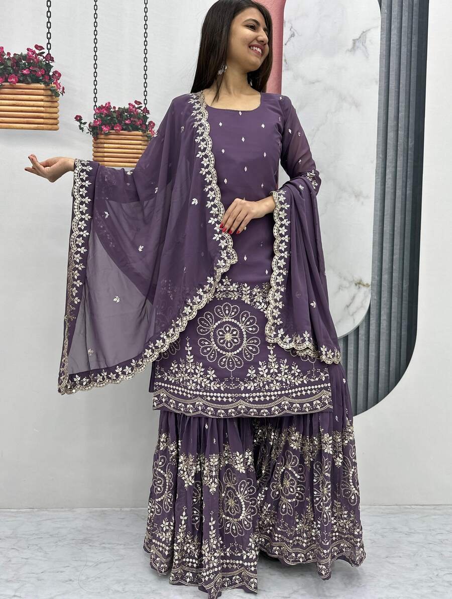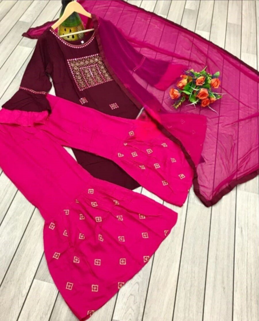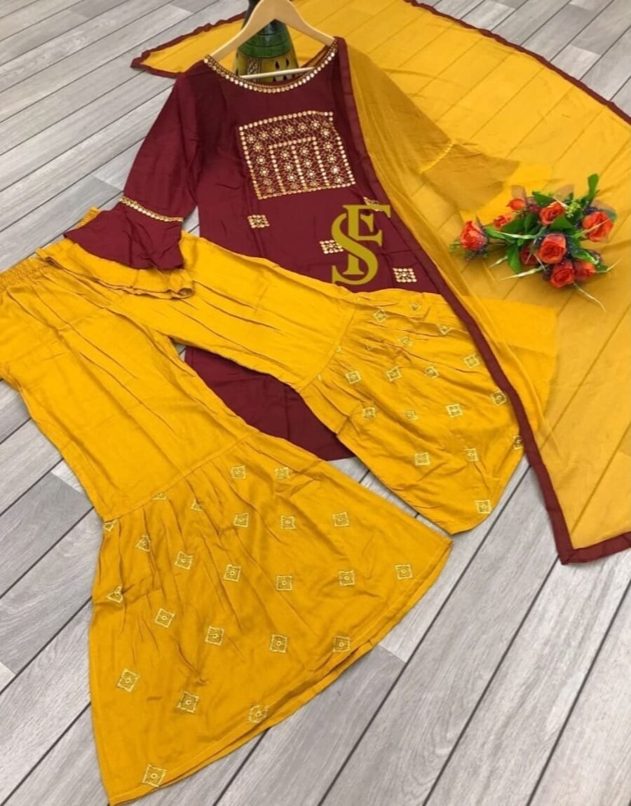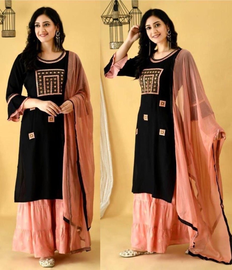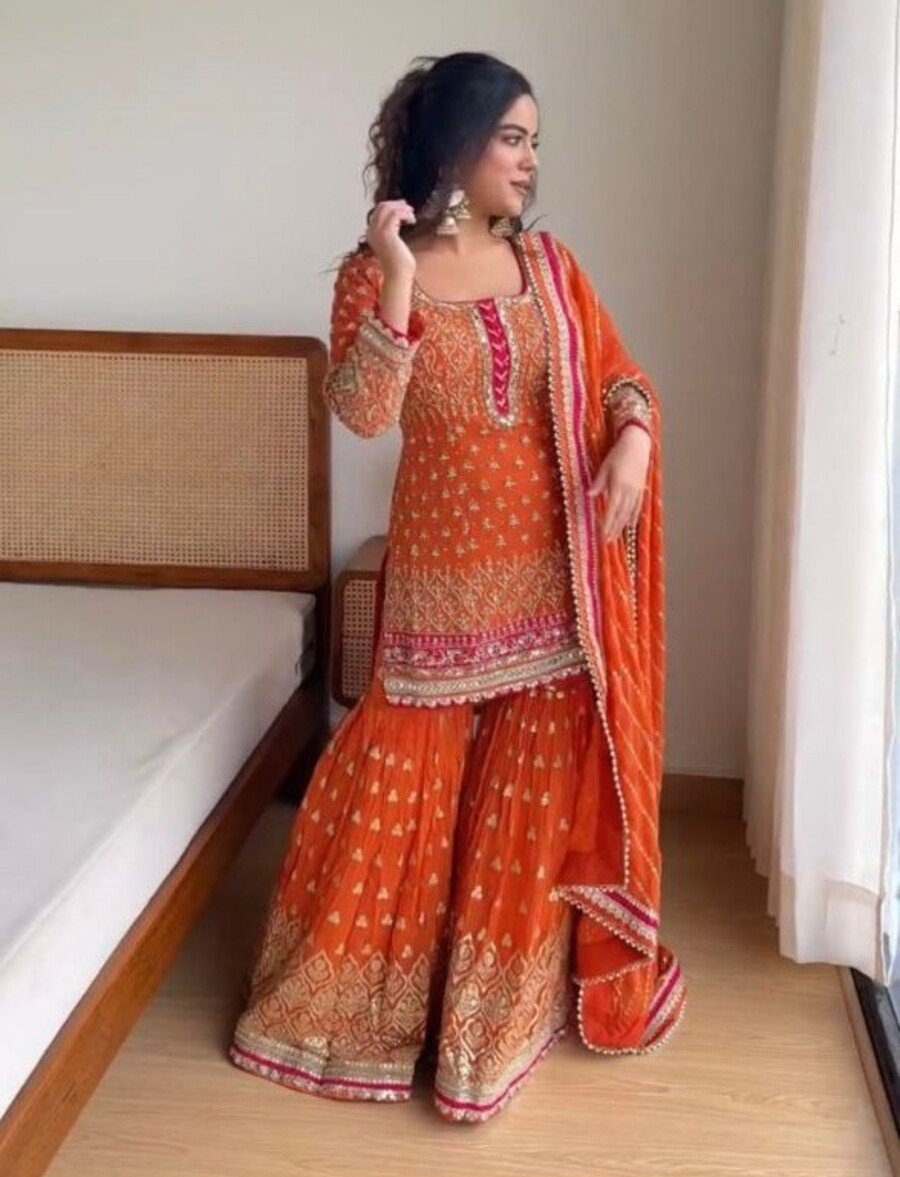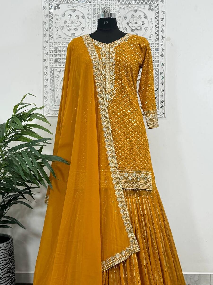 TOP : TOP FABRIC : HEAVY CHINON TOP WORK : HEAVY EMBROIDERY SEQUENCE WORK TOP INNRT : SOFT SILK TOP SIZE : MAX UP TO 44 INCH TOP LENGTH : 32 INCH SHARARA : SHARARA FABRIC ...