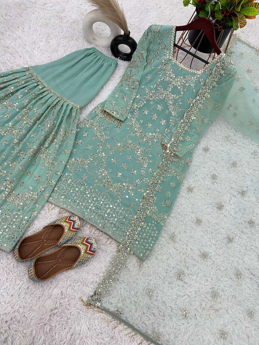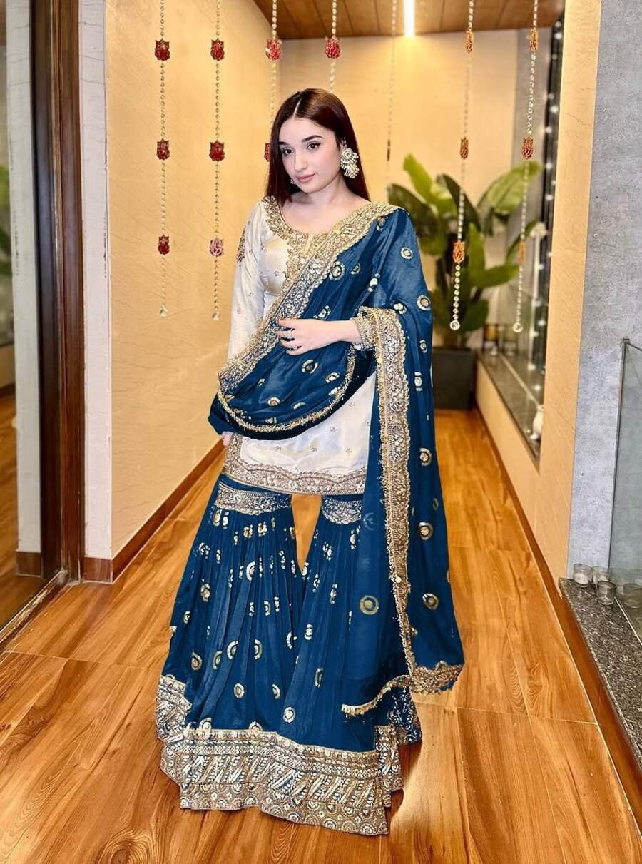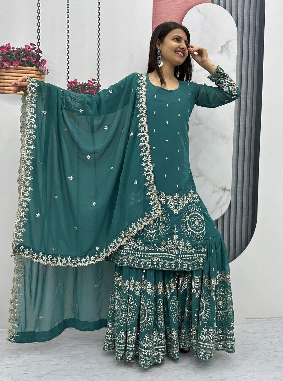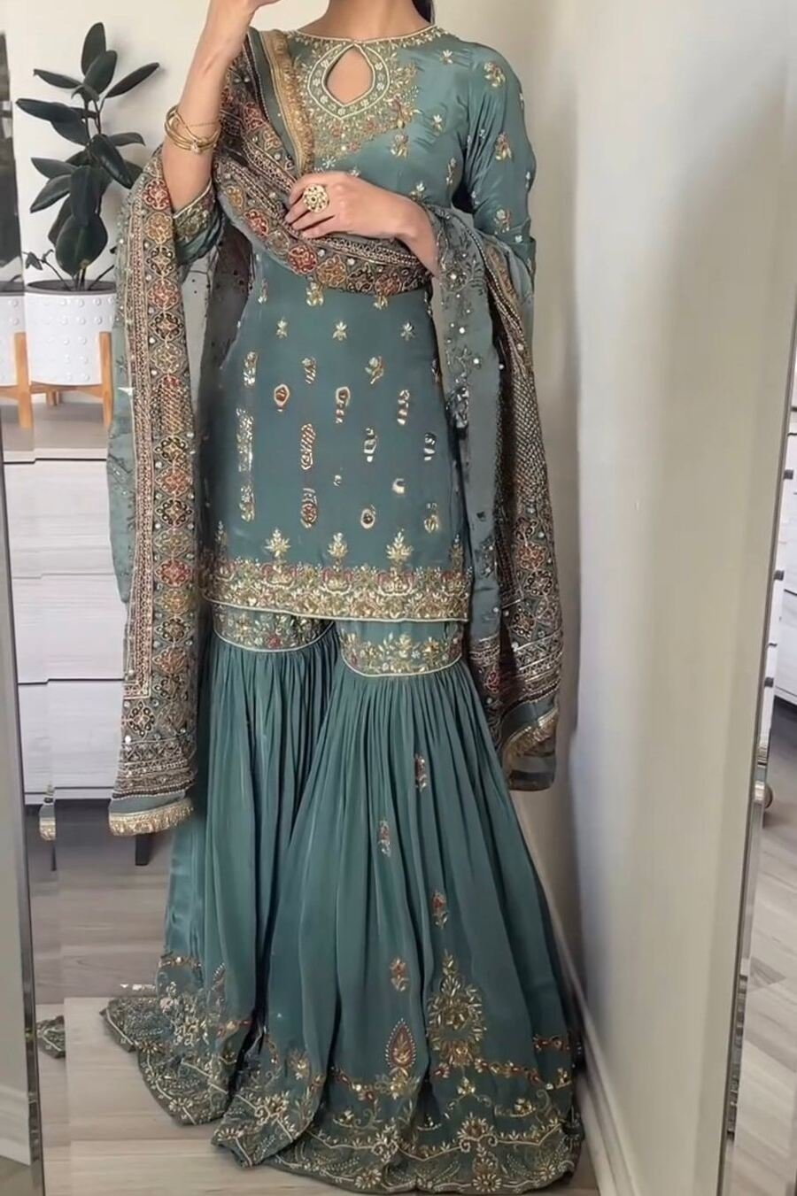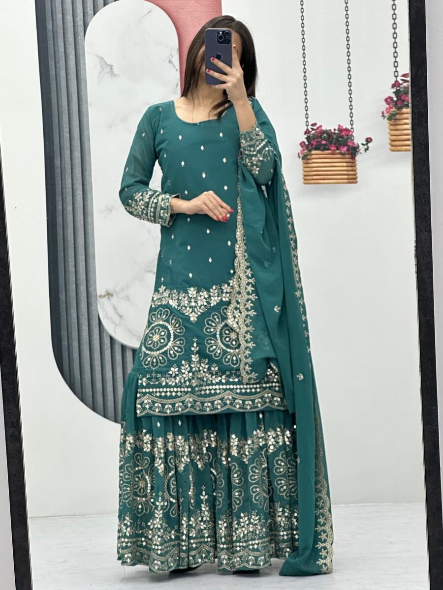 DESIGNER CHINON EMBROIDERY SEQUENCE WORK TOP SHARARA WITH DUPATTA TEAL