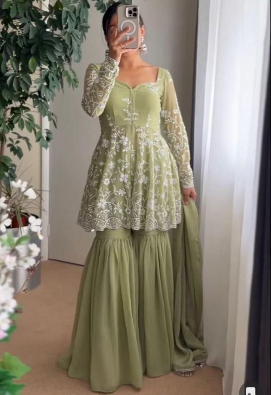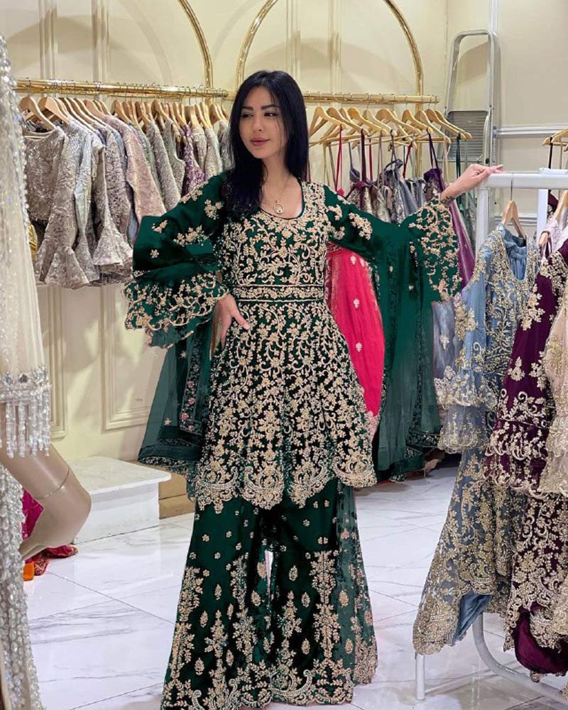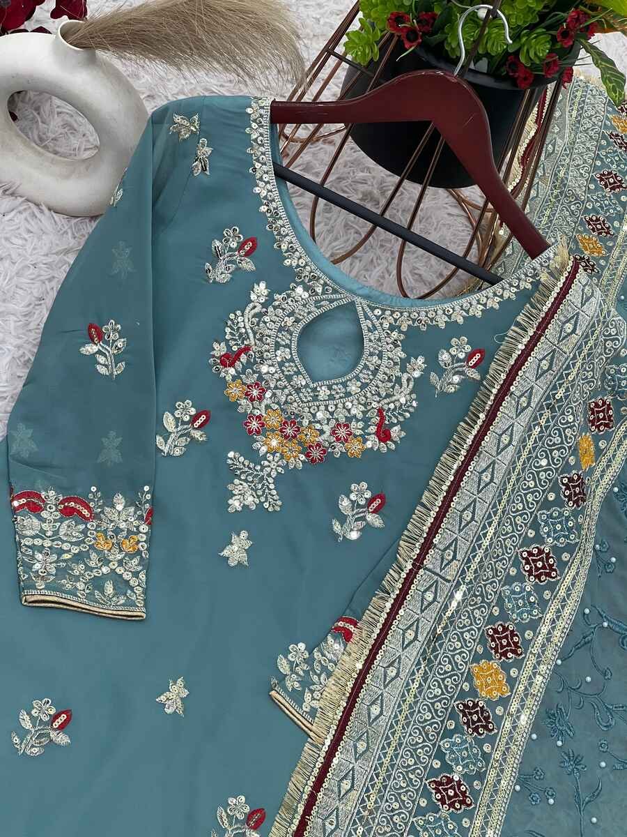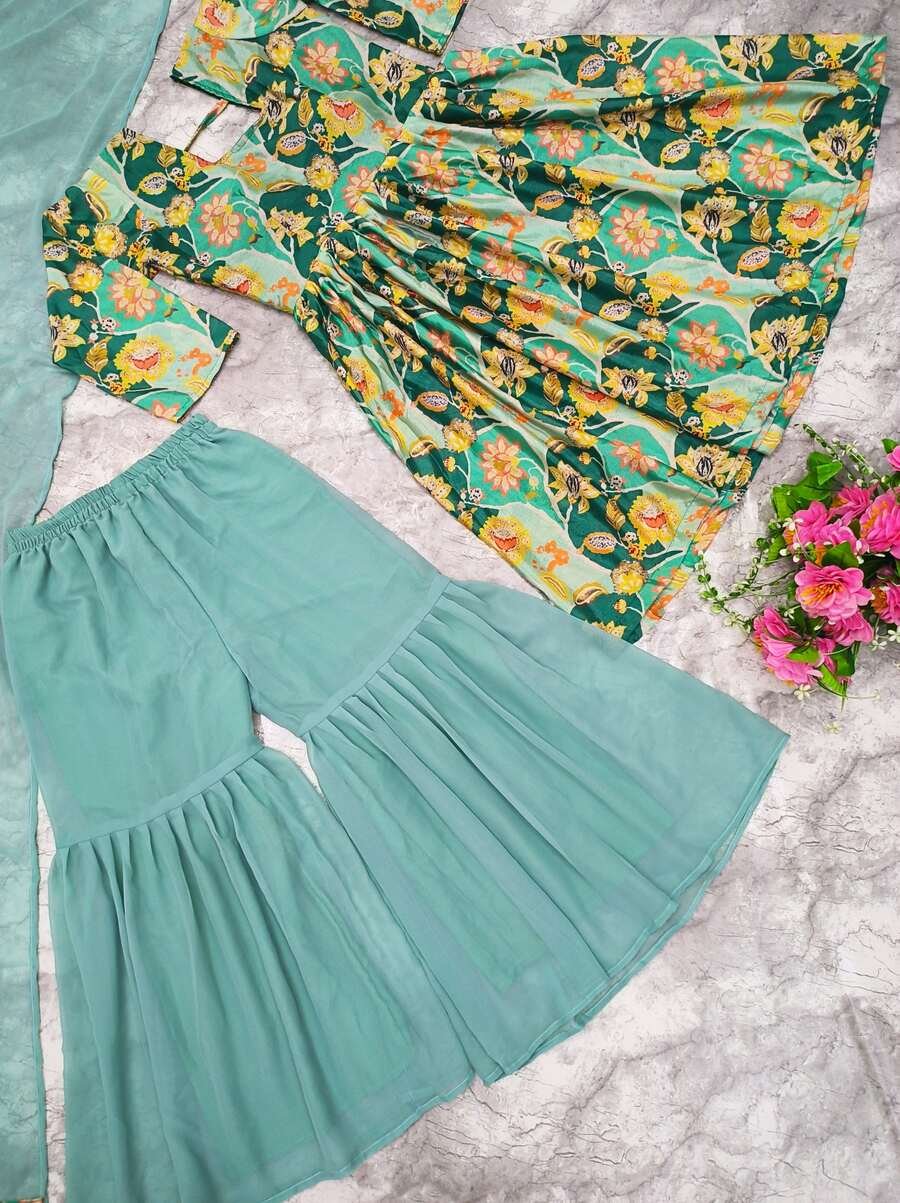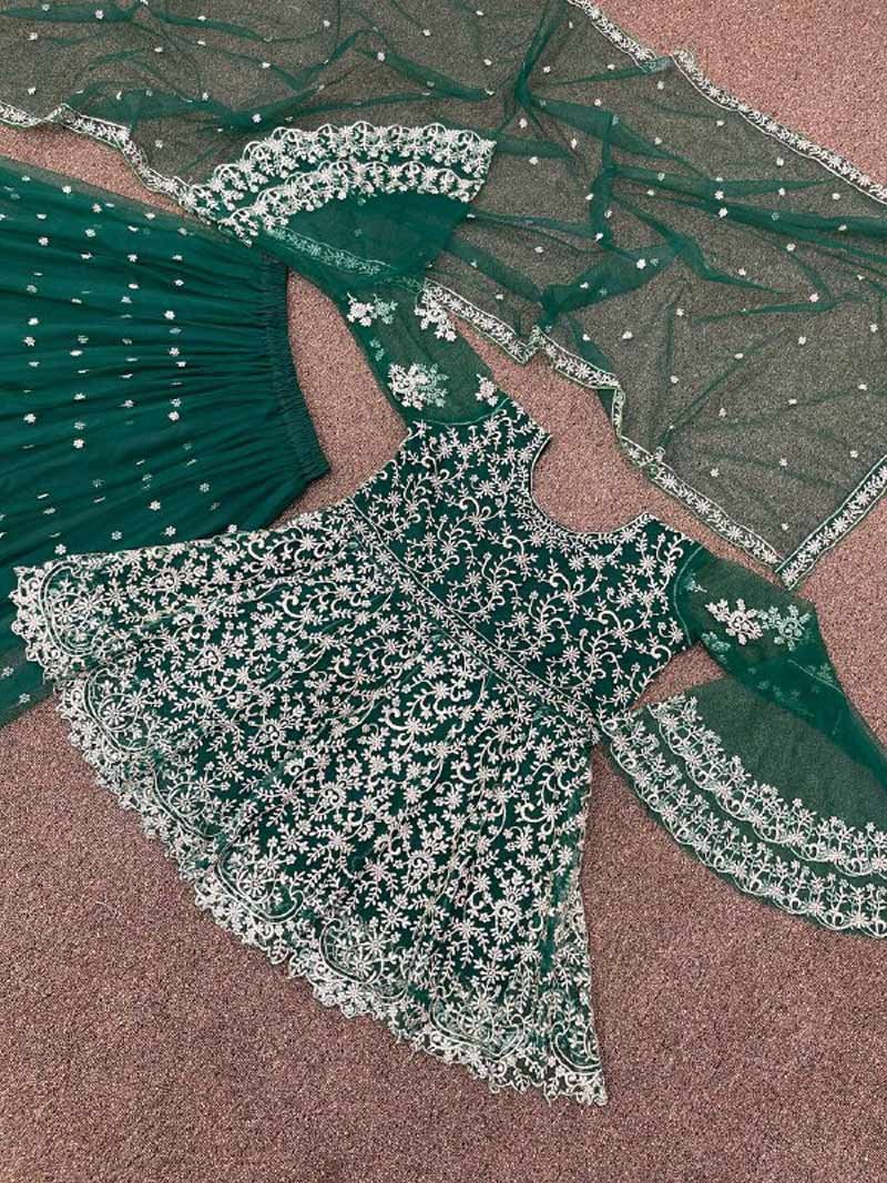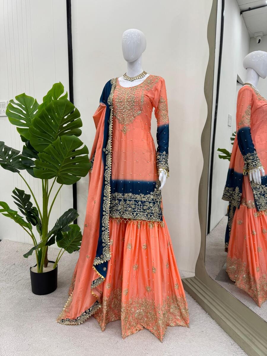 DESIGNER CHINON EMBROIDERY SEQUENCE WORK TOP SHARARA WITH DUPATTA TEAL