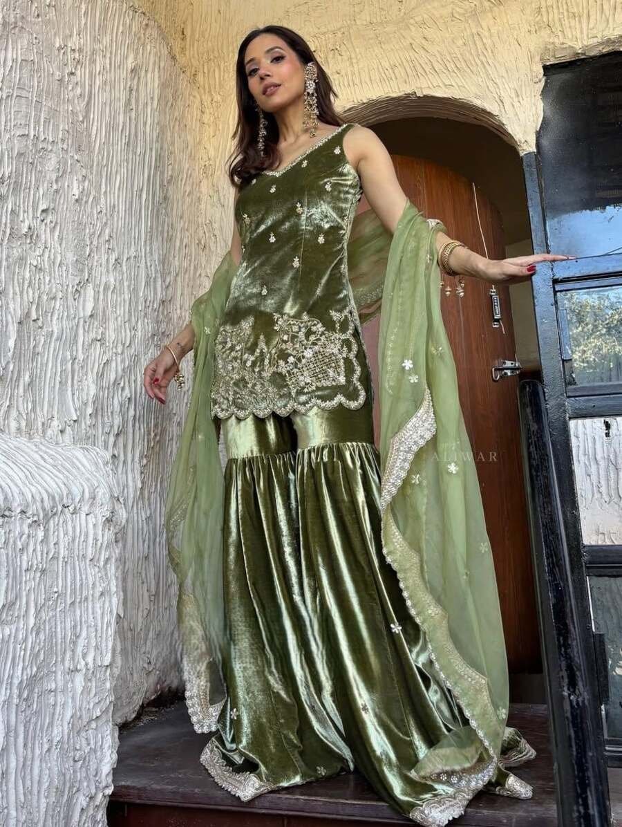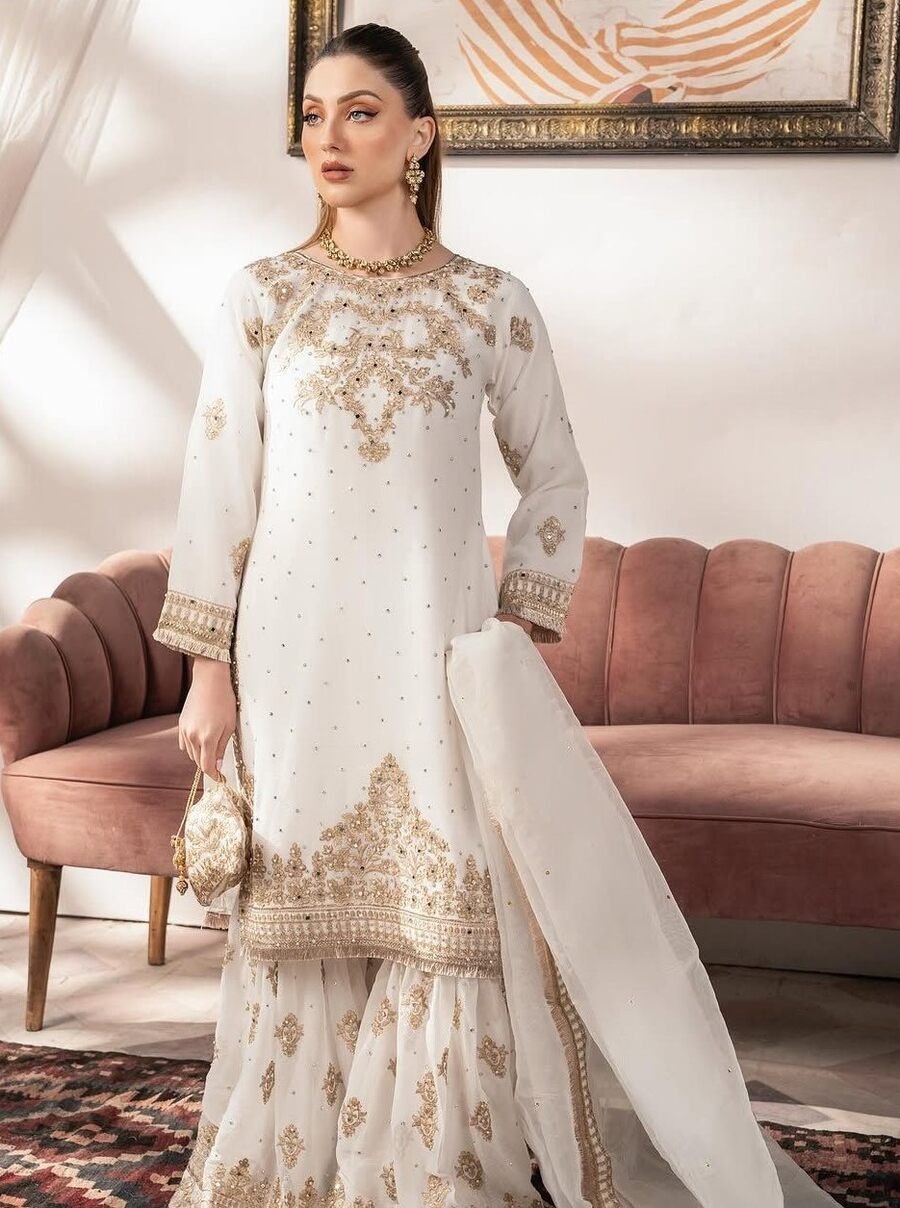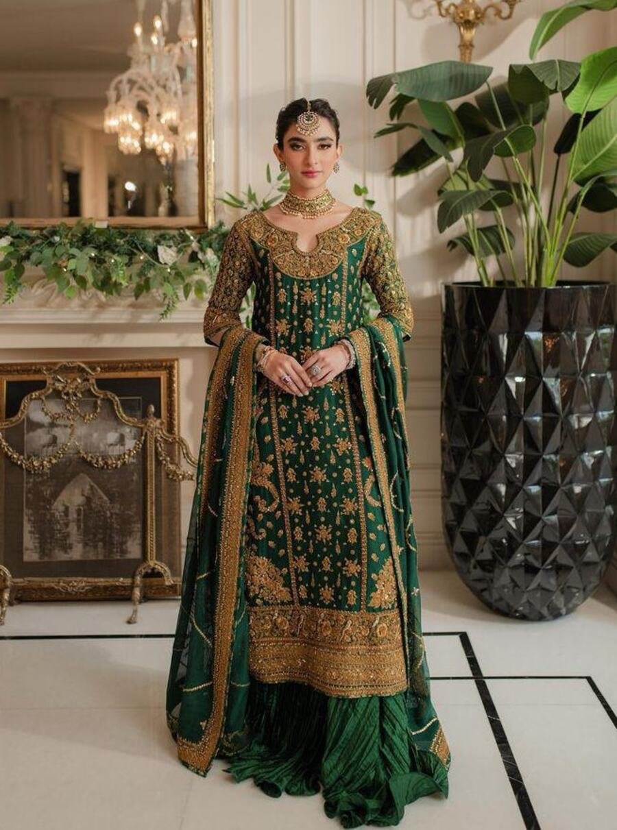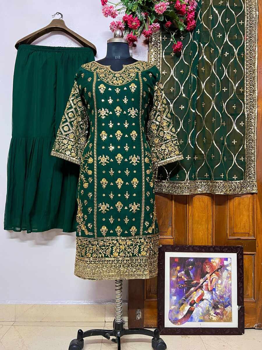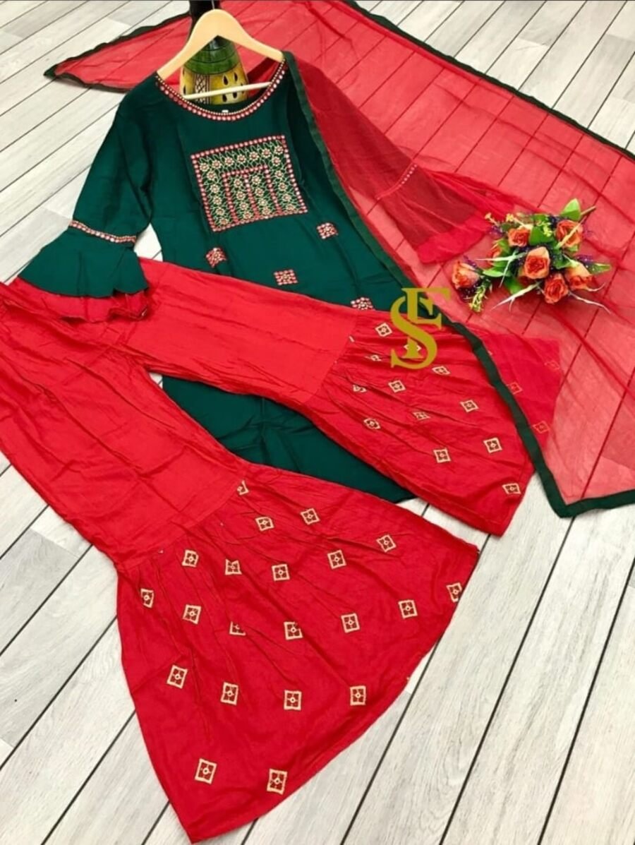 DESIGNER CHINON EMBROIDERY SEQUENCE WORK TOP SHARARA WITH DUPATTA TEAL