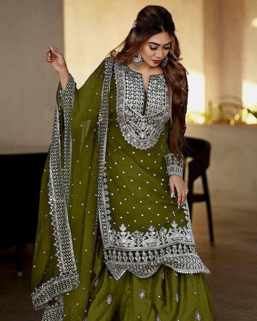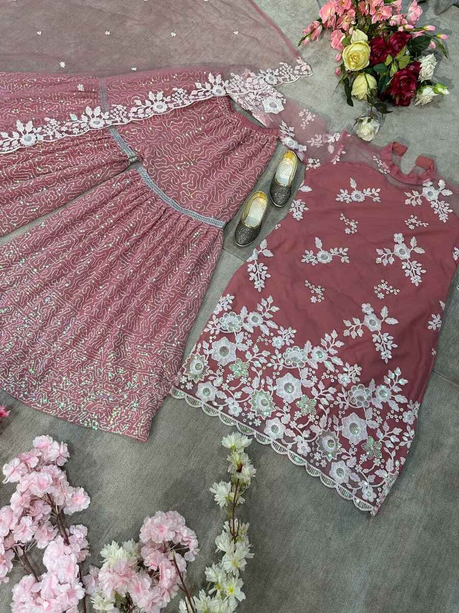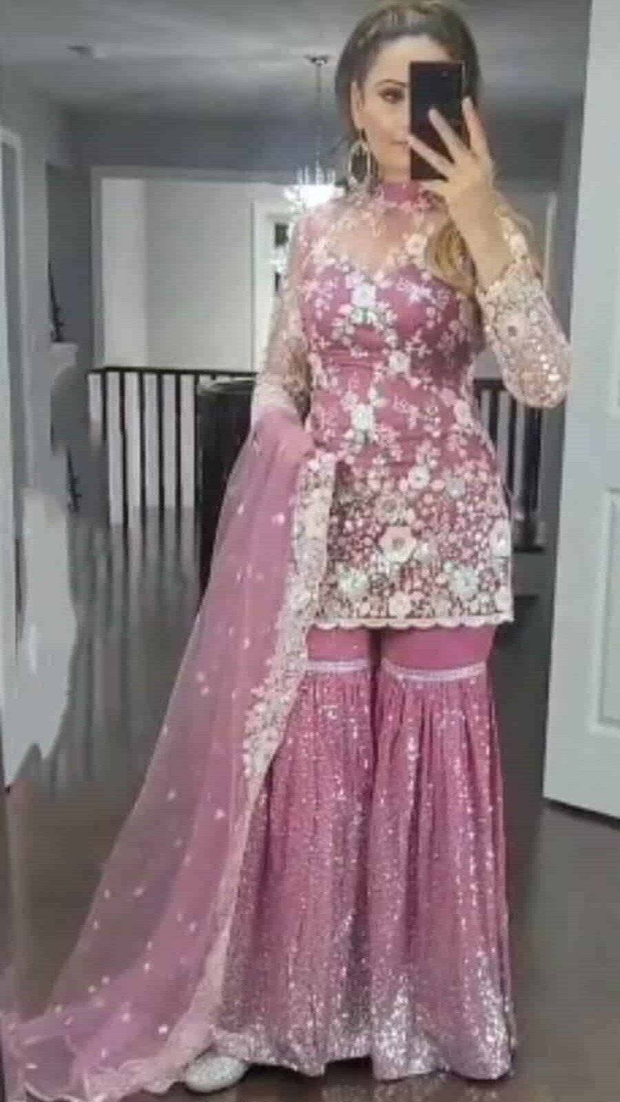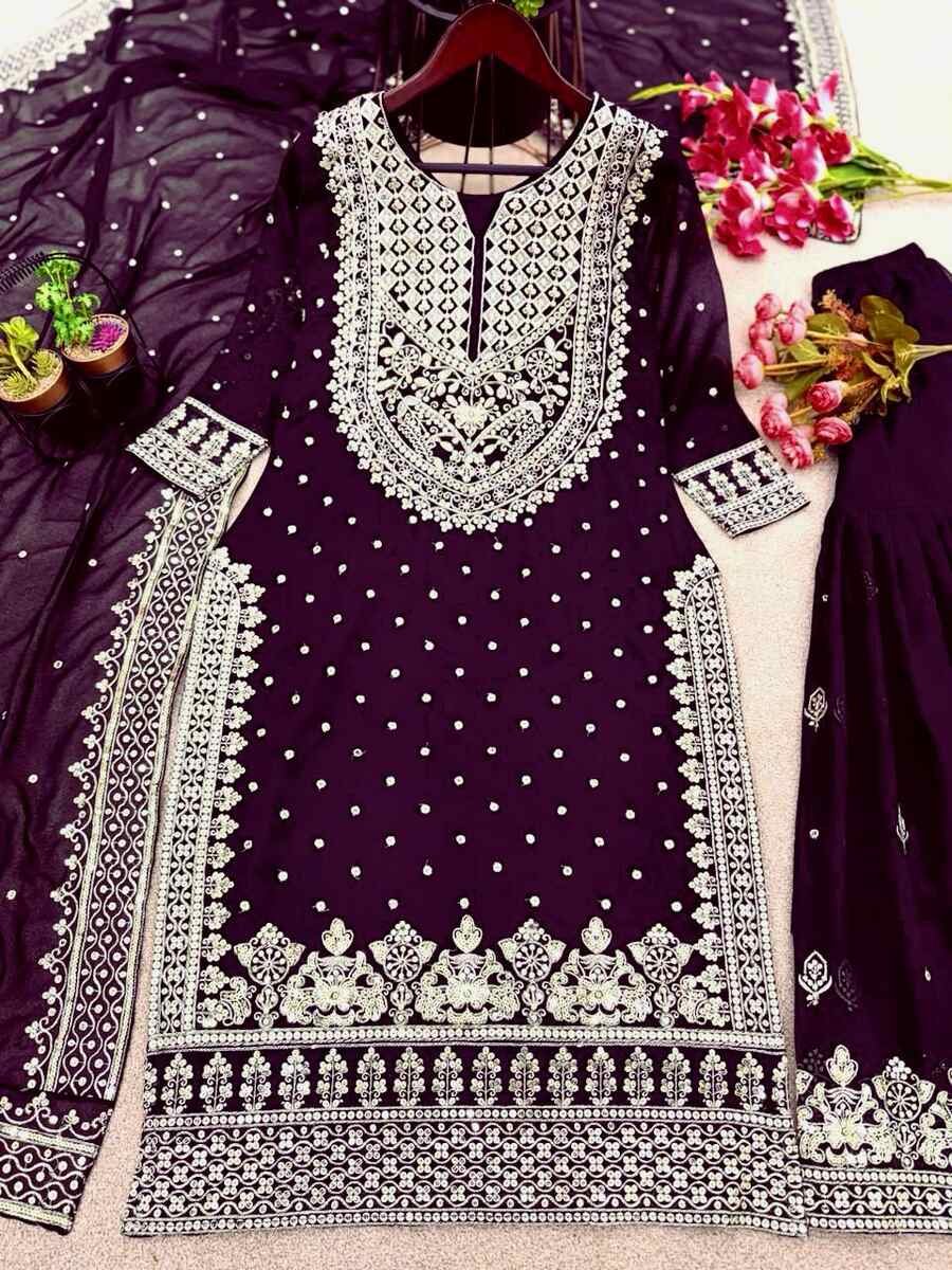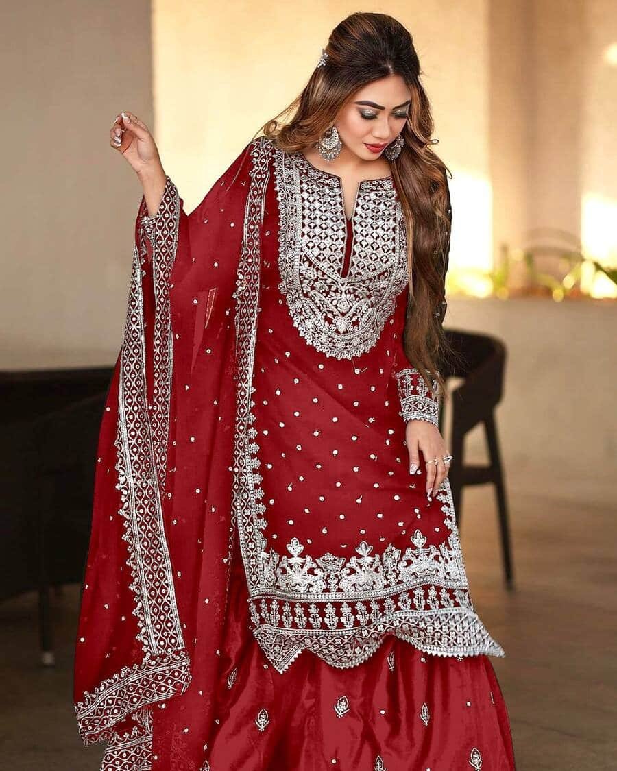 FASHIONABLE CHINON SILK CHINE SEQUENCE WORK TOP SHARARA WITH DUPATTA MAROON