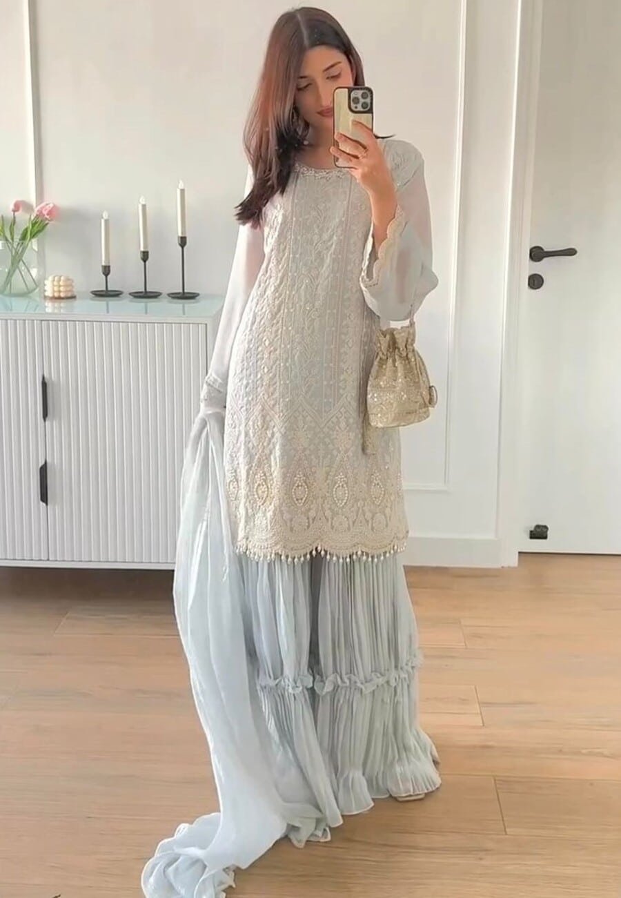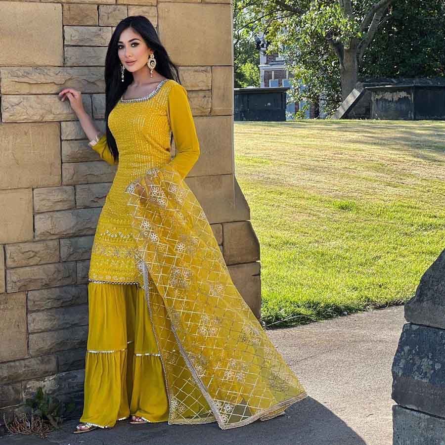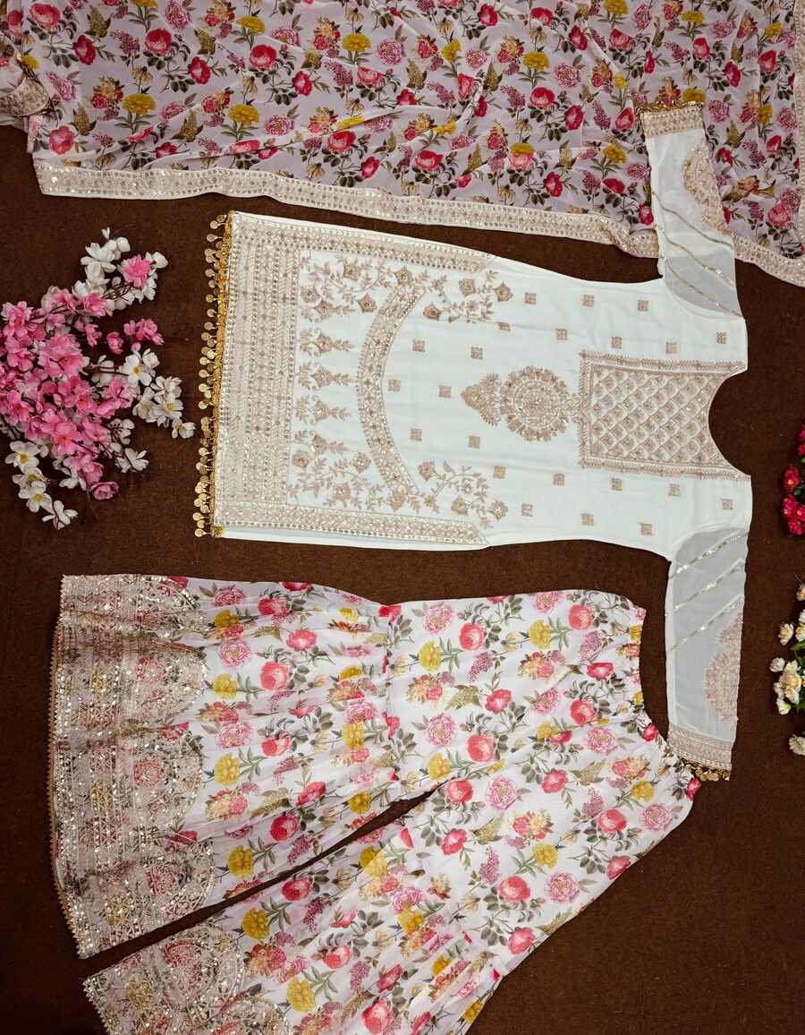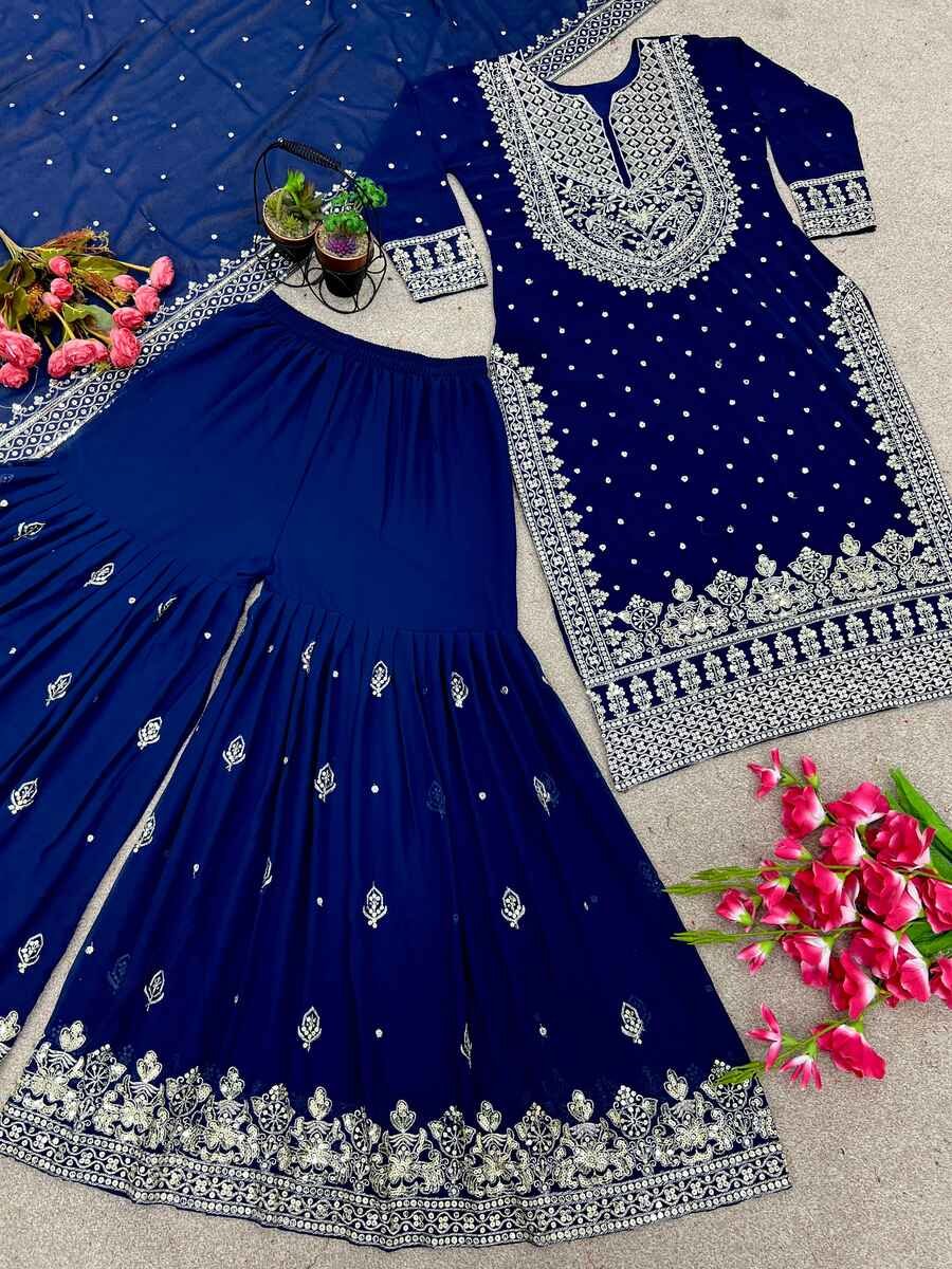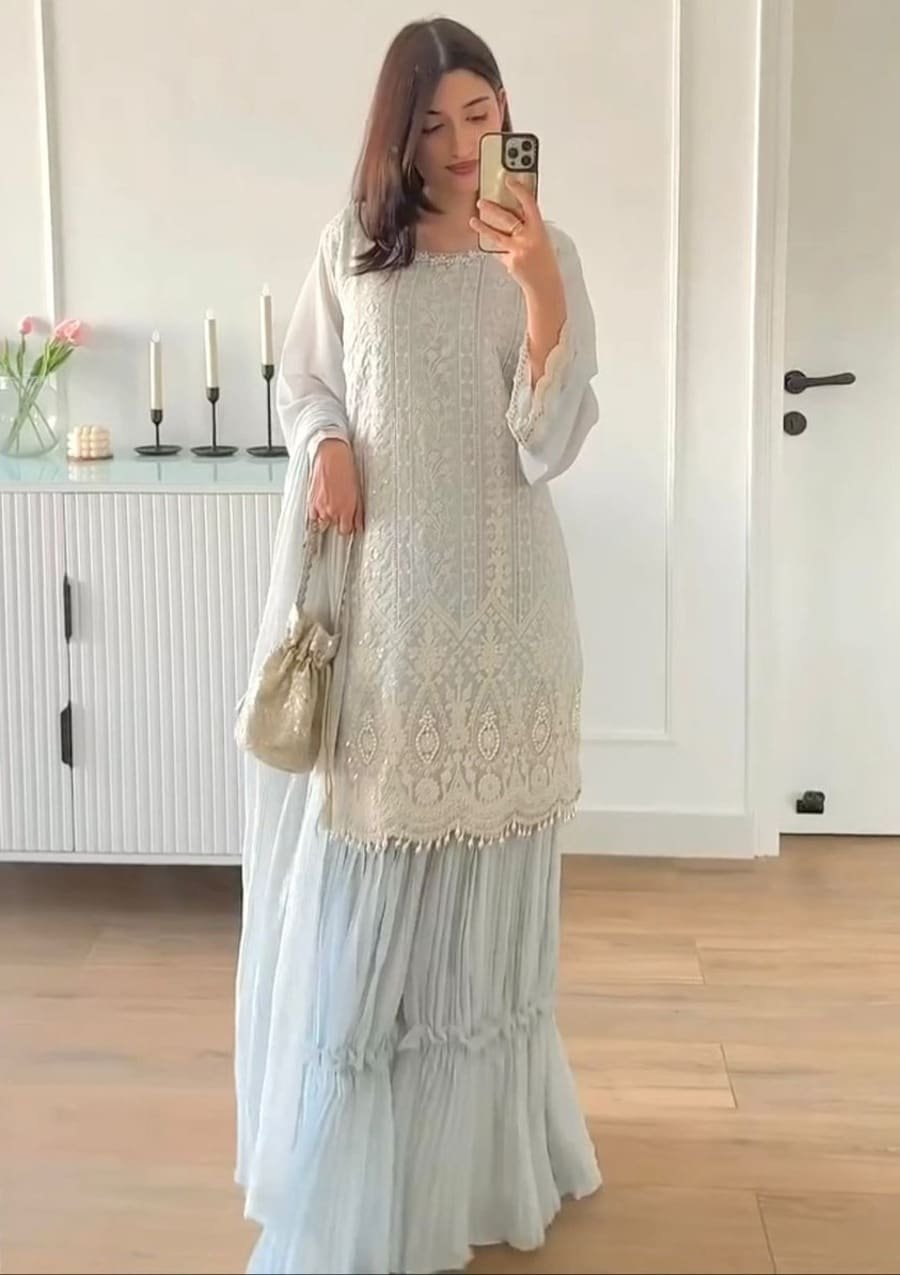 FASHIONABLE CHINON SILK CHINE SEQUENCE WORK TOP SHARARA WITH DUPATTA MAROON